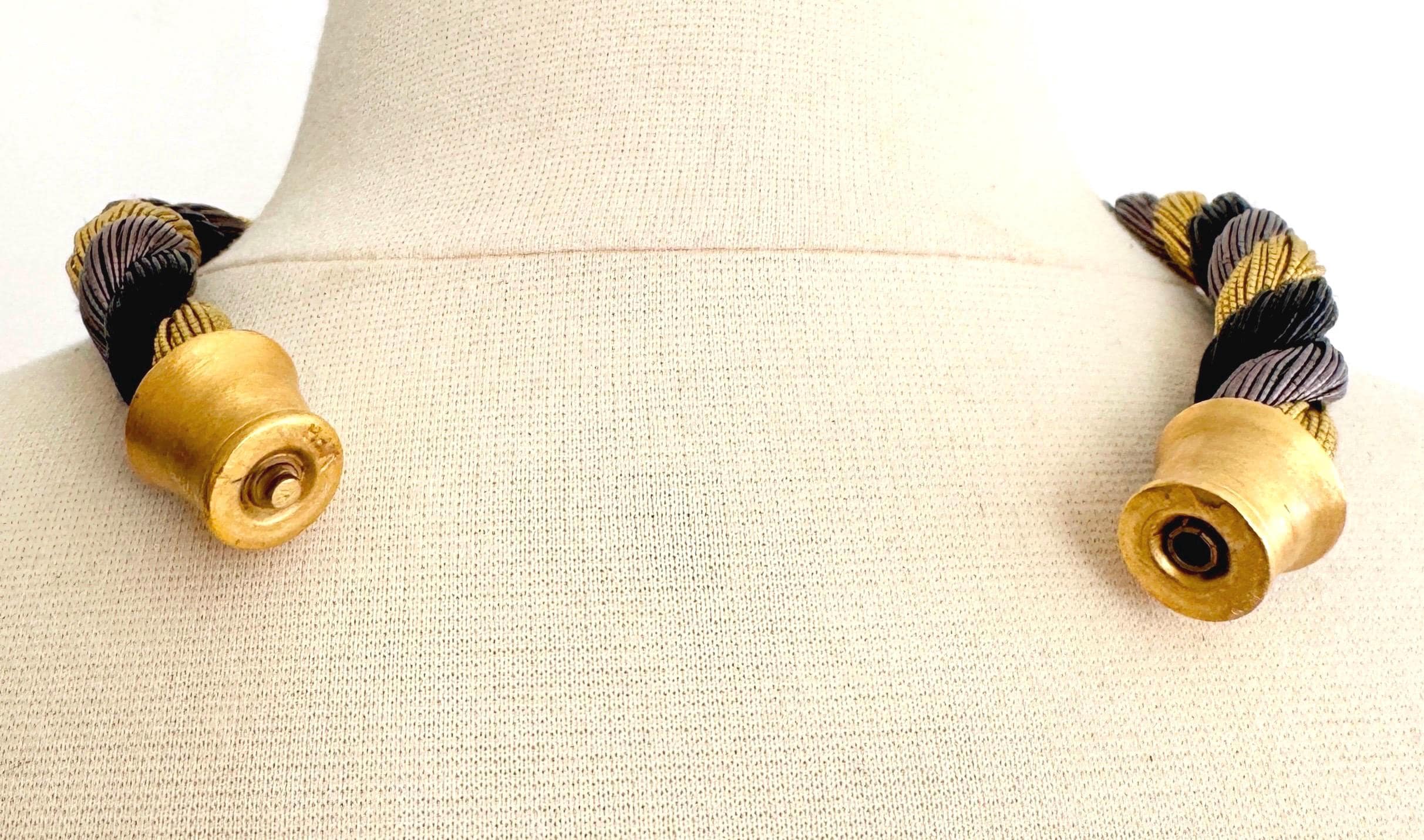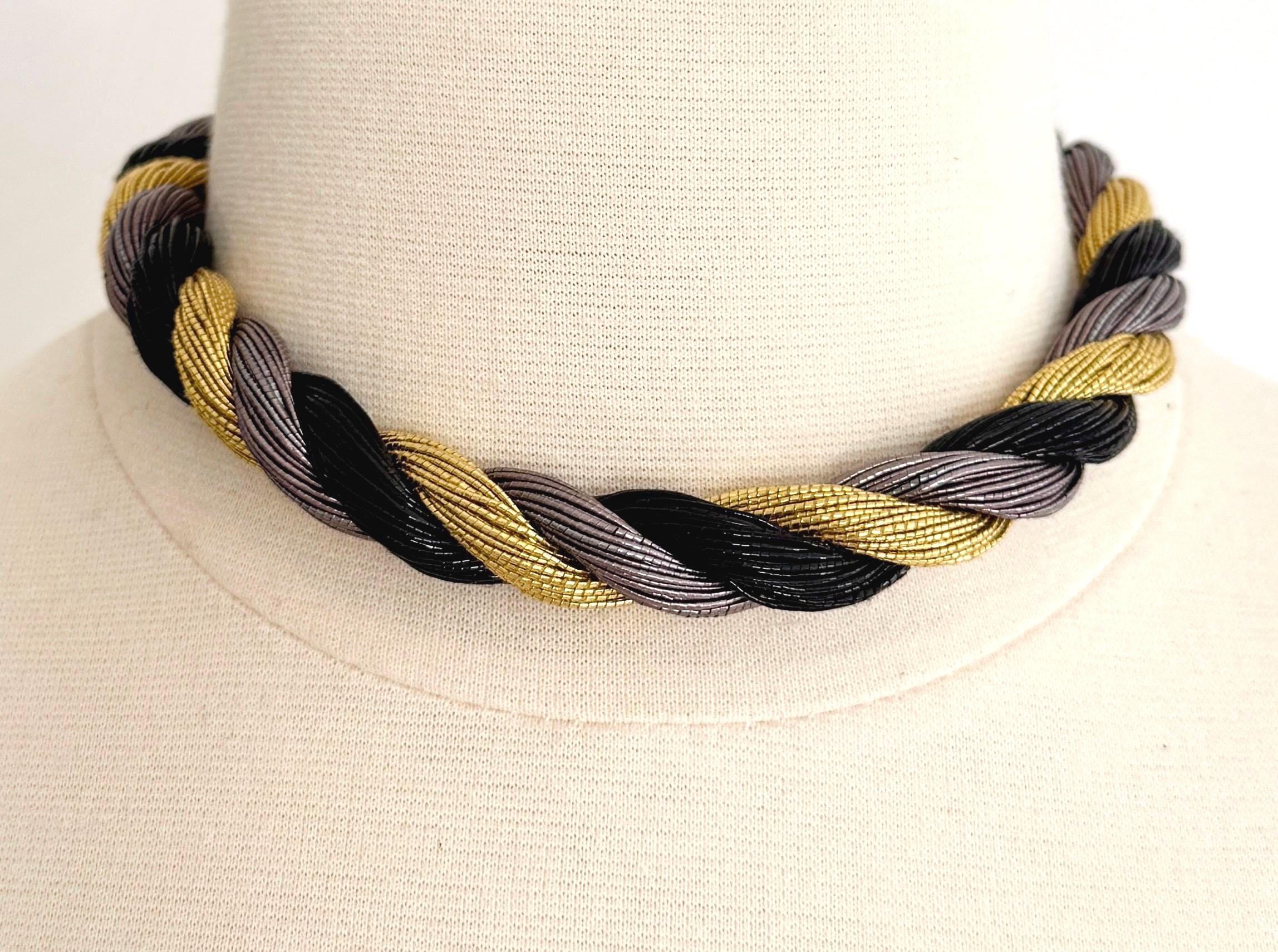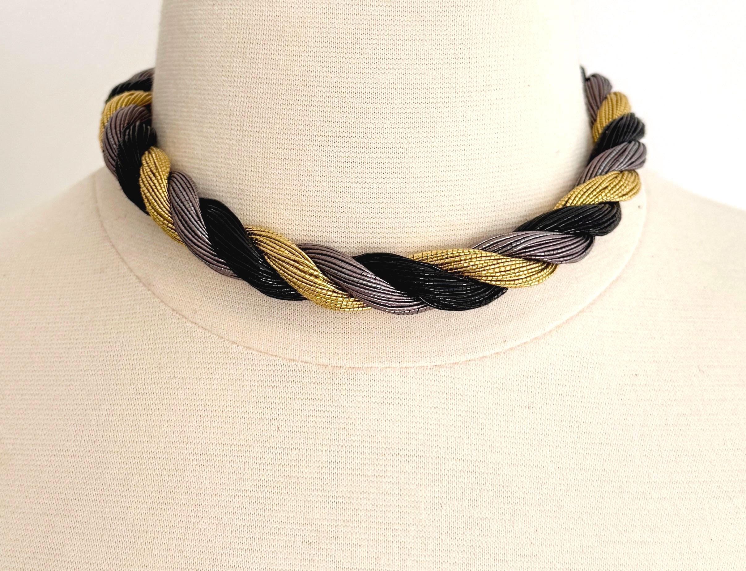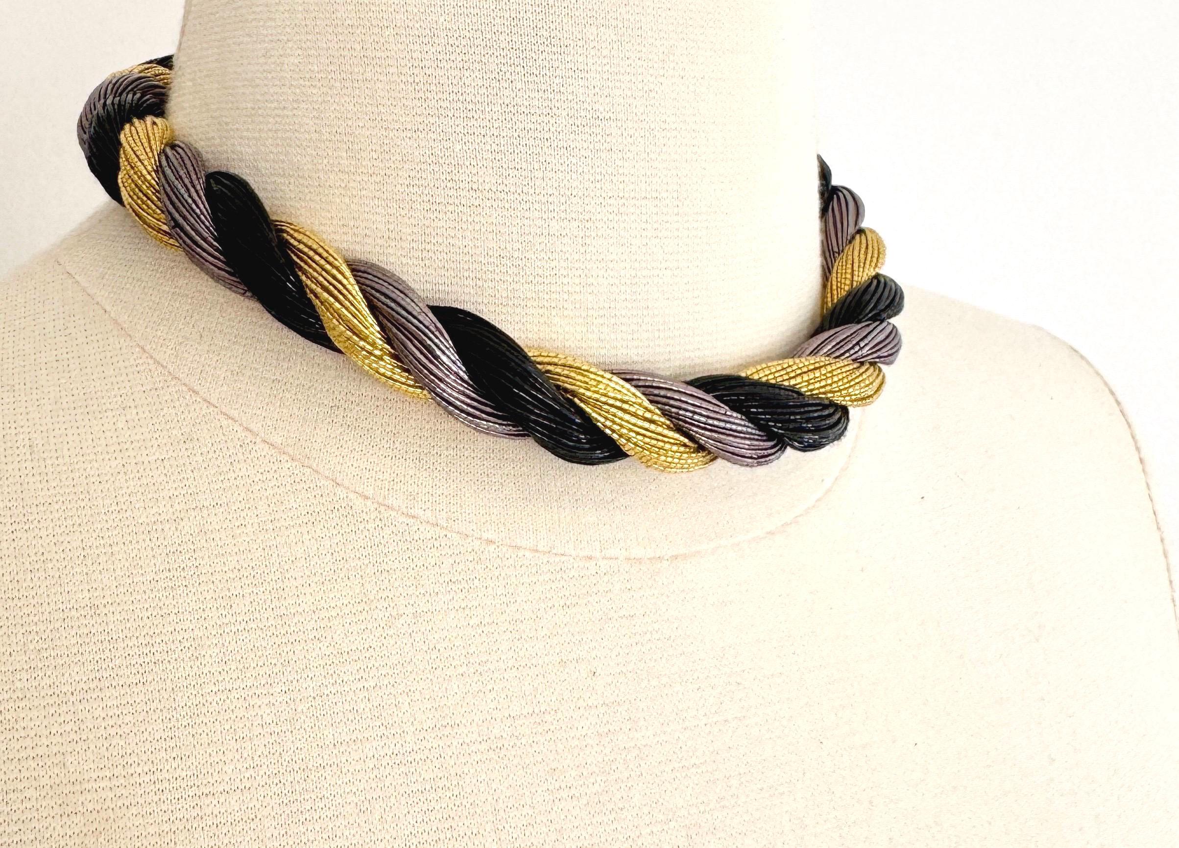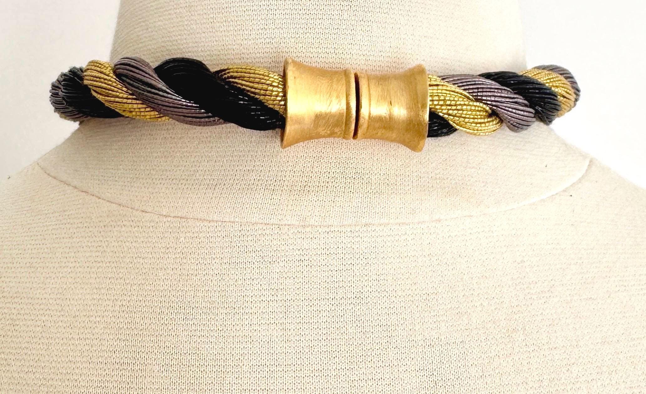 Vintage Valerie Peyton Horn twisted metallic thread choker necklace with brushed gold clasp
