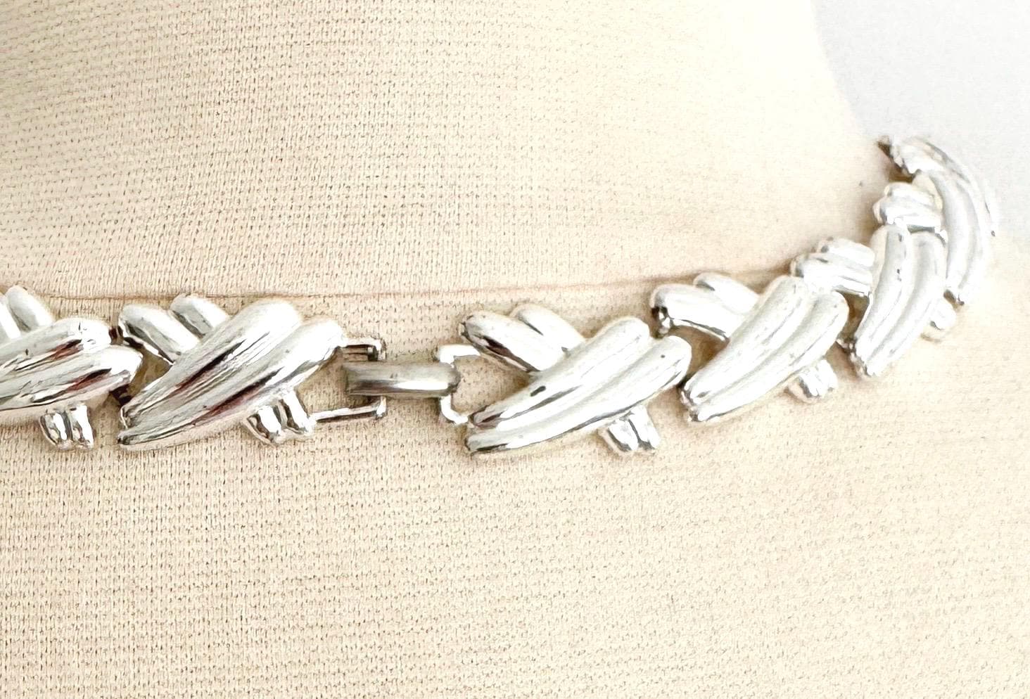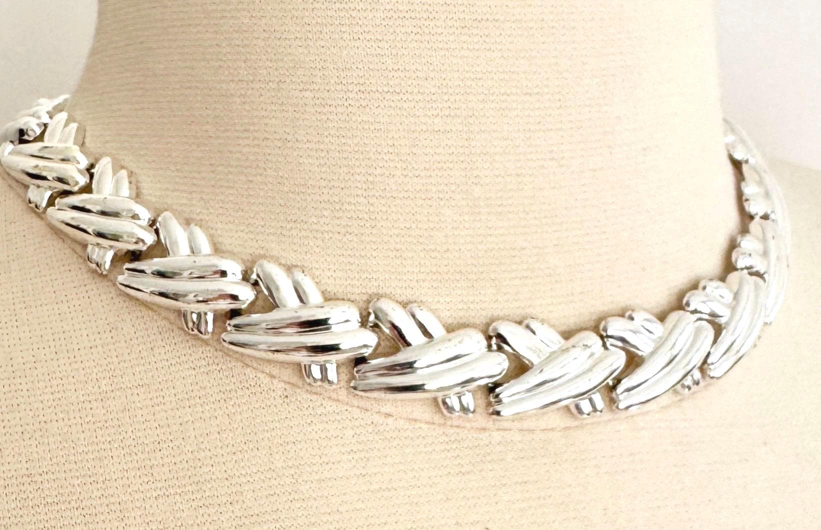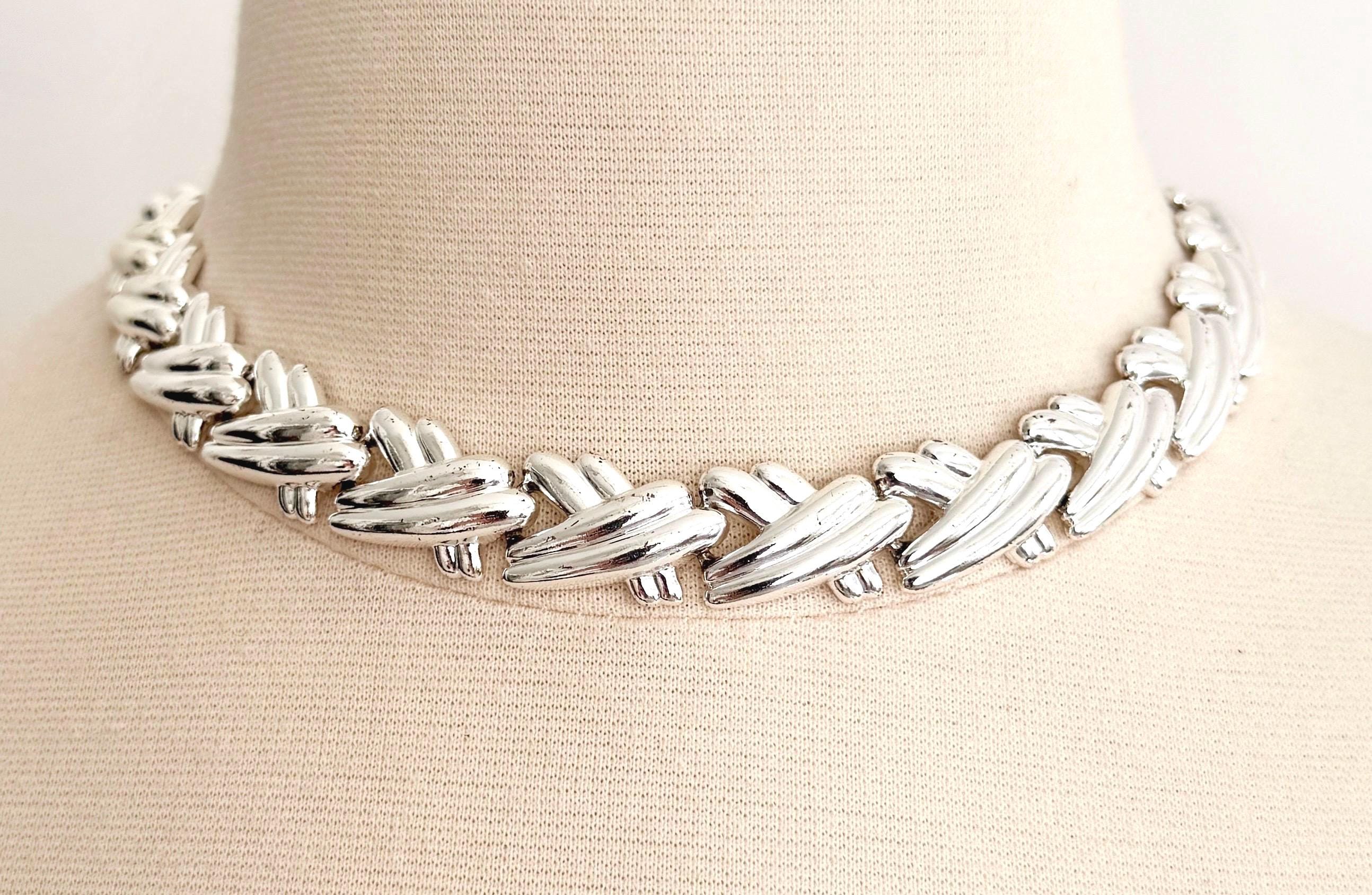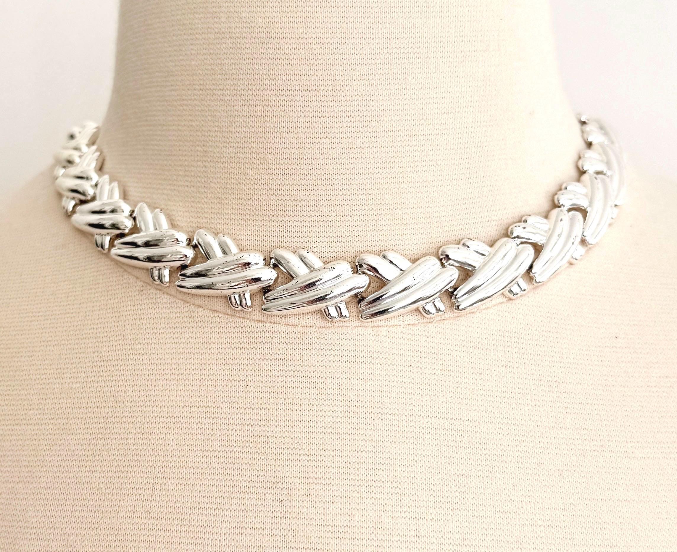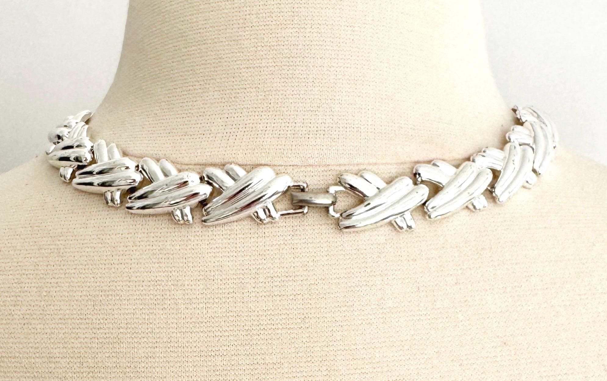 Vintage 80's silver tone metal ribbed "X" link choker necklace
