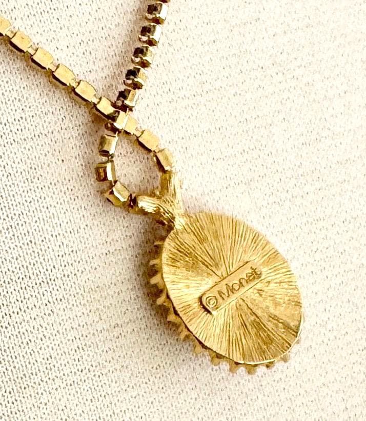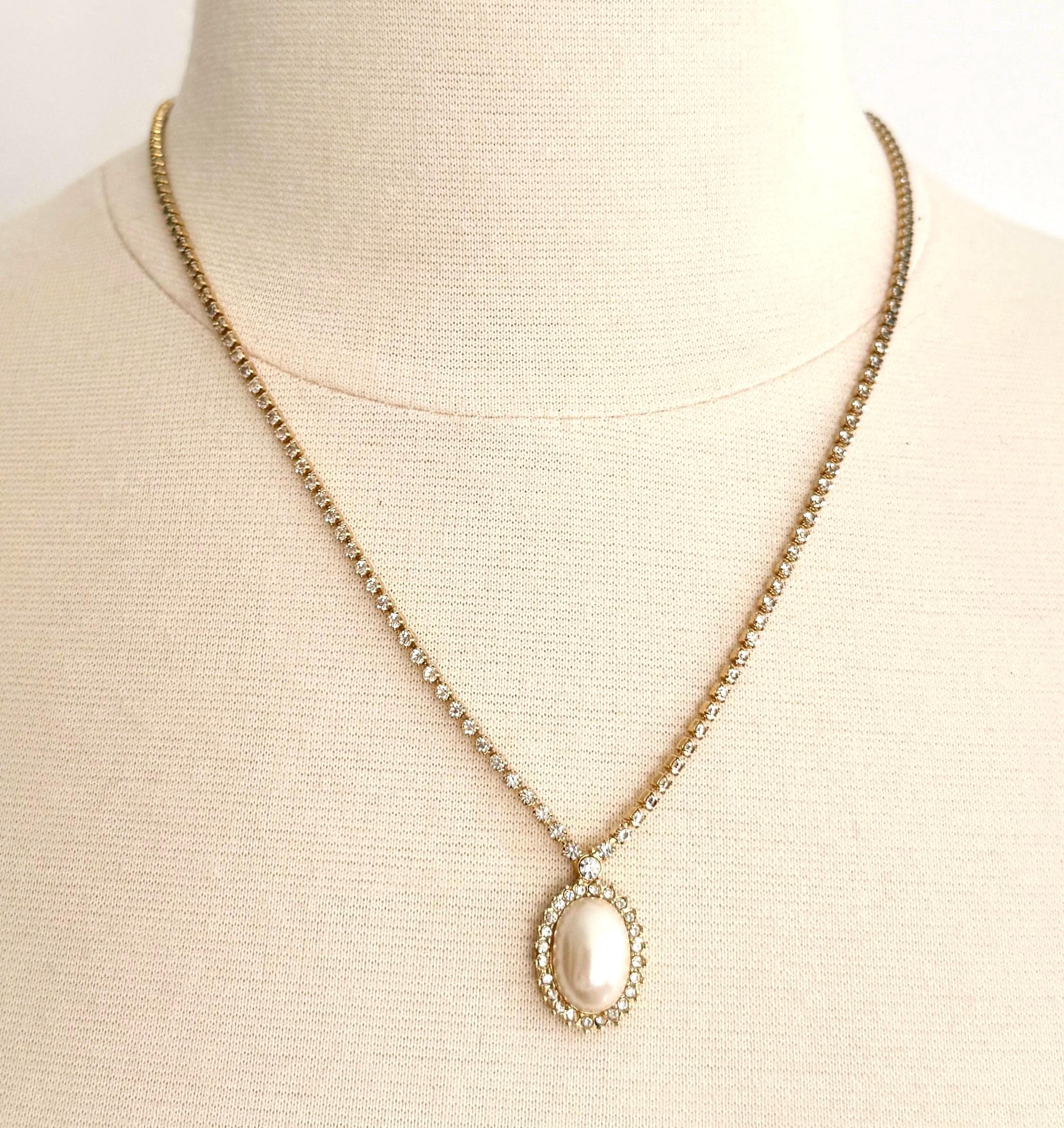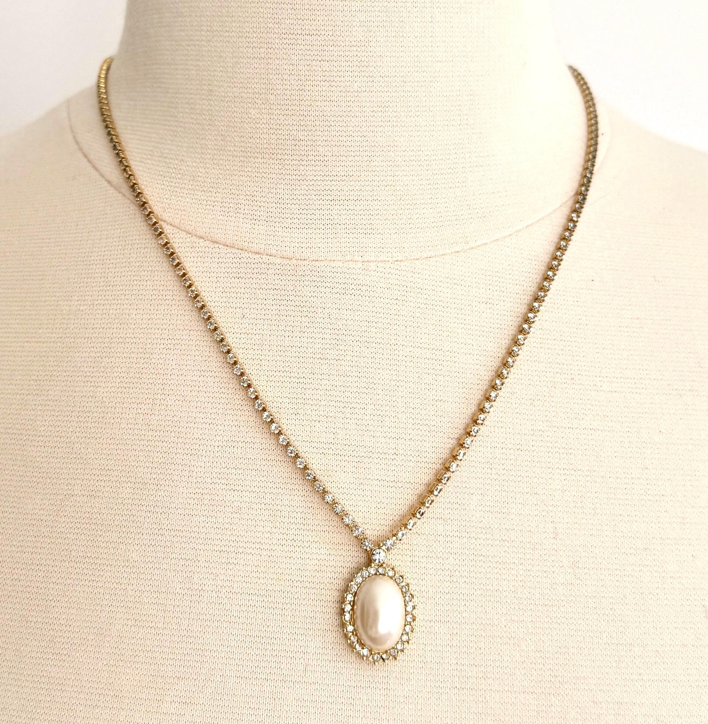 Vintage Monet gold tone and clear diamanté crystal necklace with faux pearl pendant