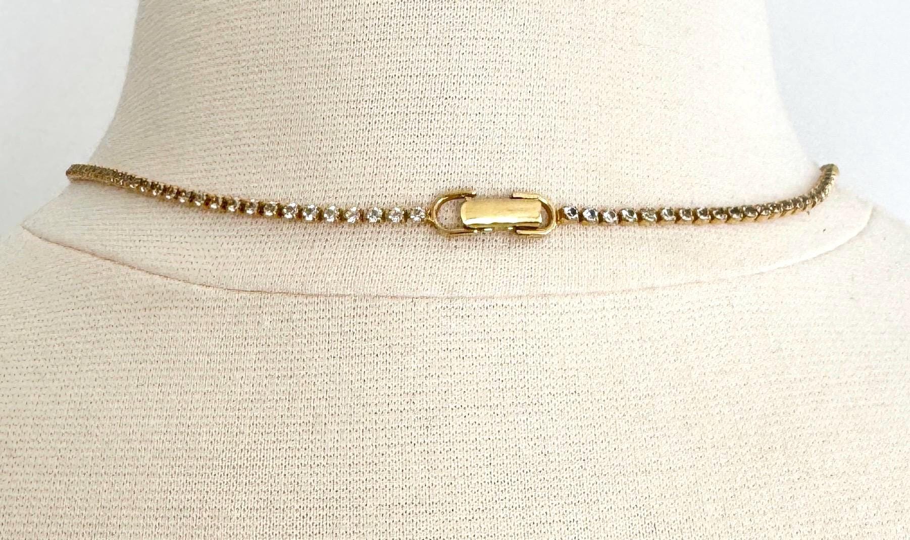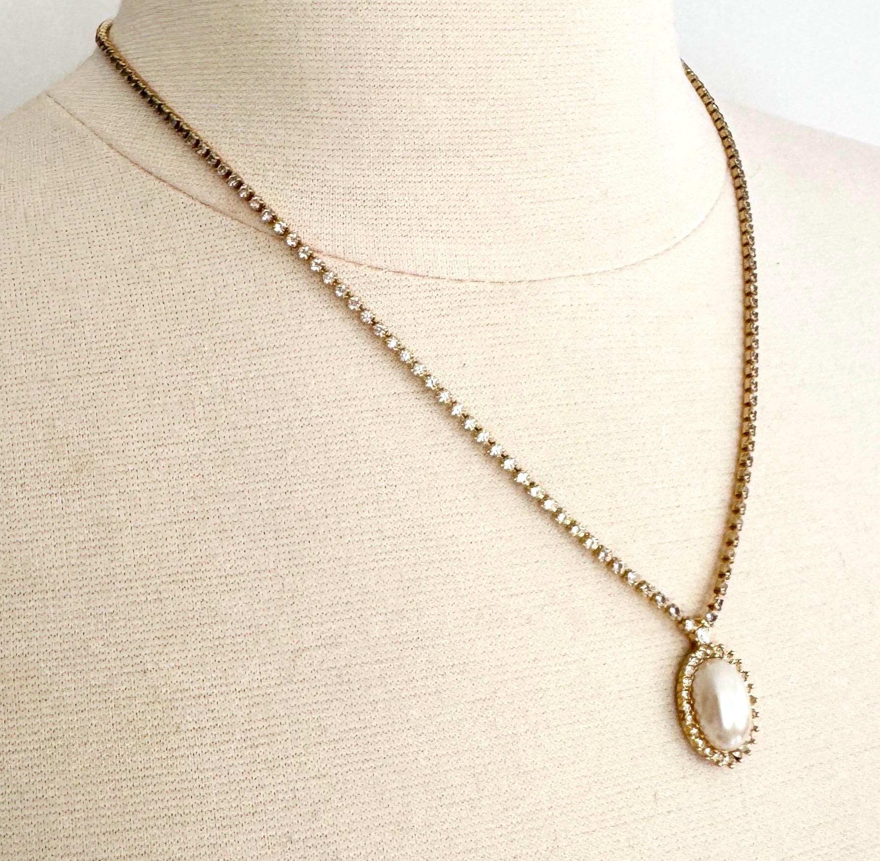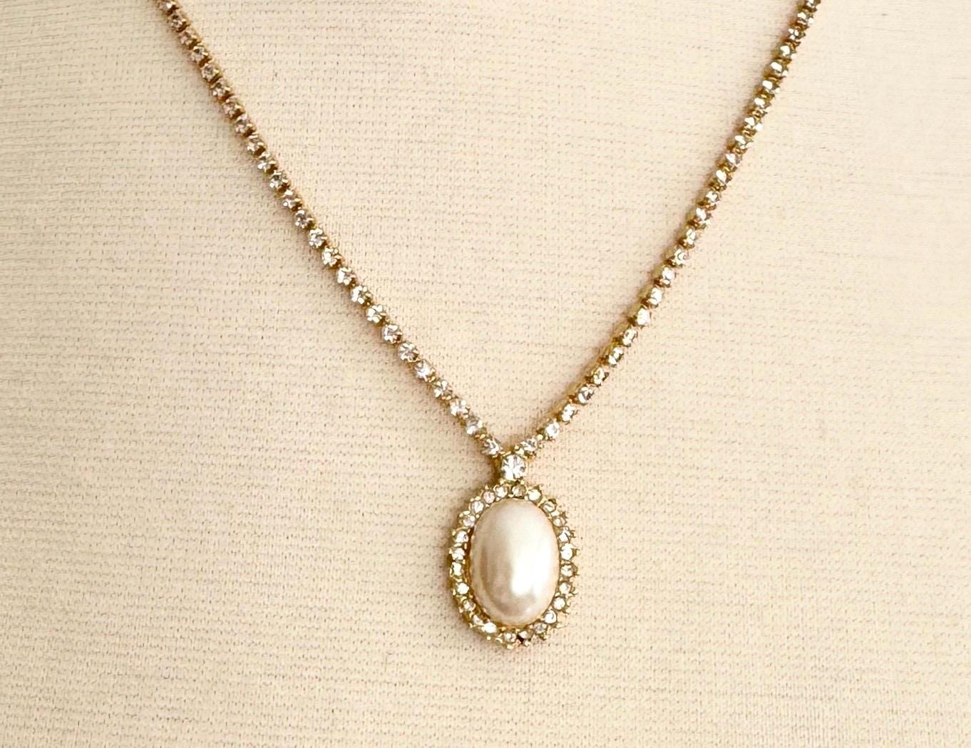 Vintage Monet gold tone and clear diamanté crystal necklace with faux pearl pendant