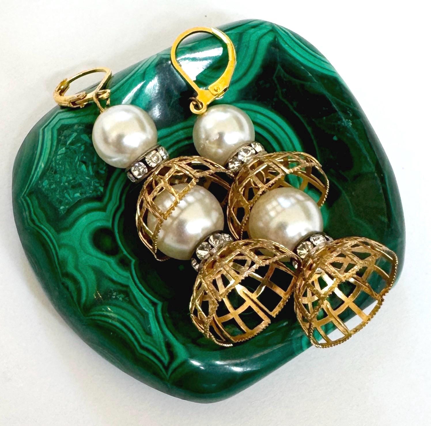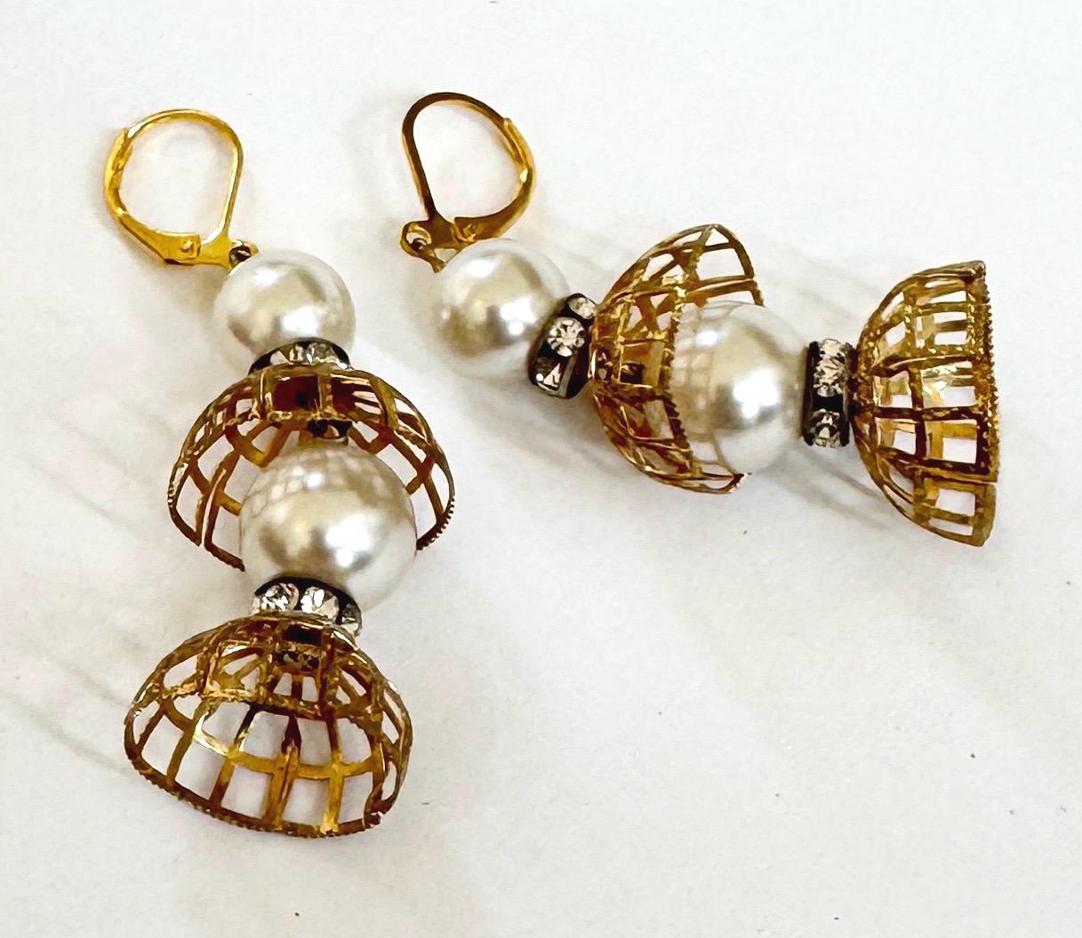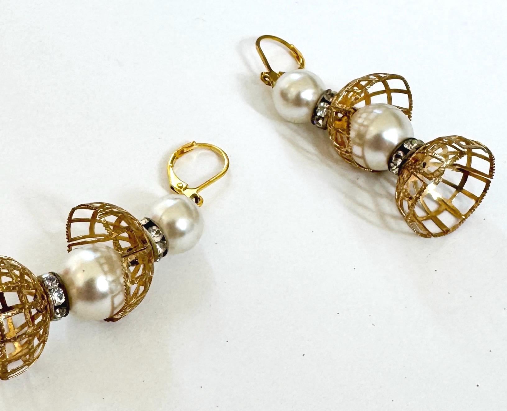 Vintage gold cage drop earrings with faux pearl and clear diamanté crystal accents