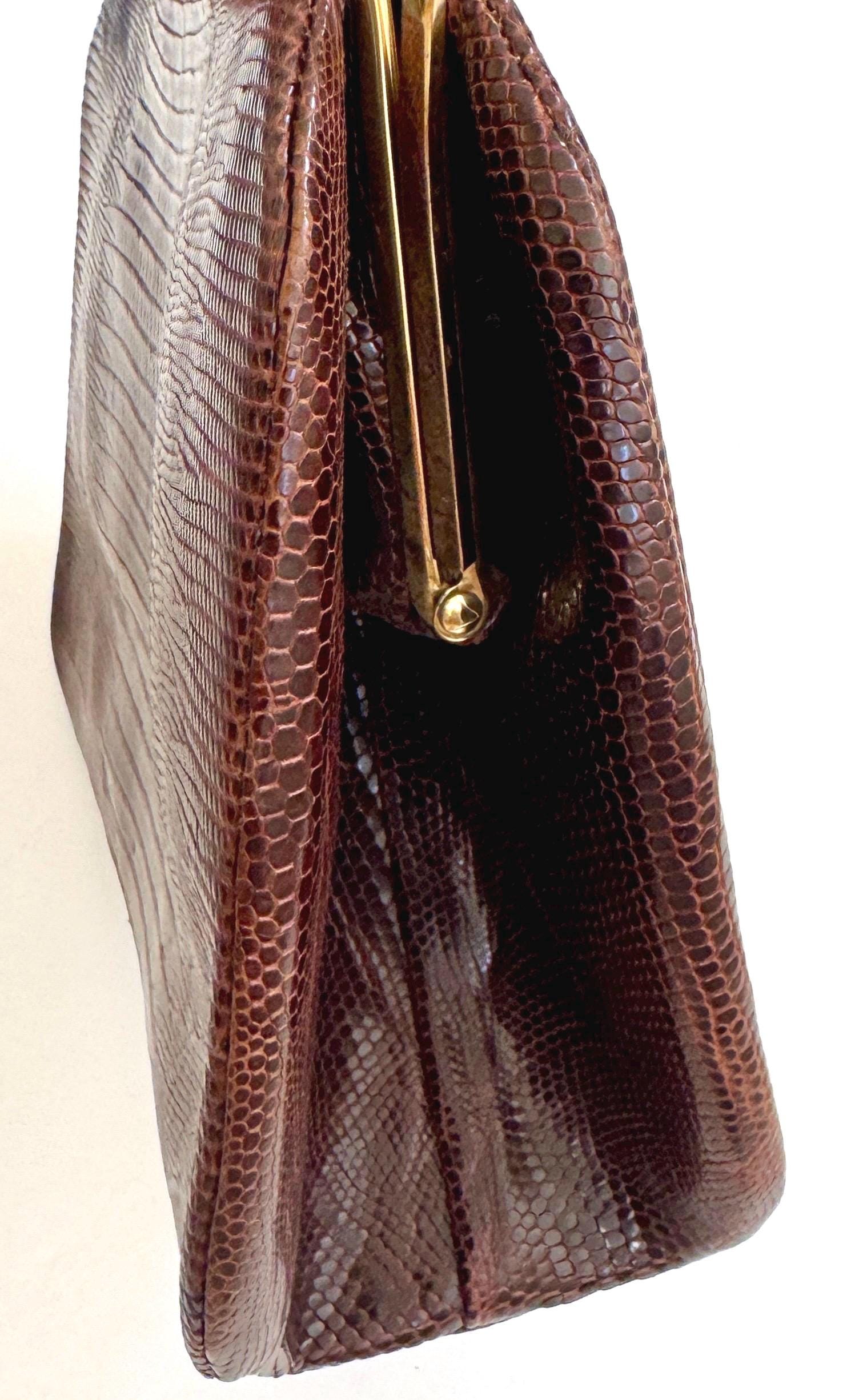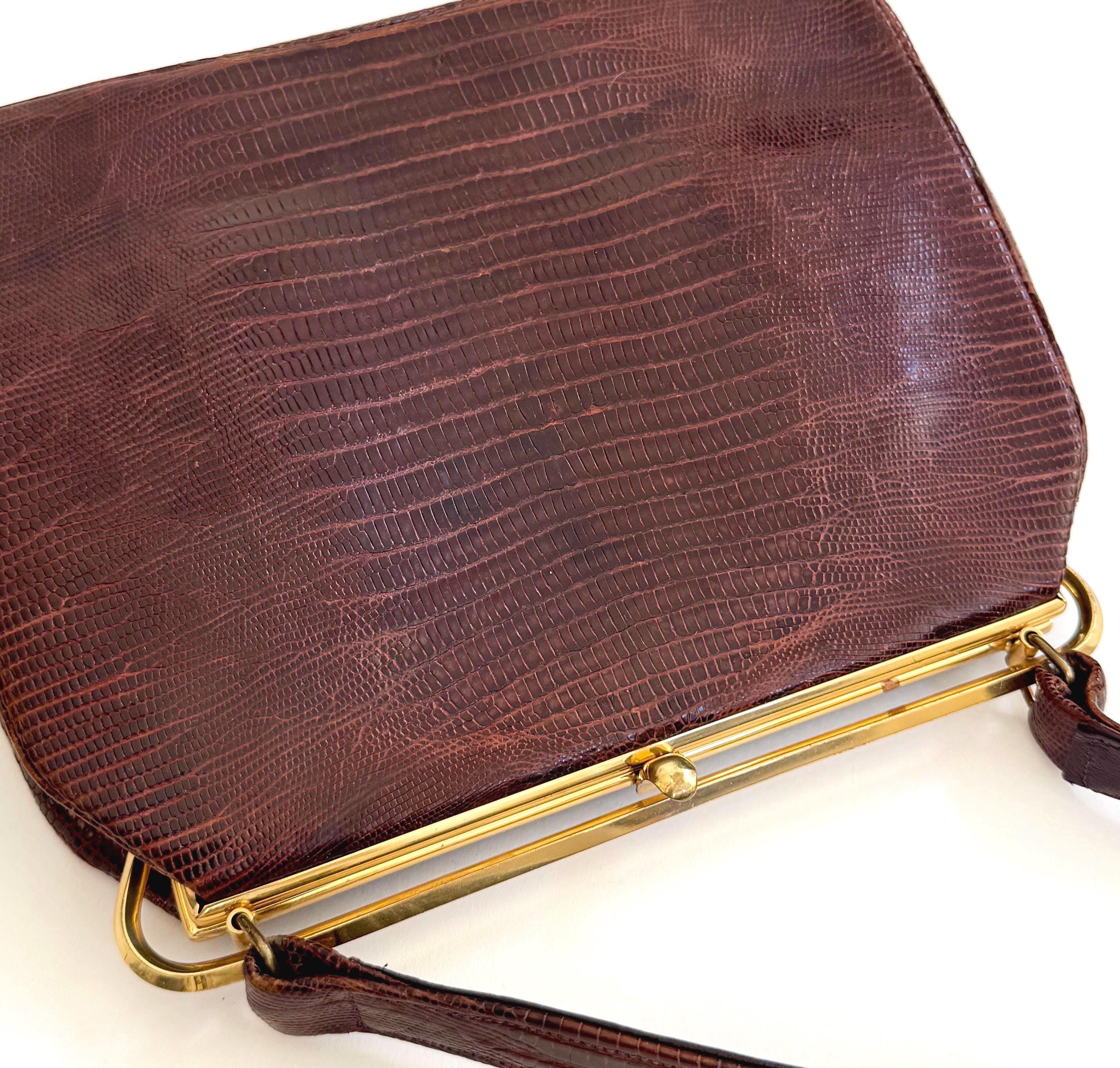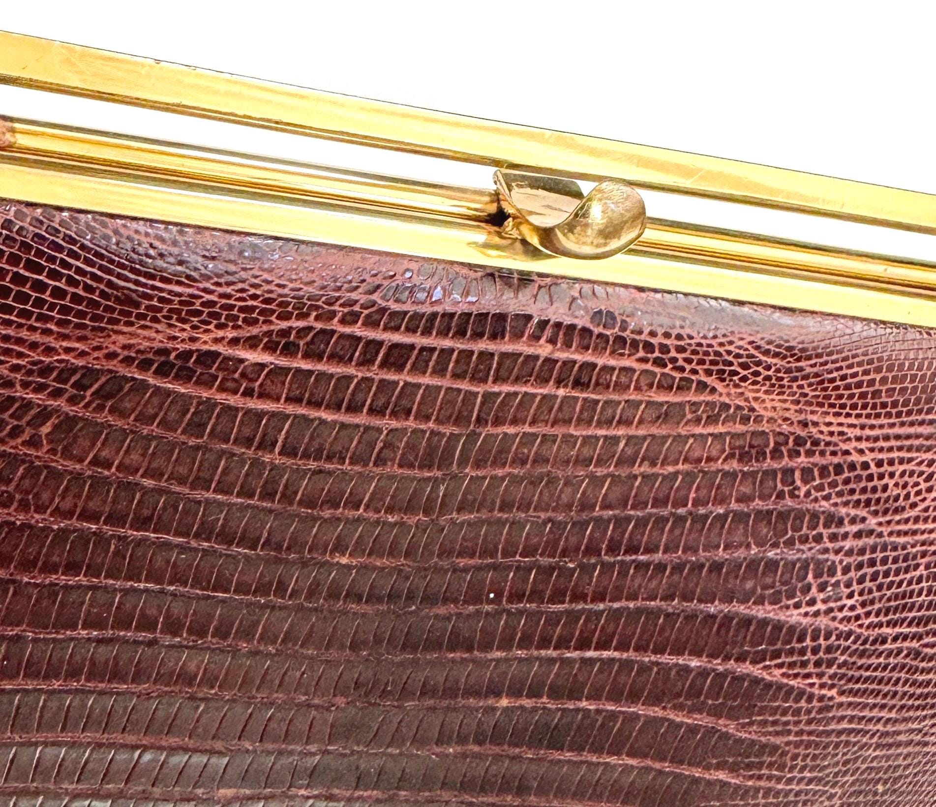 Glossy Mid Century vintage chocolate brown lizard bag with gold tone frame and claps