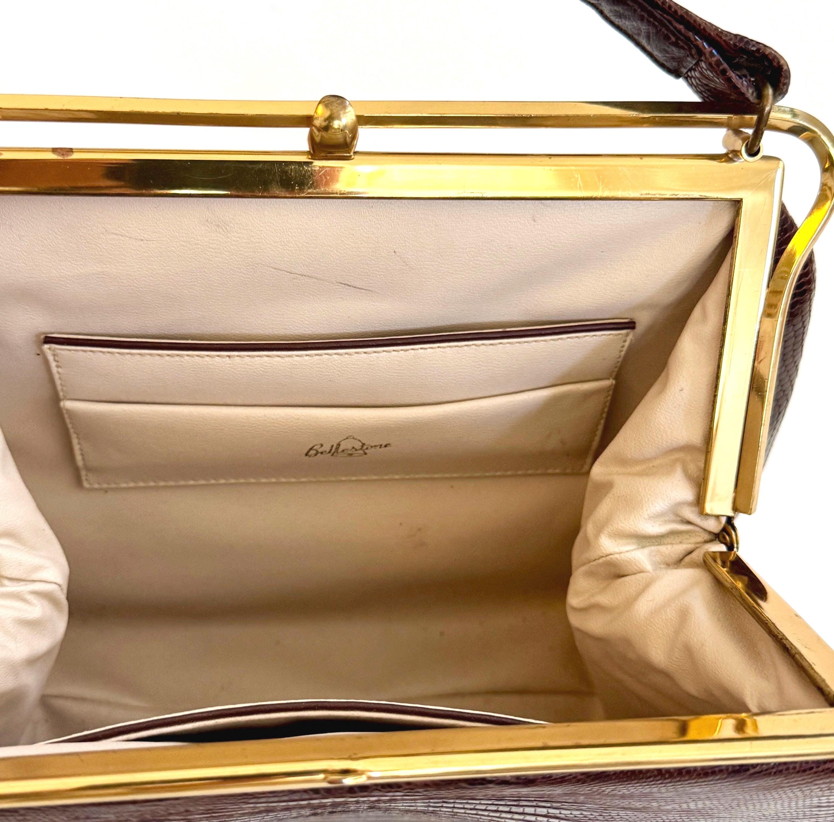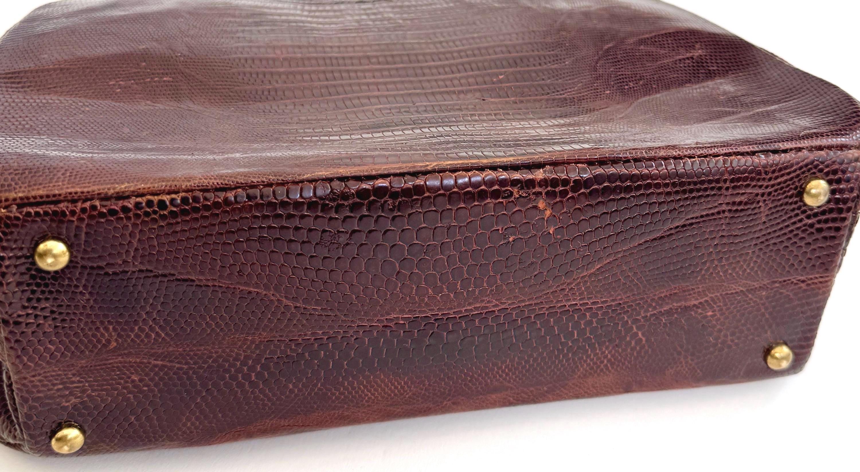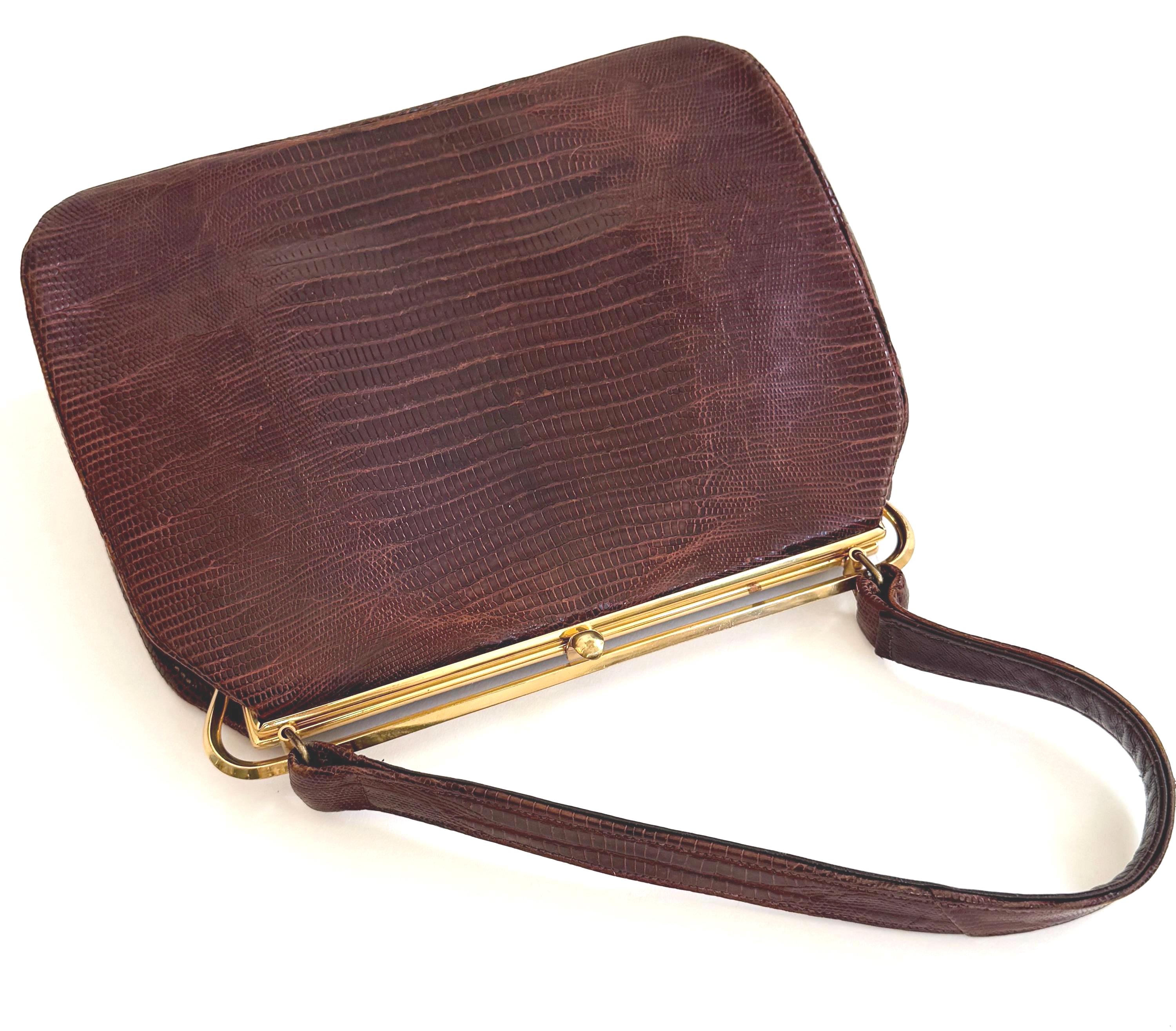Glossy Mid Century vintage chocolate brown lizard bag with gold tone frame and claps