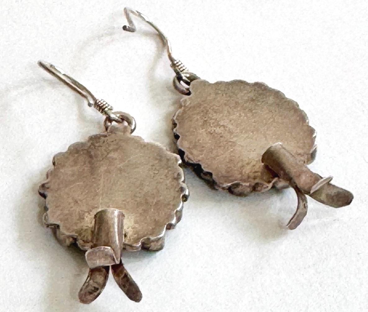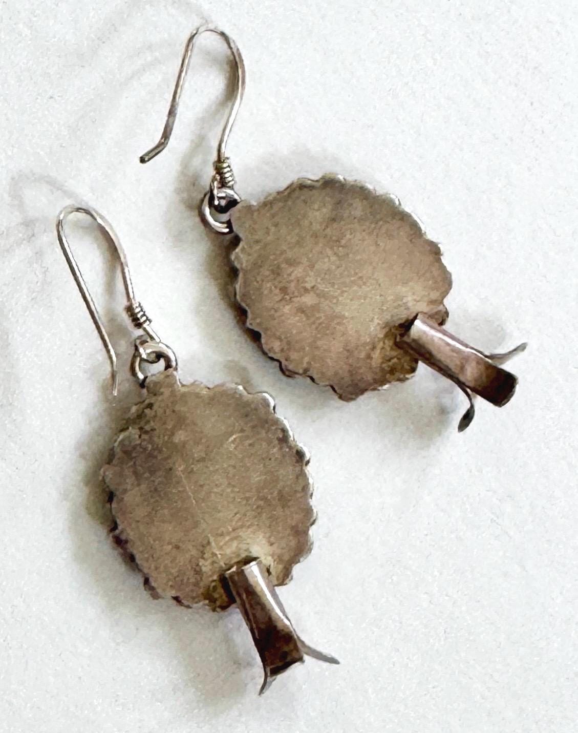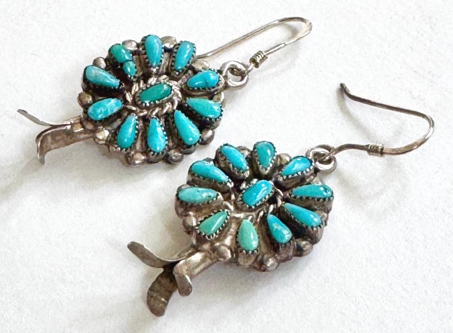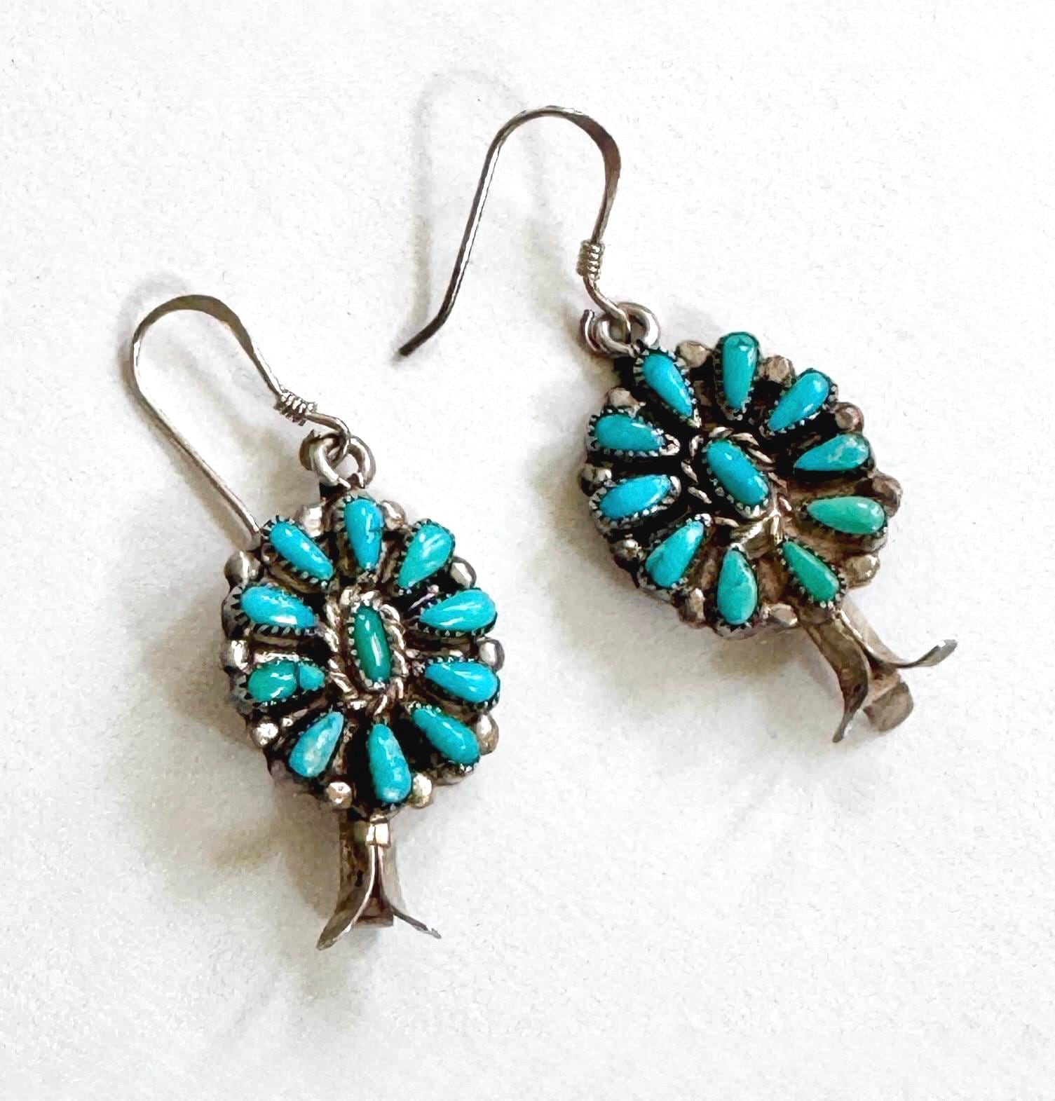 Vintage Native American Zuni sterling silver squash blossom drop earrings with delicate needlepoint set turquoise stones