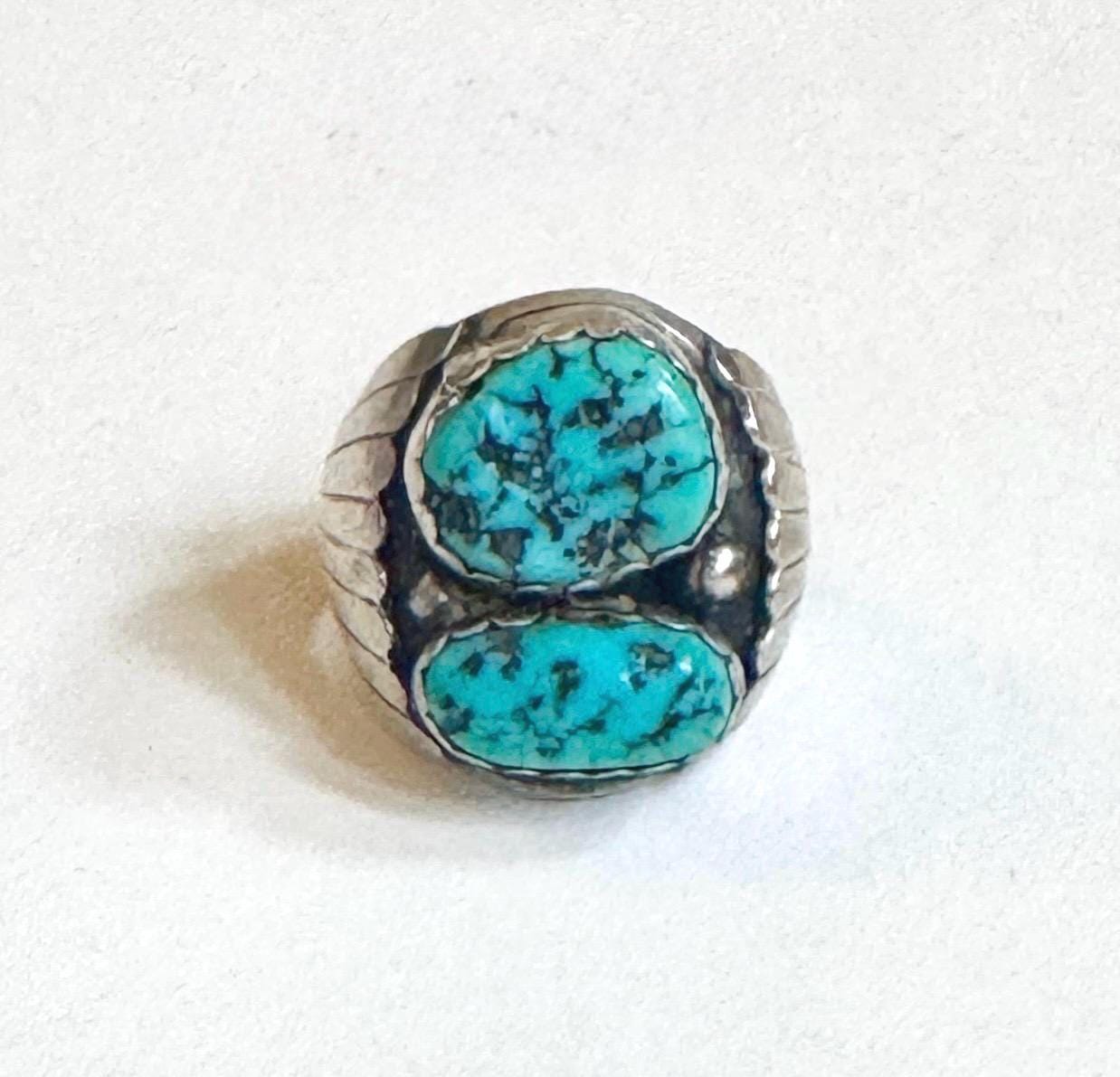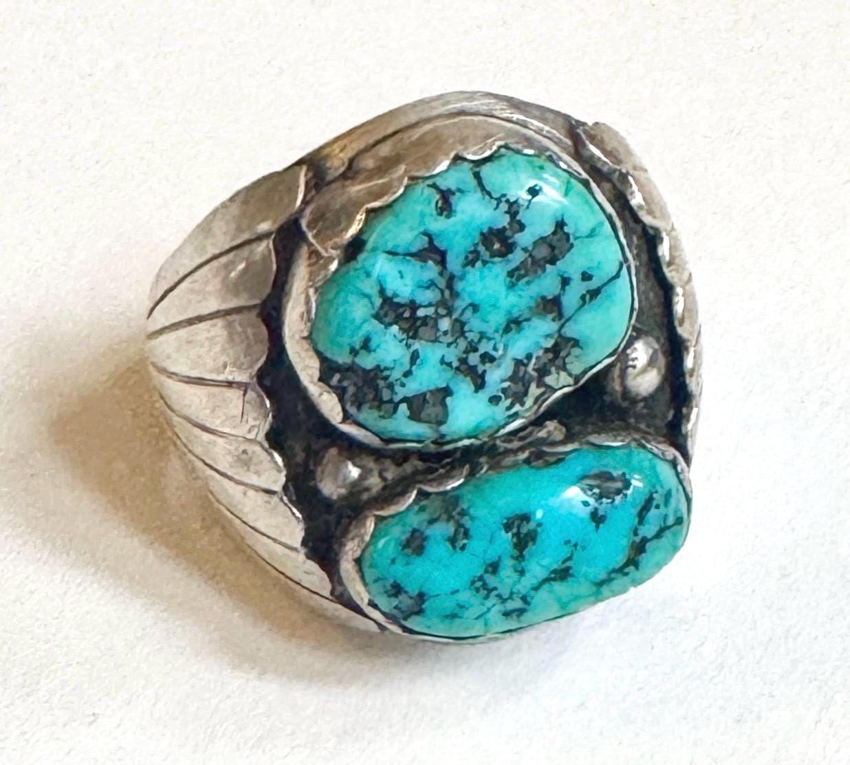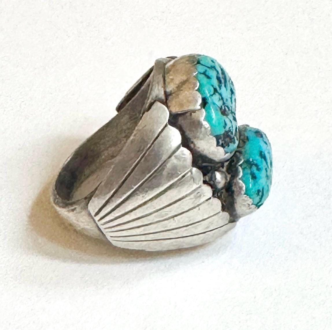 Heavy and very solidly crafted vintage Native American Navajo handcrafted sterling silver ring with two Kingman turquoise stones