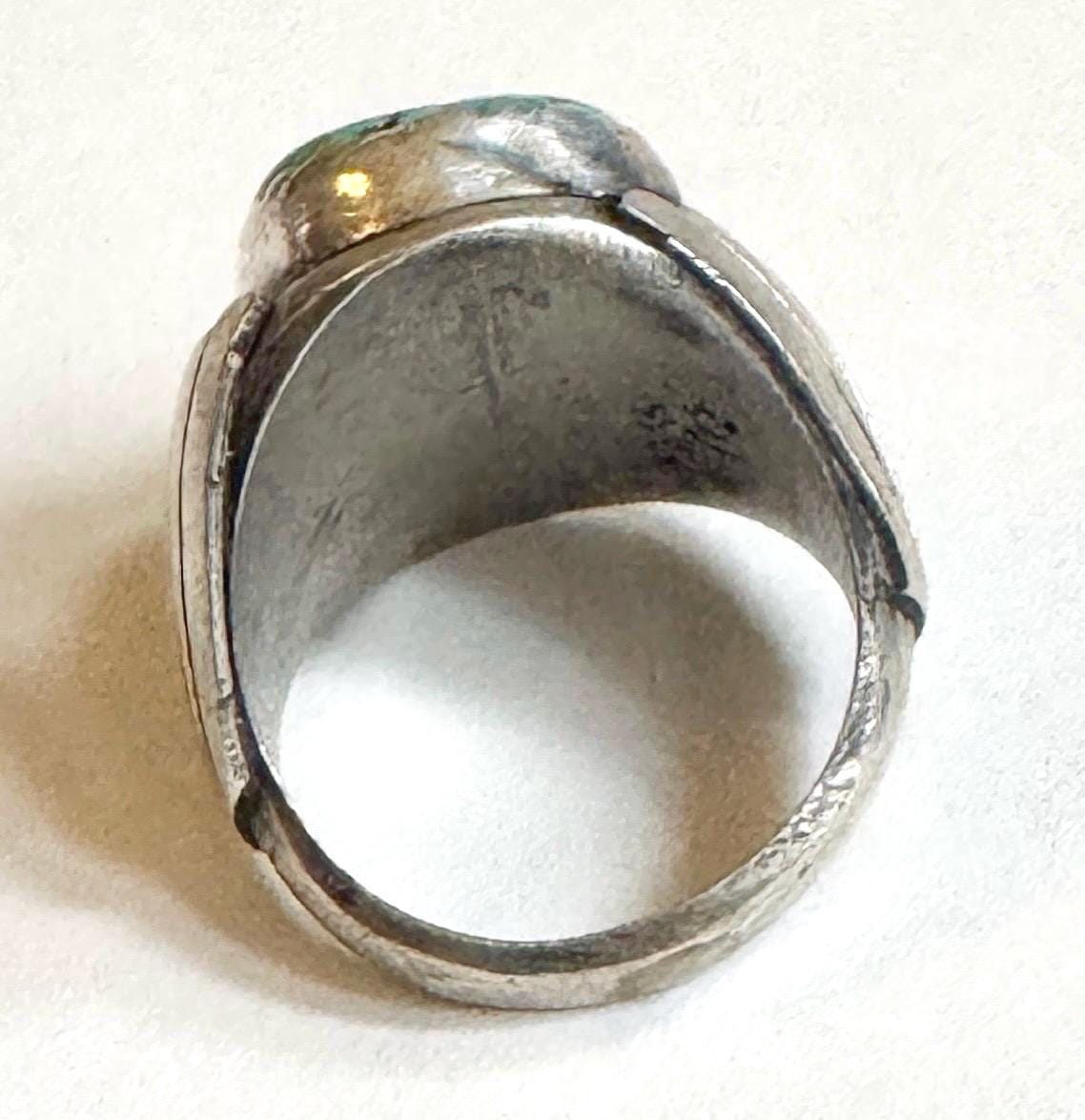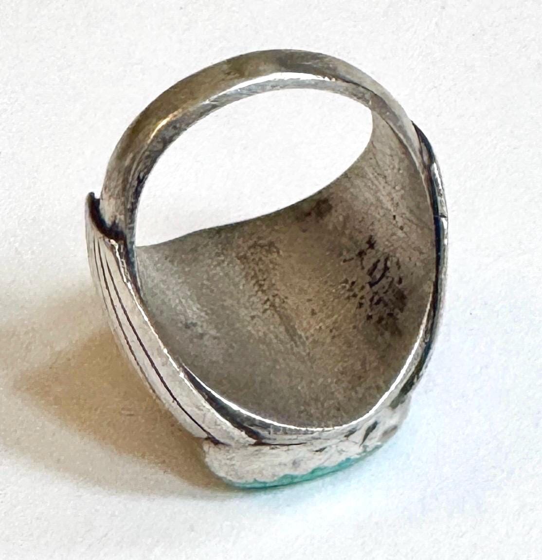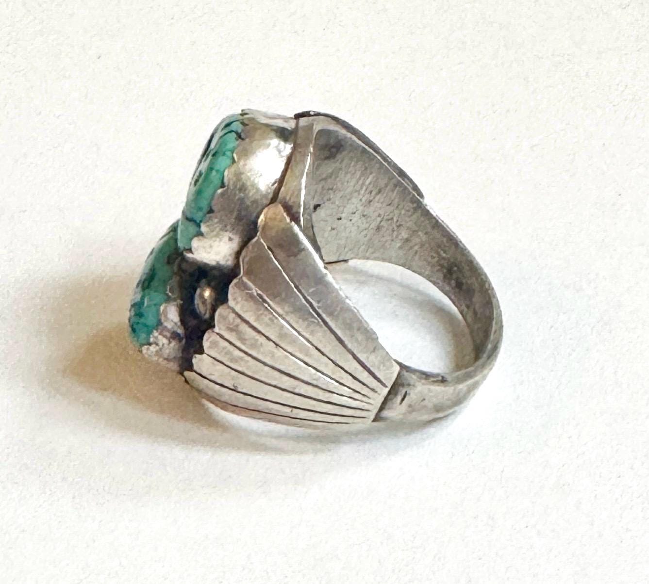 Heavy and very solidly crafted vintage Native American Navajo handcrafted sterling silver ring with two Kingman turquoise stones