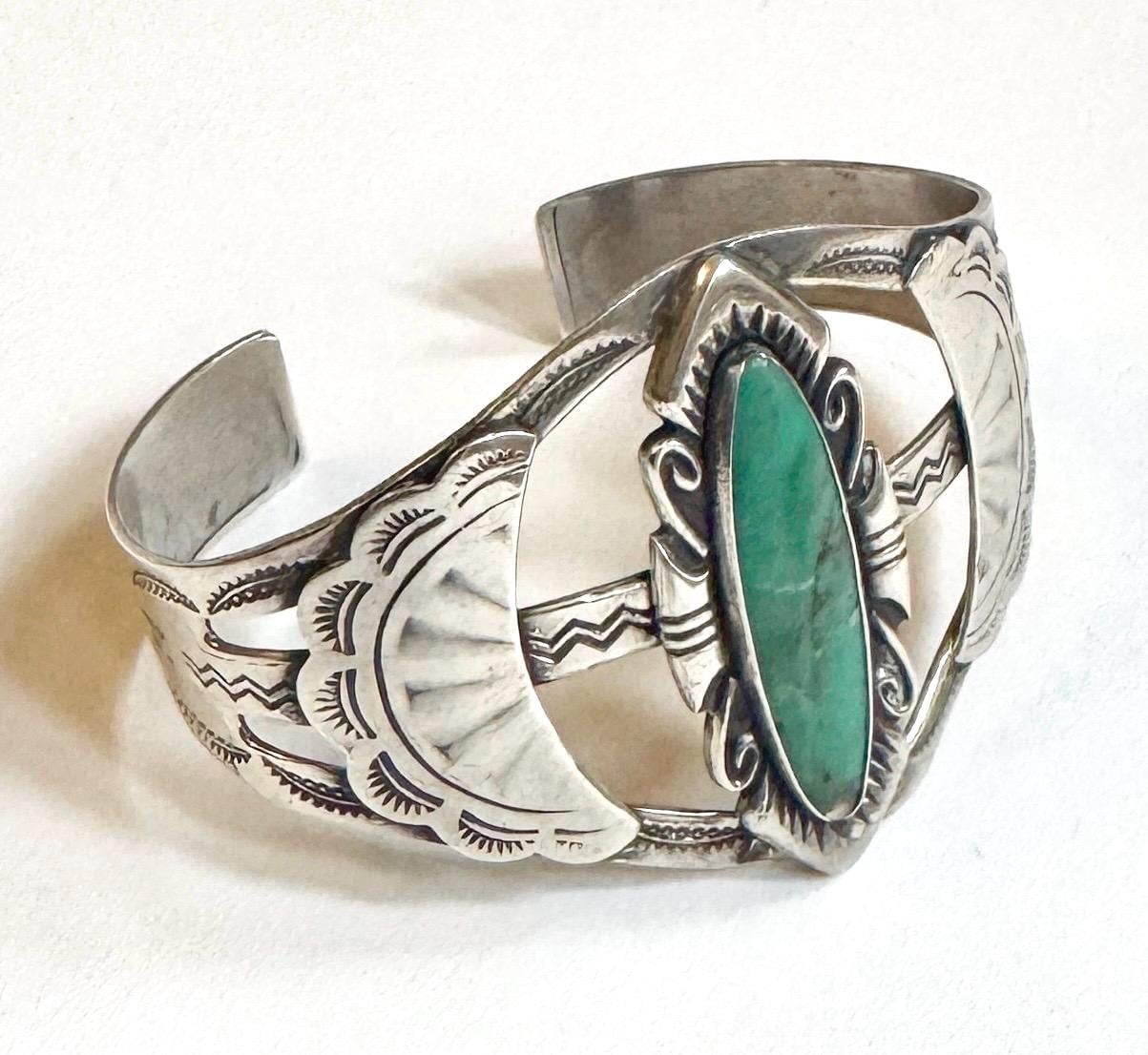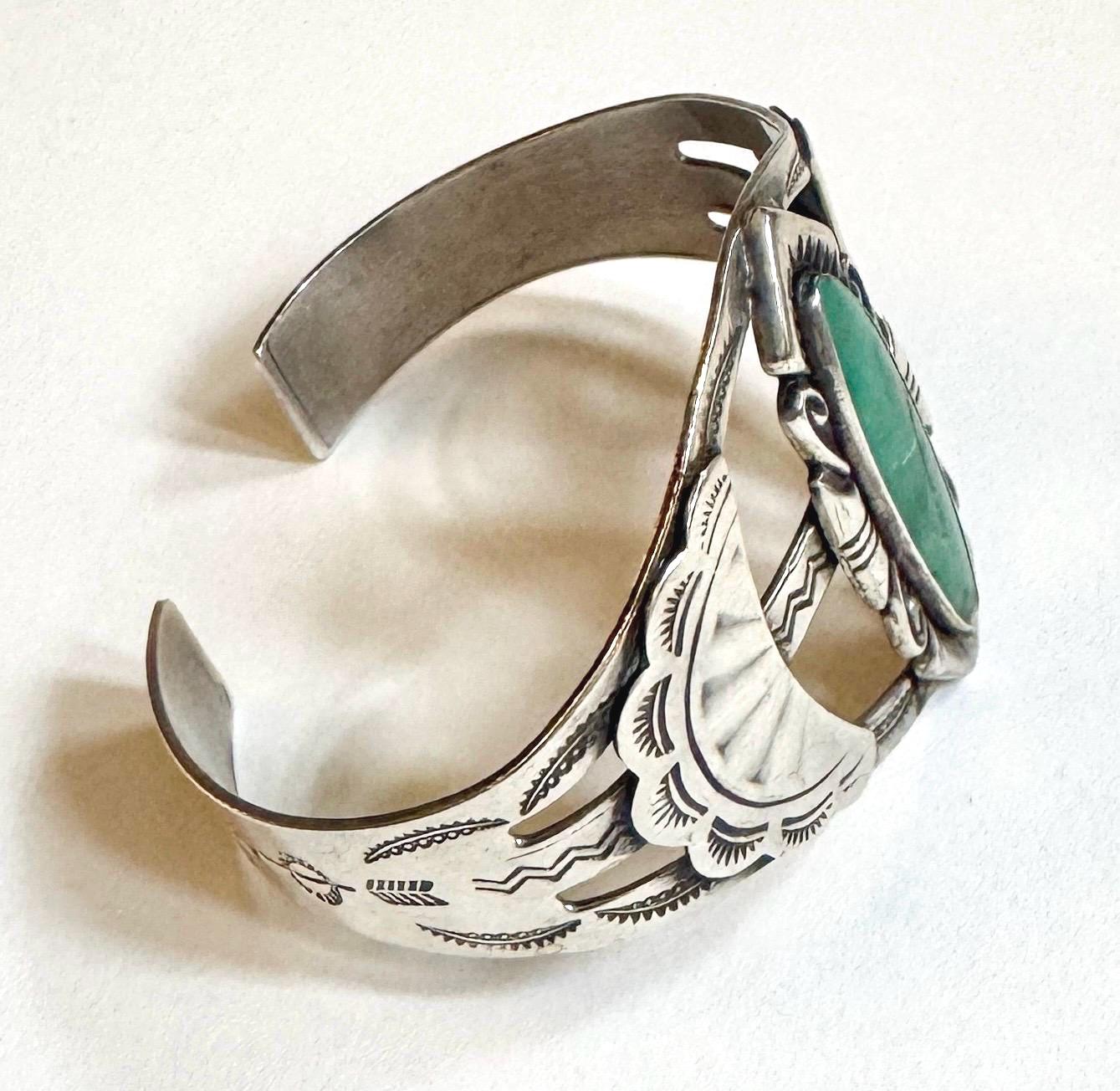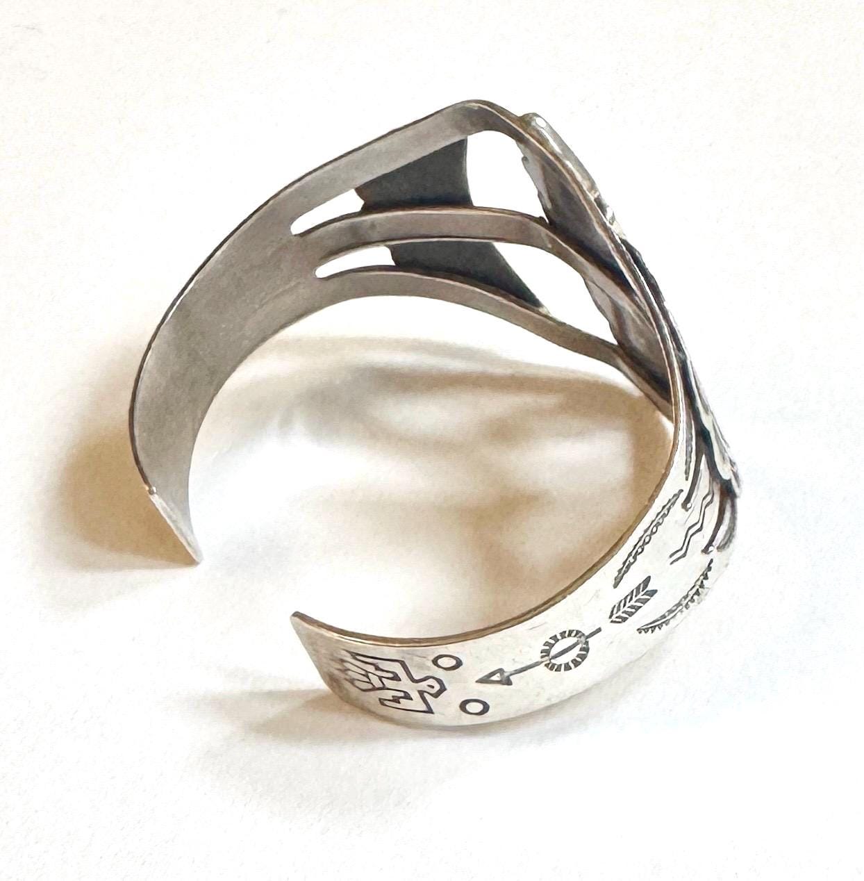 Wide vintage Bell Trading Native American Navajo sterling silver and turquoise cuff bracelet with arrow & thunderbird stamped band