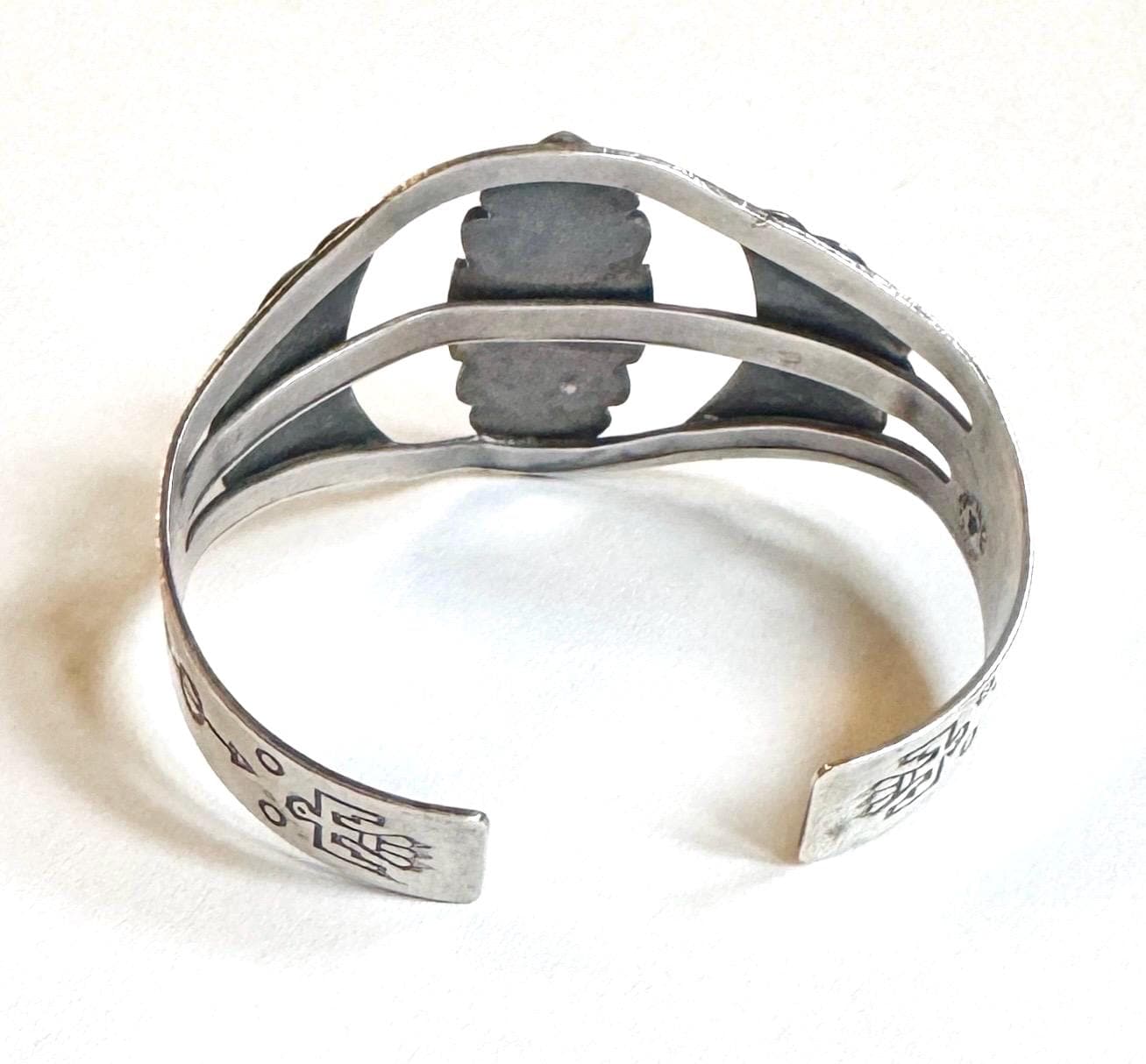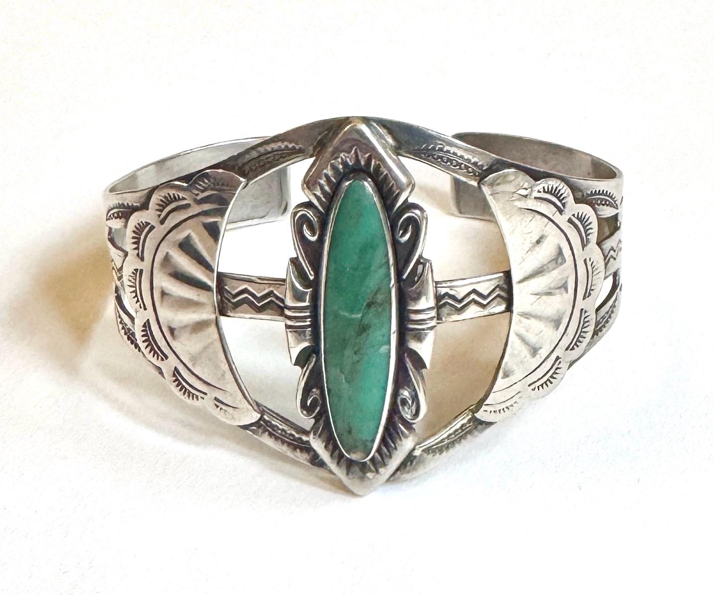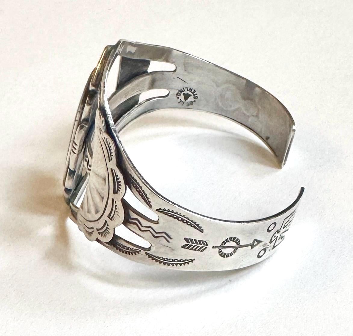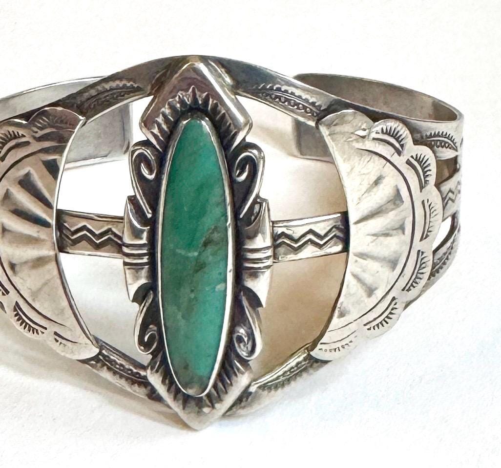 Wide vintage Bell Trading Native American Navajo sterling silver and turquoise cuff bracelet with arrow & thunderbird stamped band