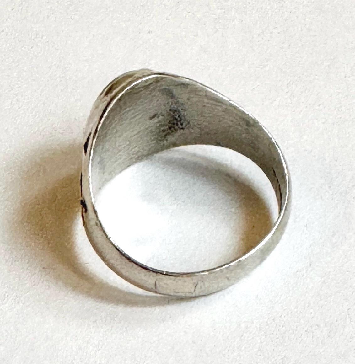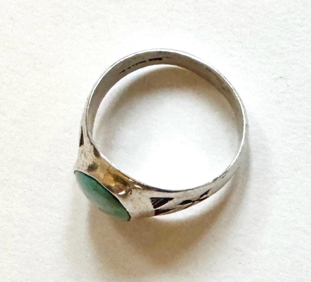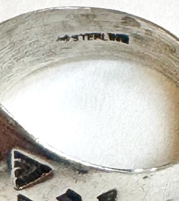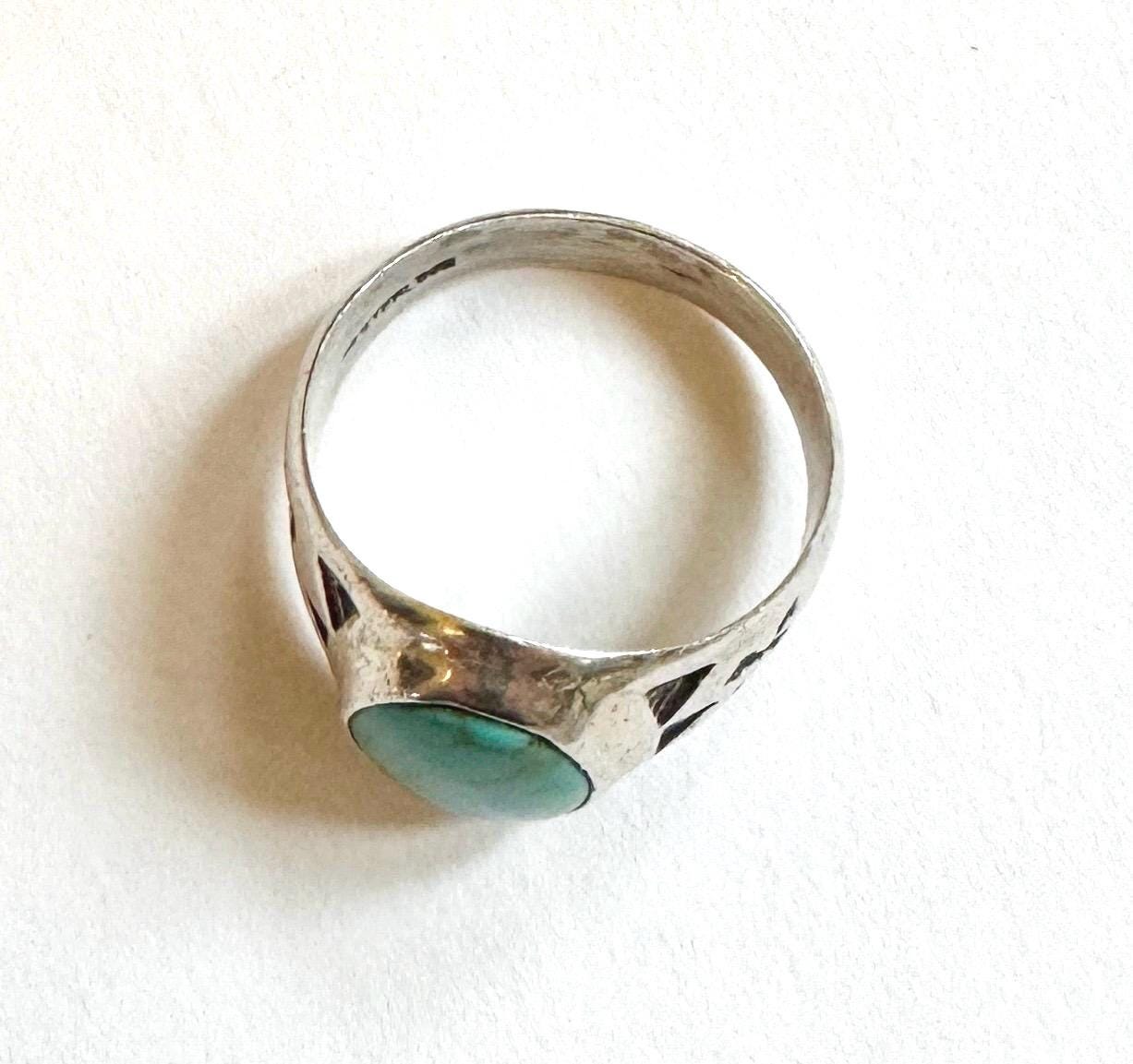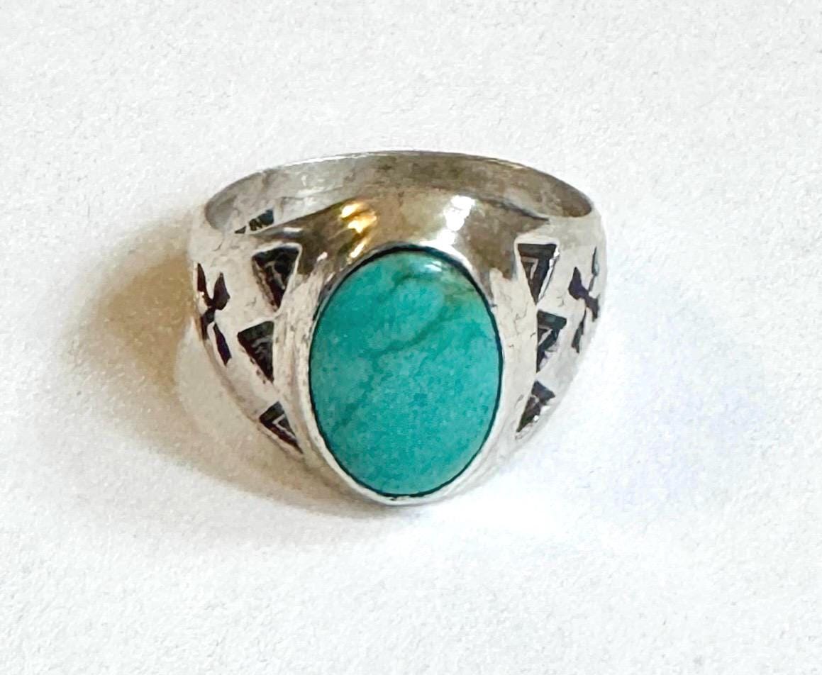 Vintage Native American Navajo trading post era sterling silver and turquoise ring with stamped double crossed arrow band