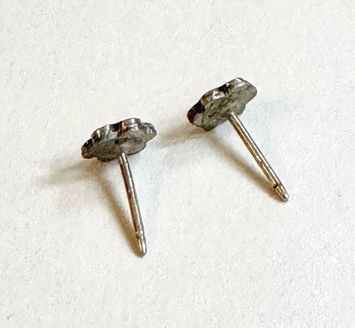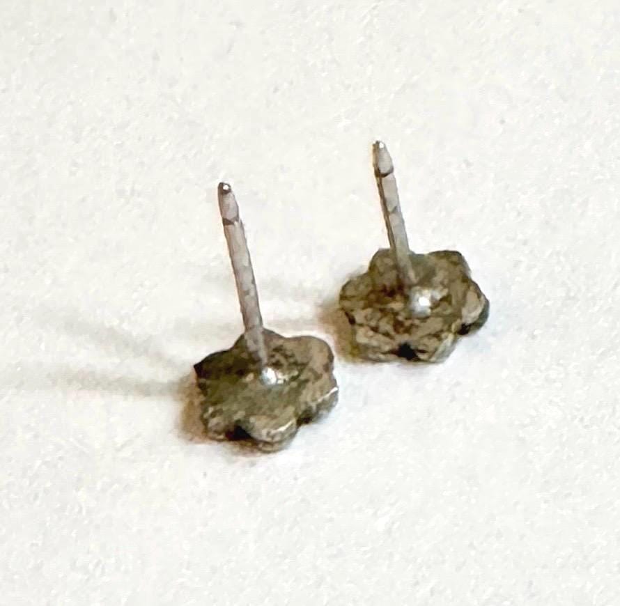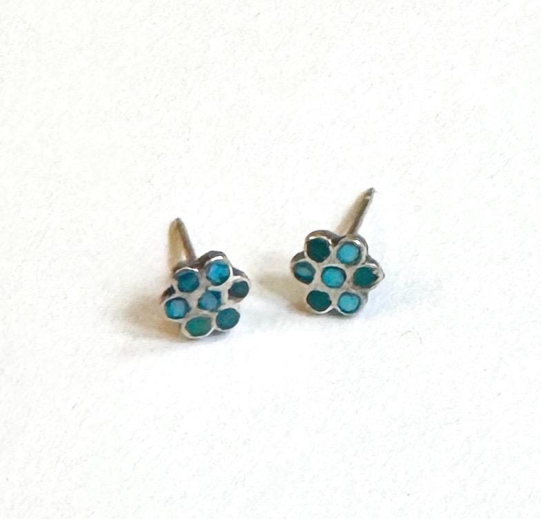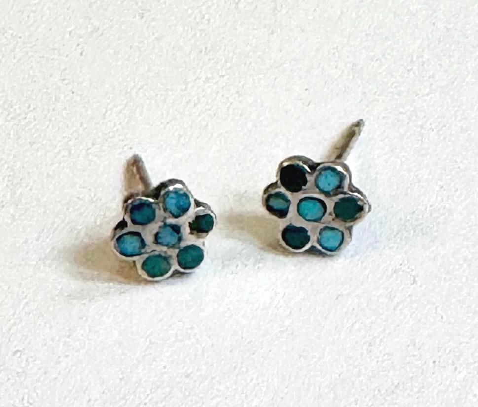 Tiny little vintage Native American Dishta sterling silver and flush turquoise inlay flower earrings