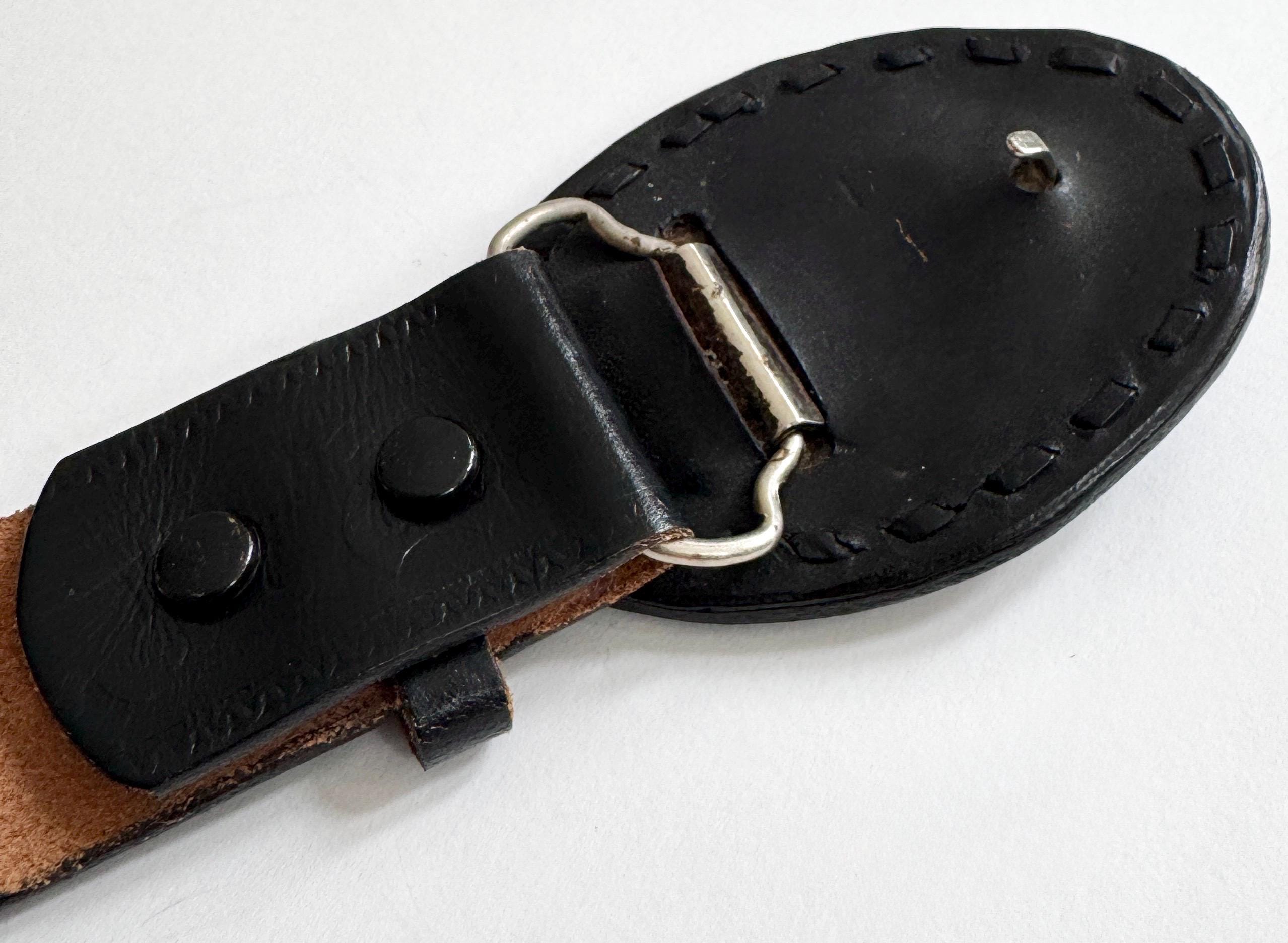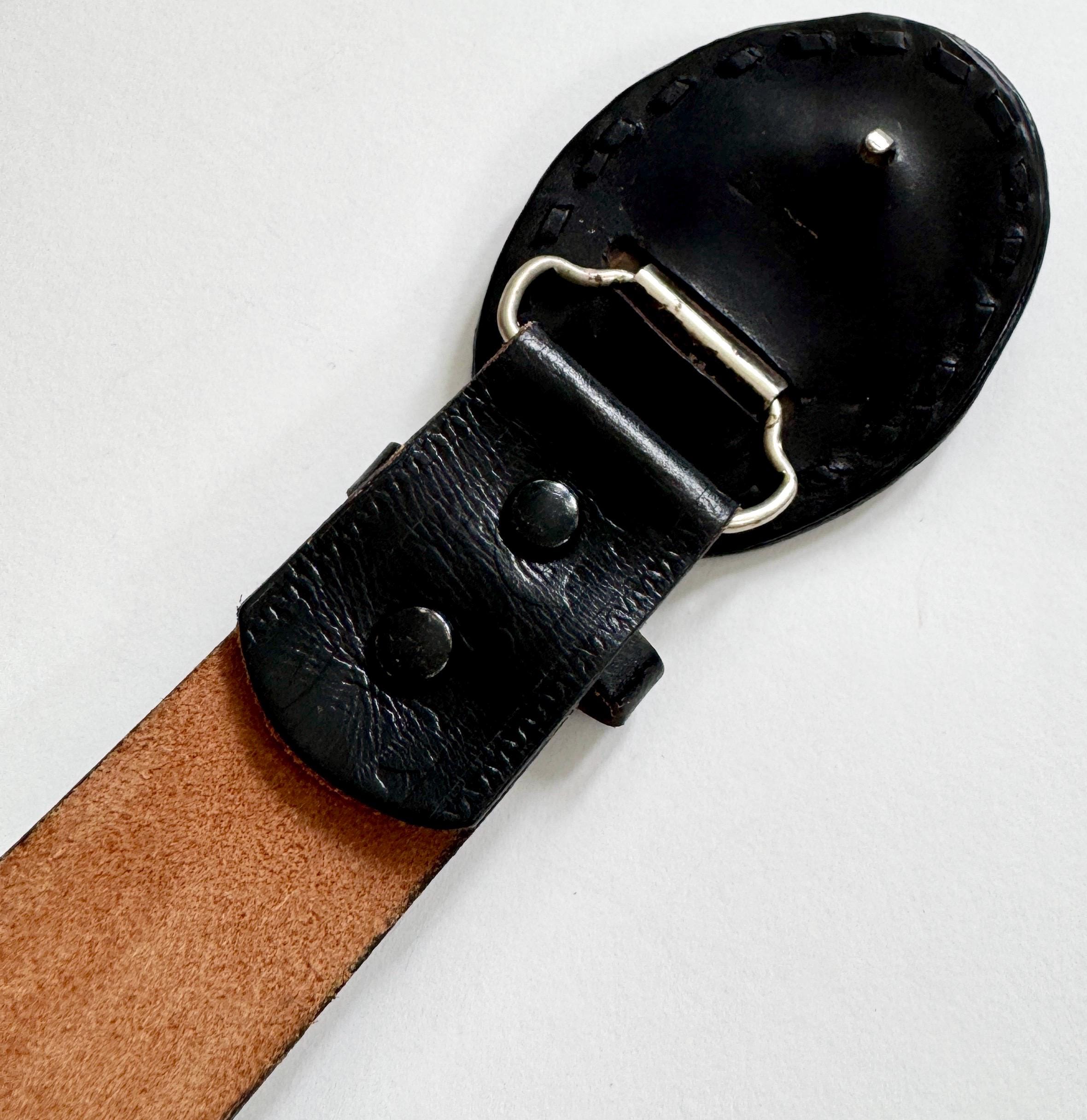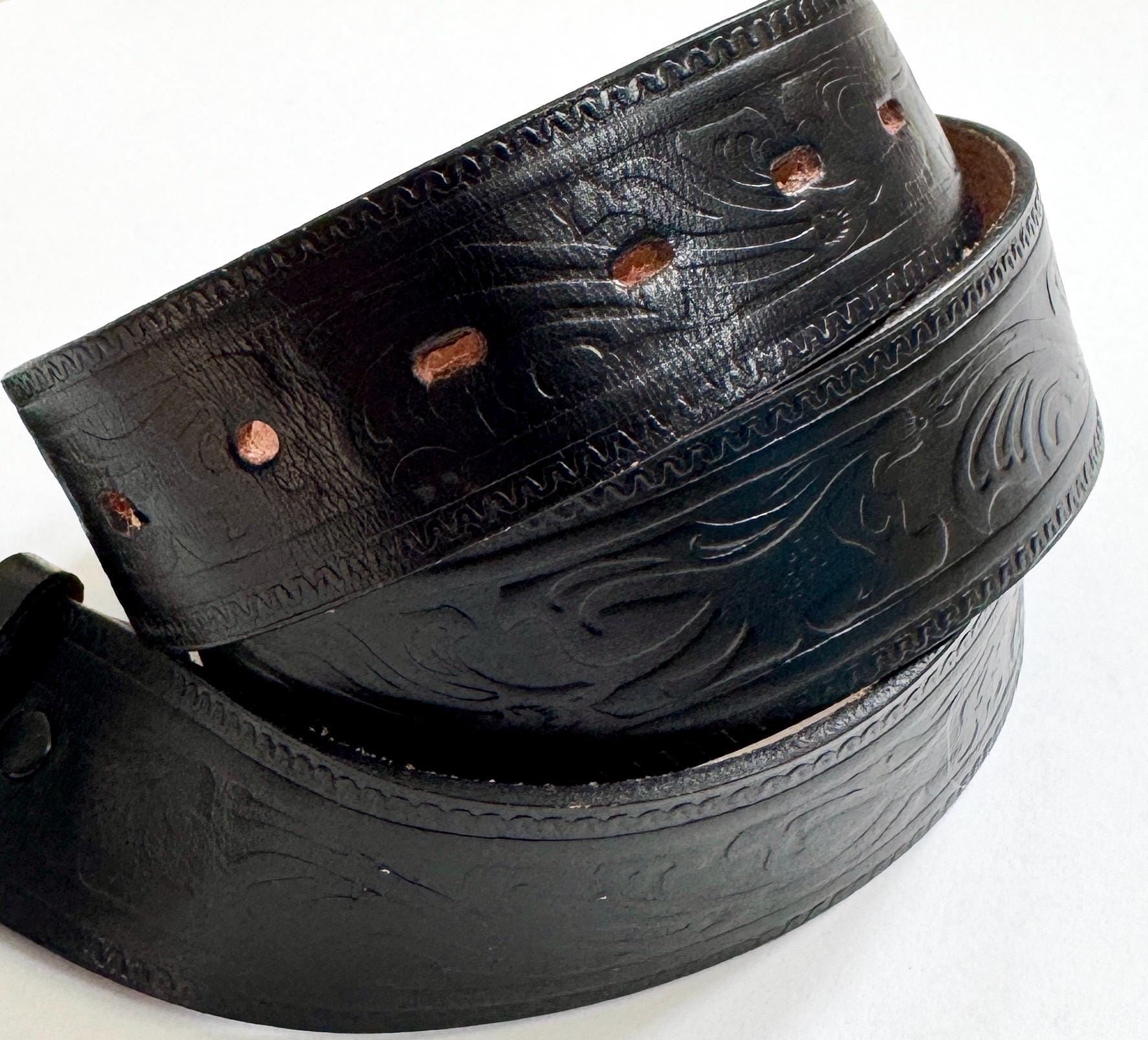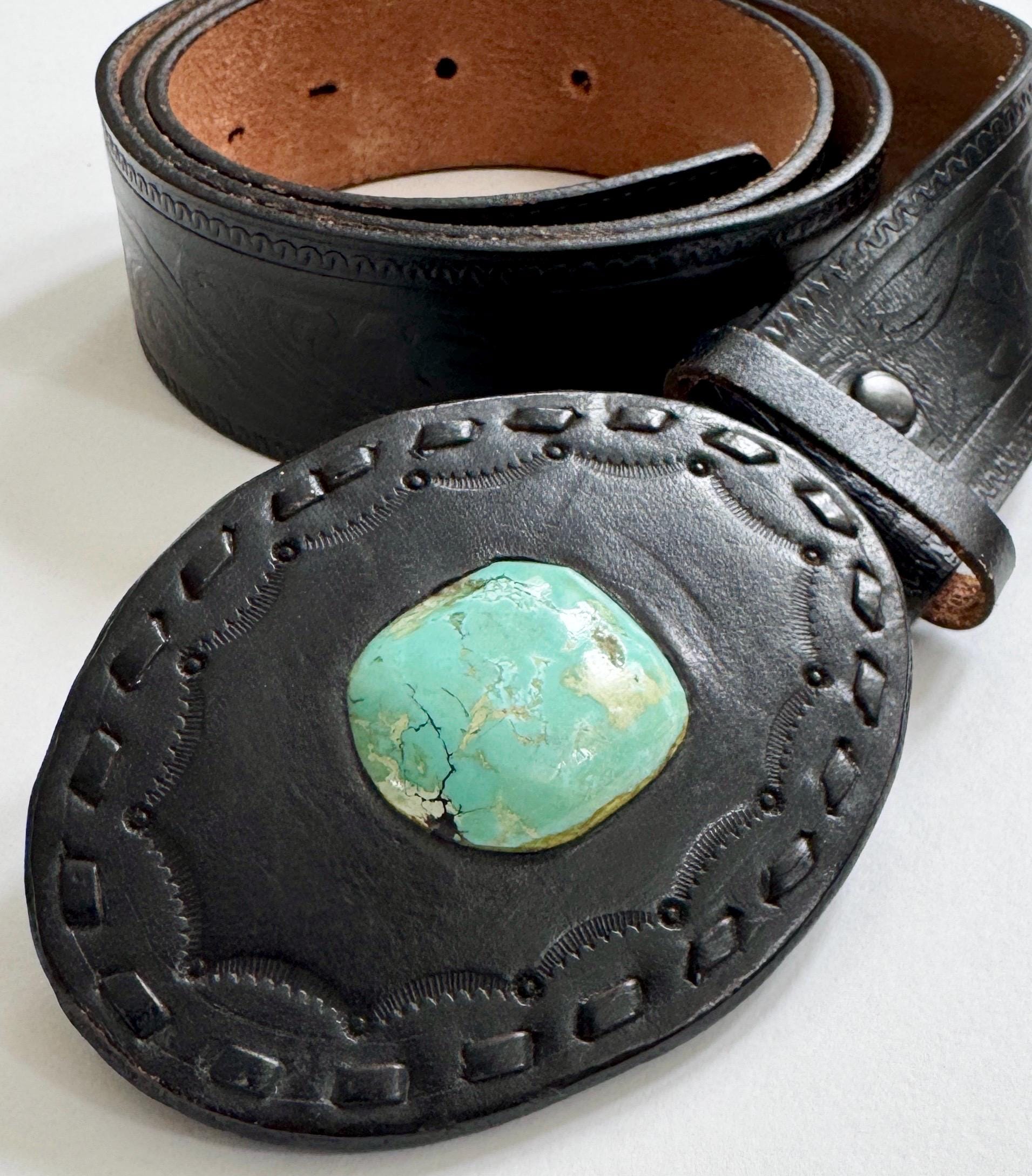 Vintage handmade black leather and turquoise belt buckle mounted on a floral top grain cowhide leather belt strap