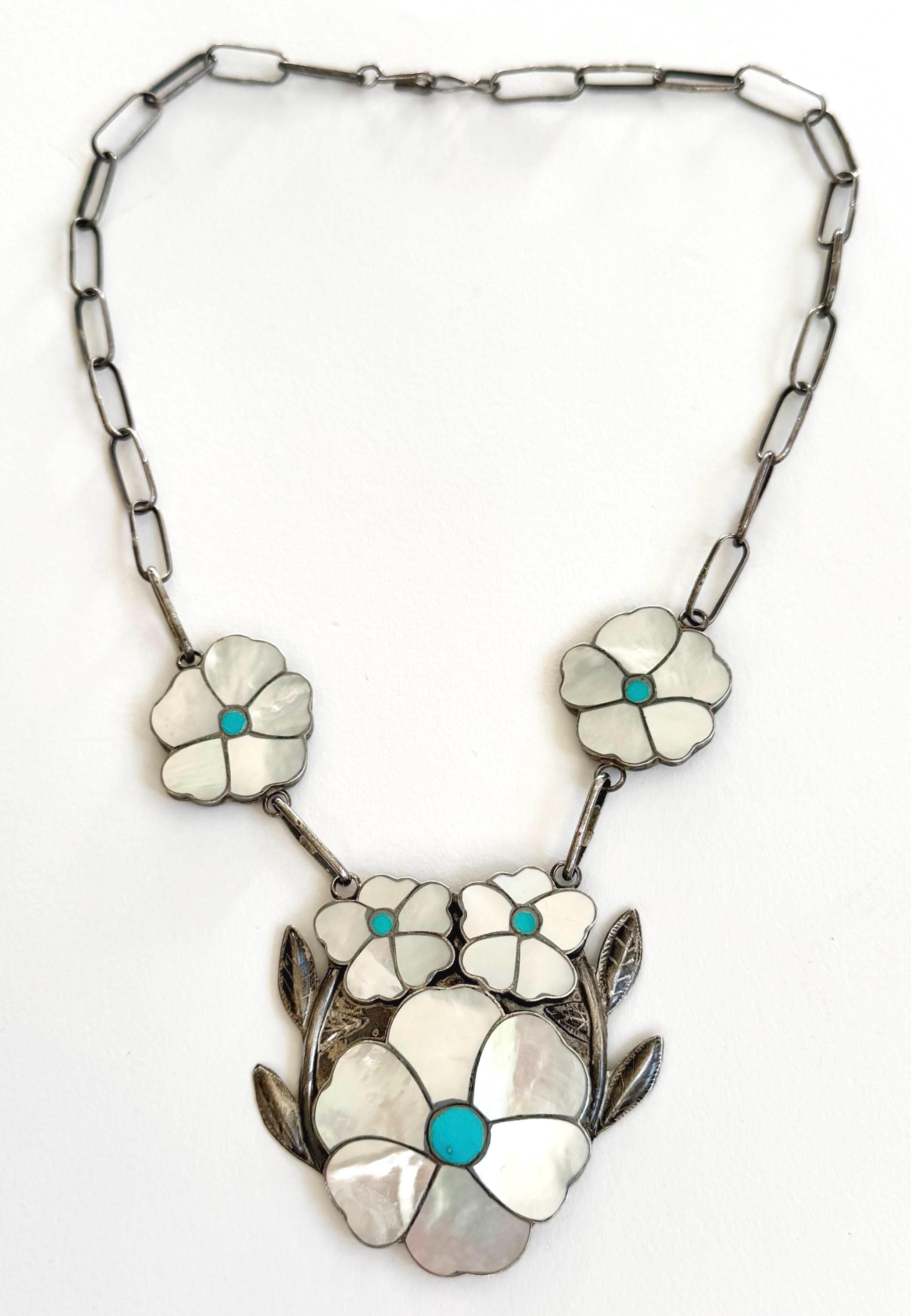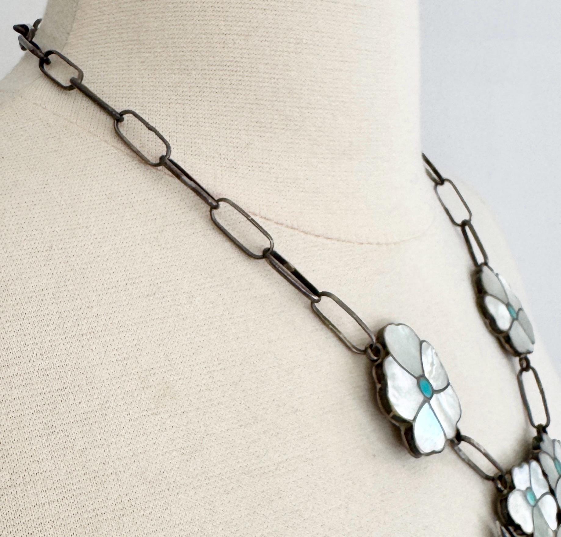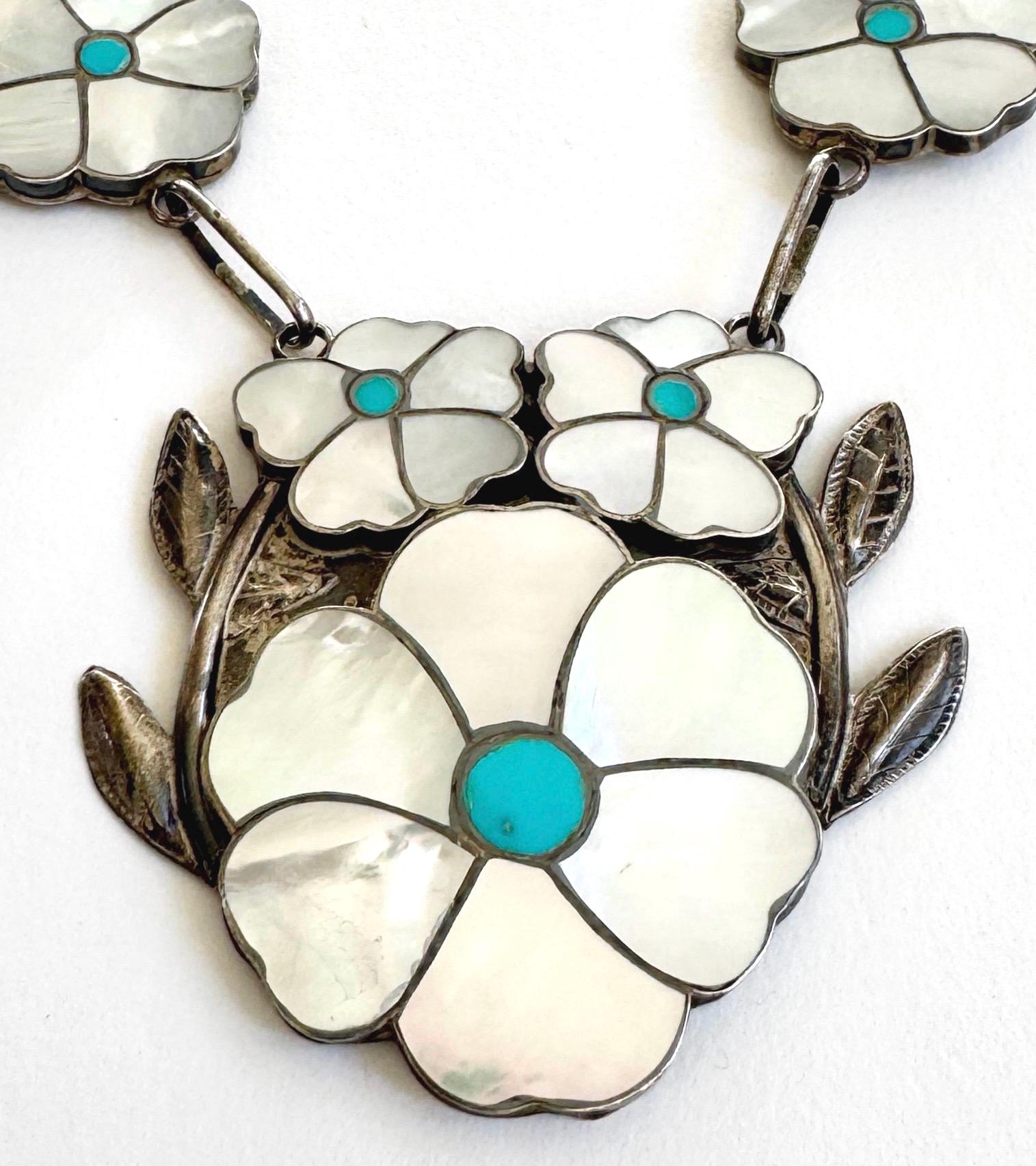 Fine vintage Native American Zuni handcrafted sterling silver necklace with large turquoise and mother of pearl inlaid desert rose flowers