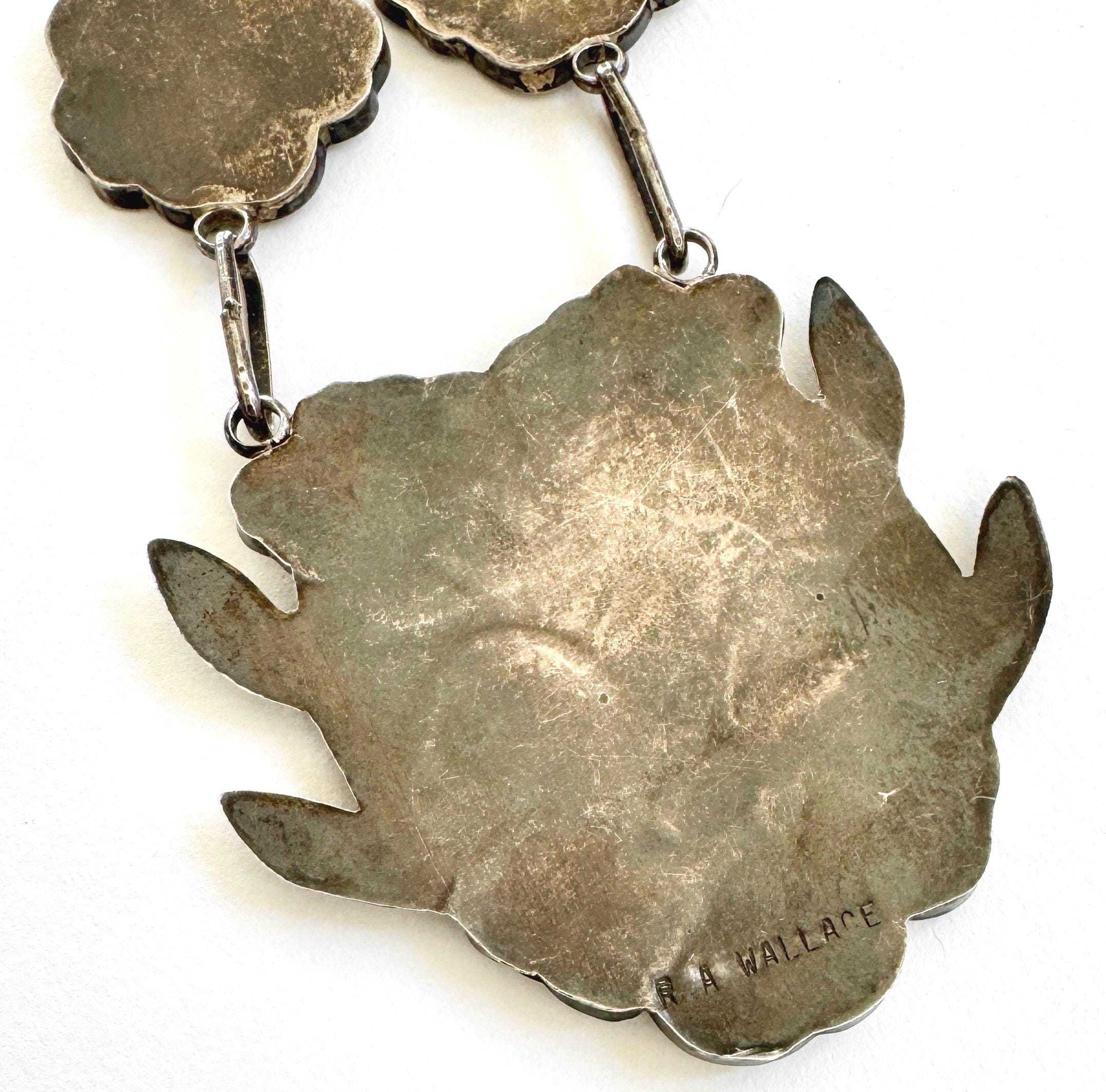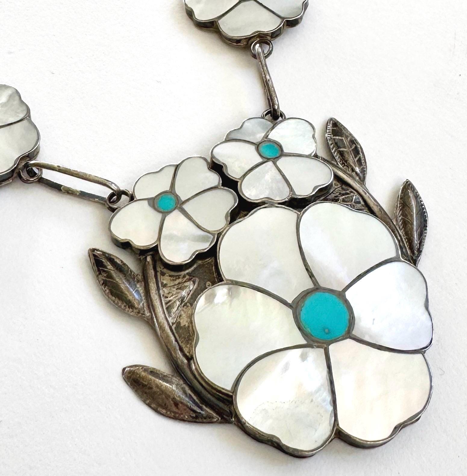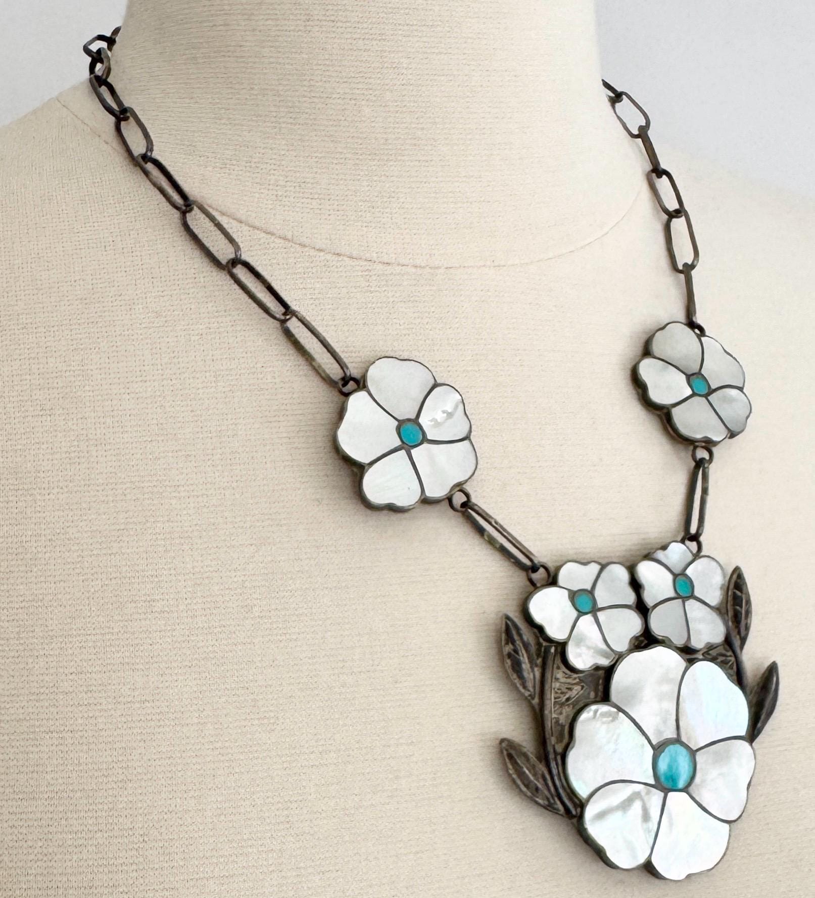 Fine vintage Native American Zuni handcrafted sterling silver necklace with large turquoise and mother of pearl inlaid desert rose flowers