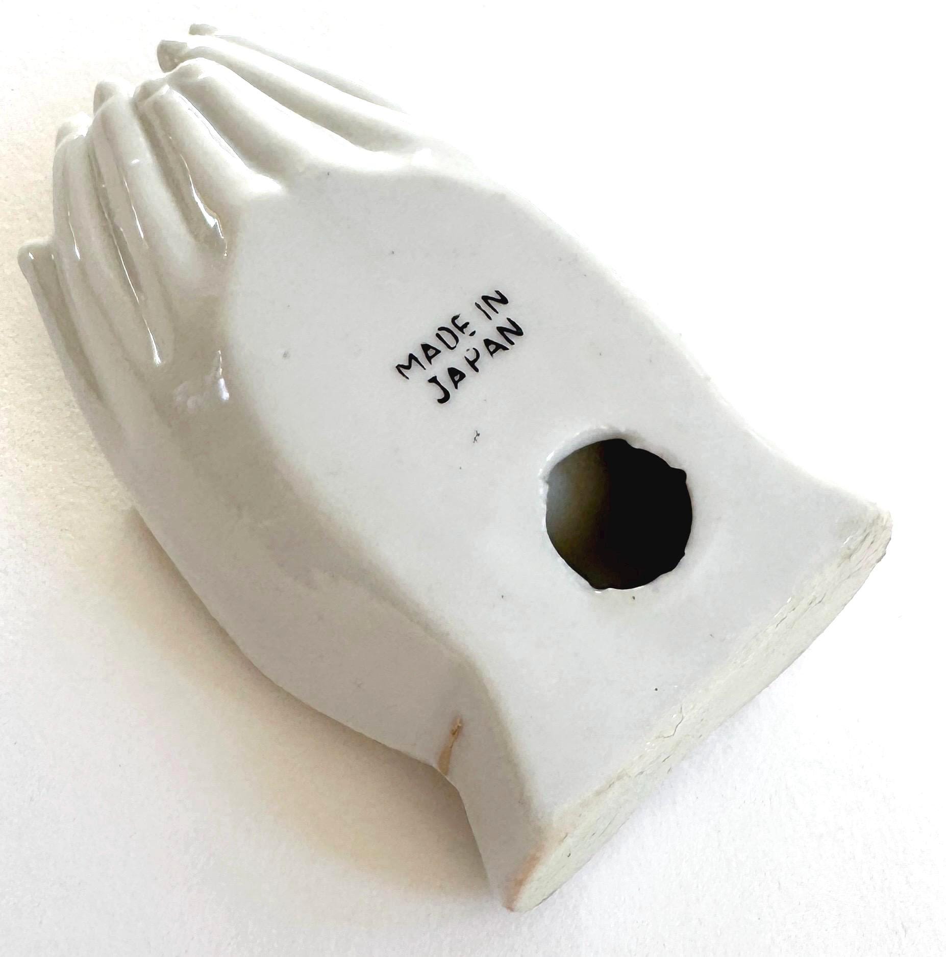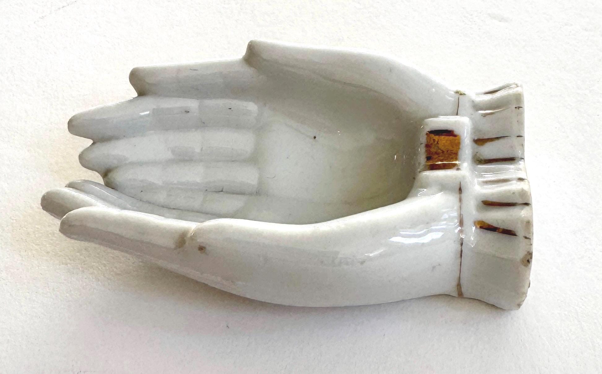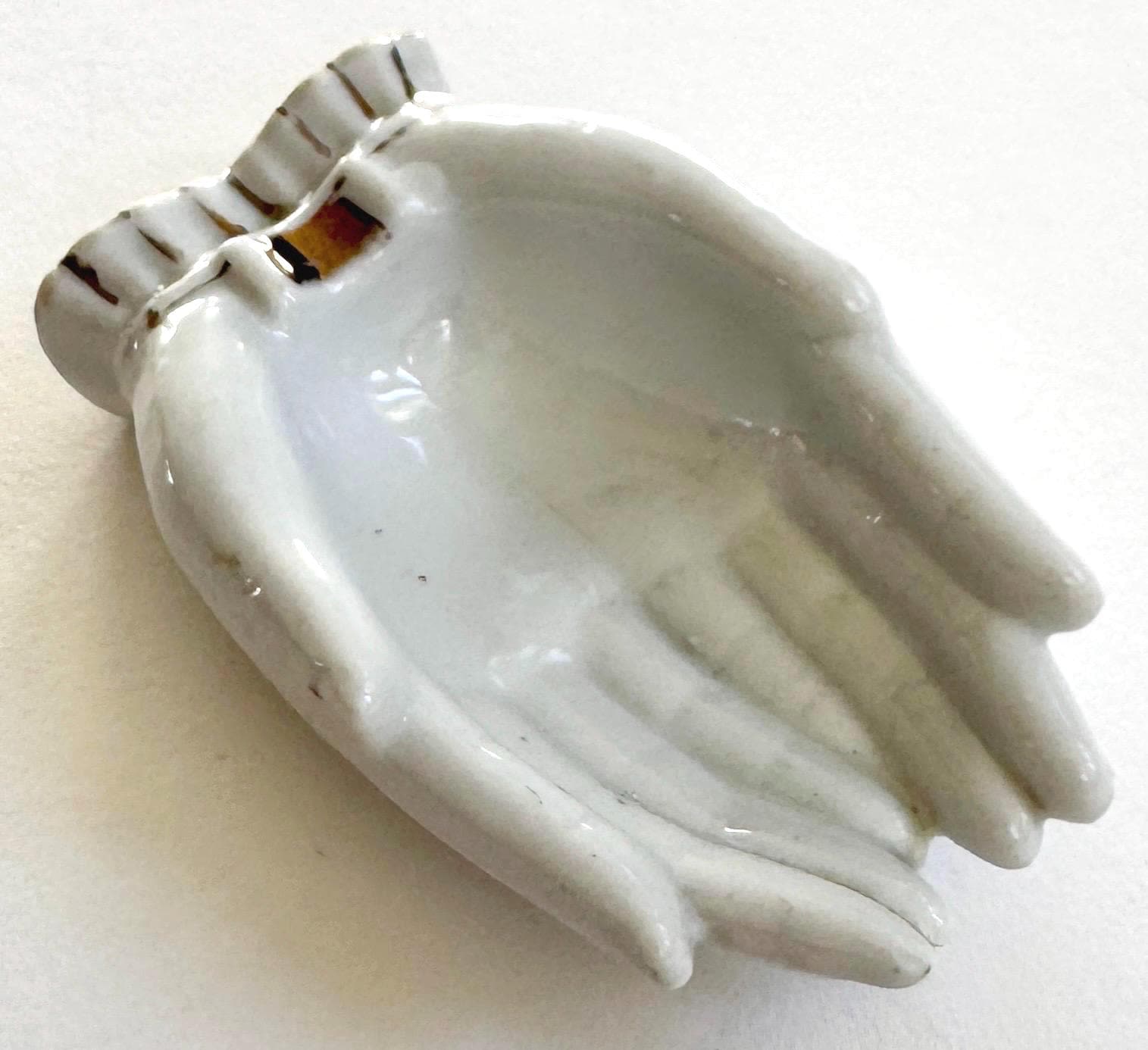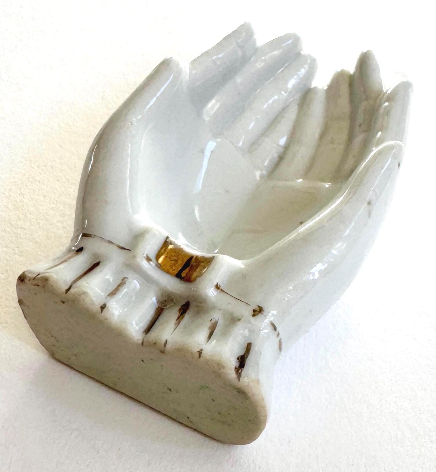 Rare Mid Century vintage cupped hands ring dish with painted gold accents