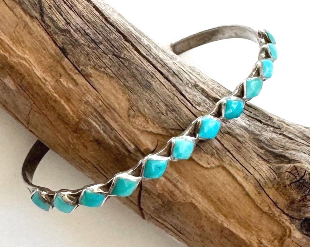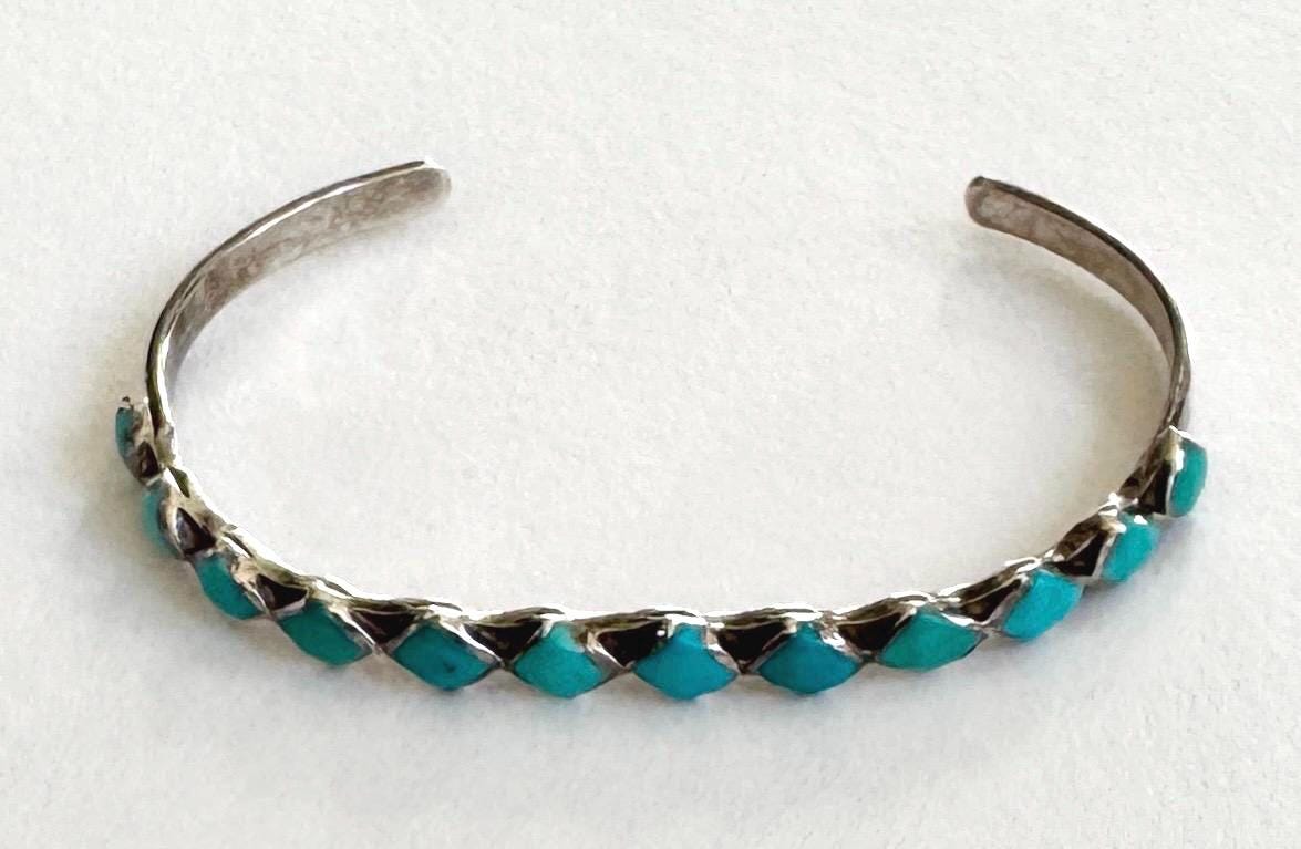 Vintage Native American Zuni sterling silver cuff bracelet with diamond shape flush inlay turquoise