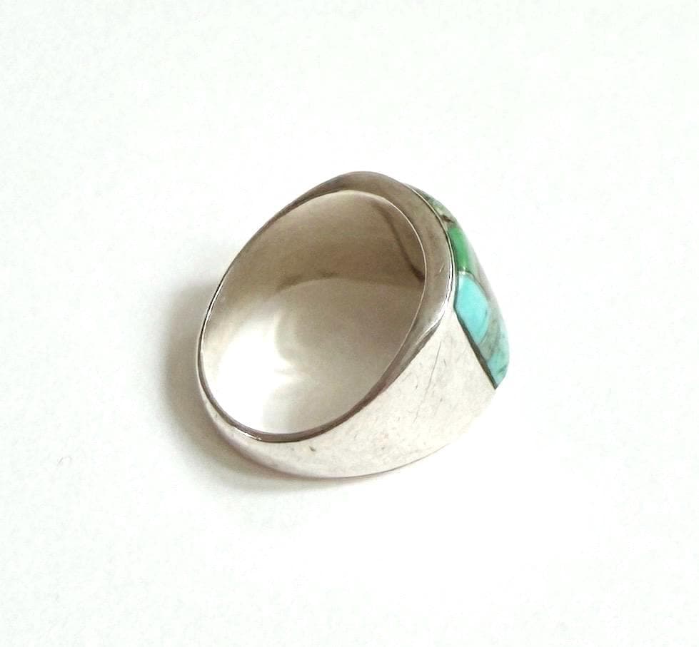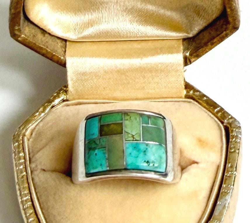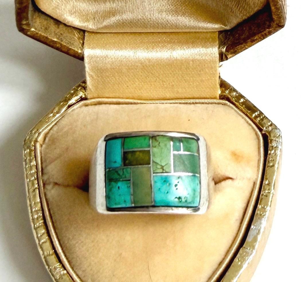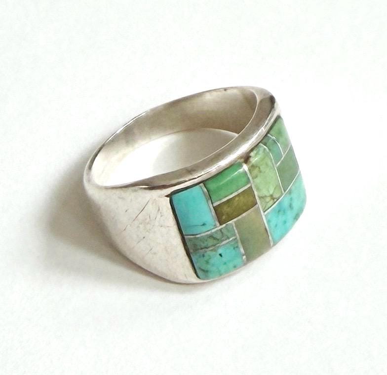 Vintage Native American Zuni sterling silver ring with geometric mosaic flush turquoise inlay