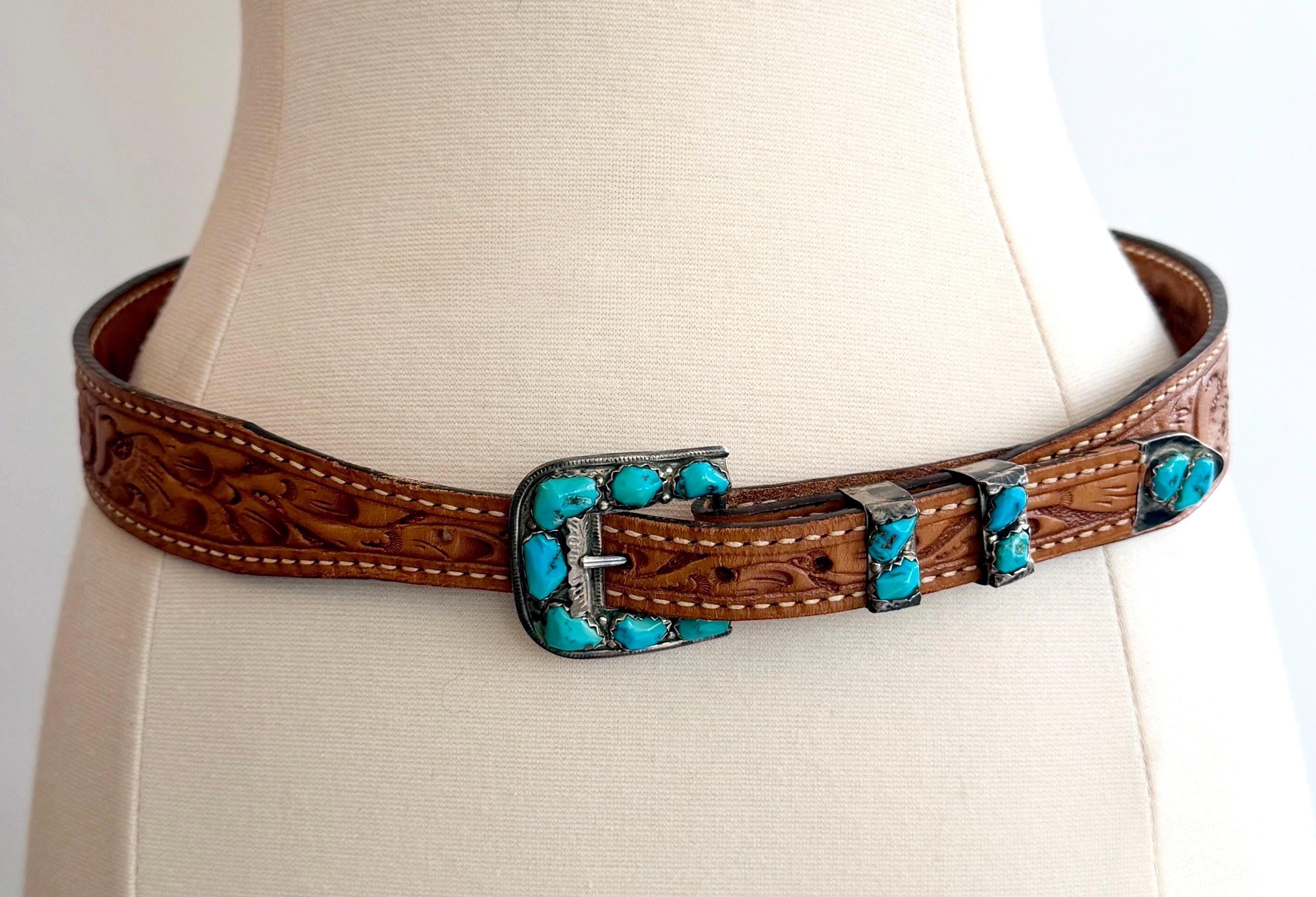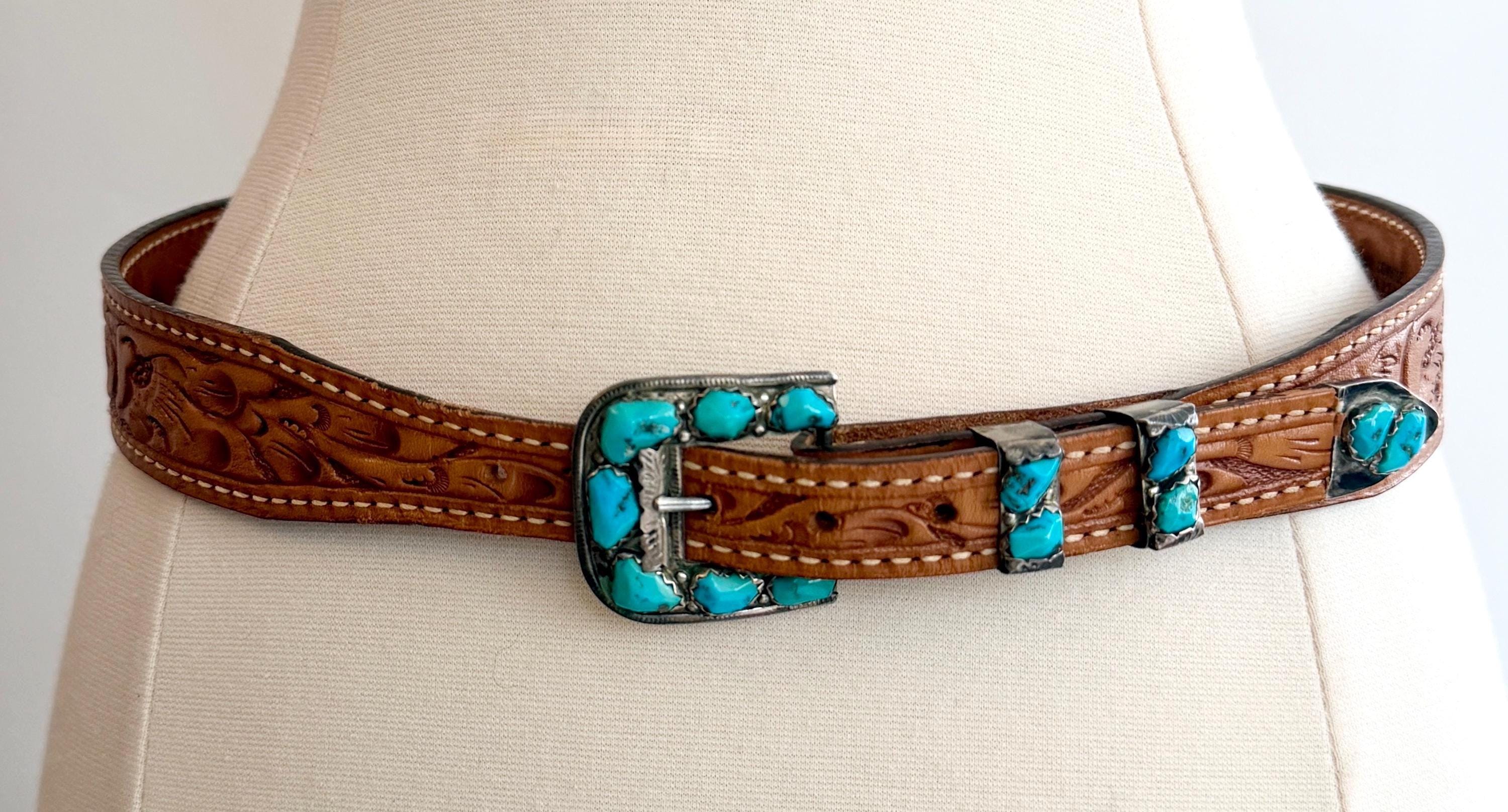 Vintage Native American Navajo sterling silver and natural turquoise cluster buckle mounted on a floral hand tooled leather belt strap