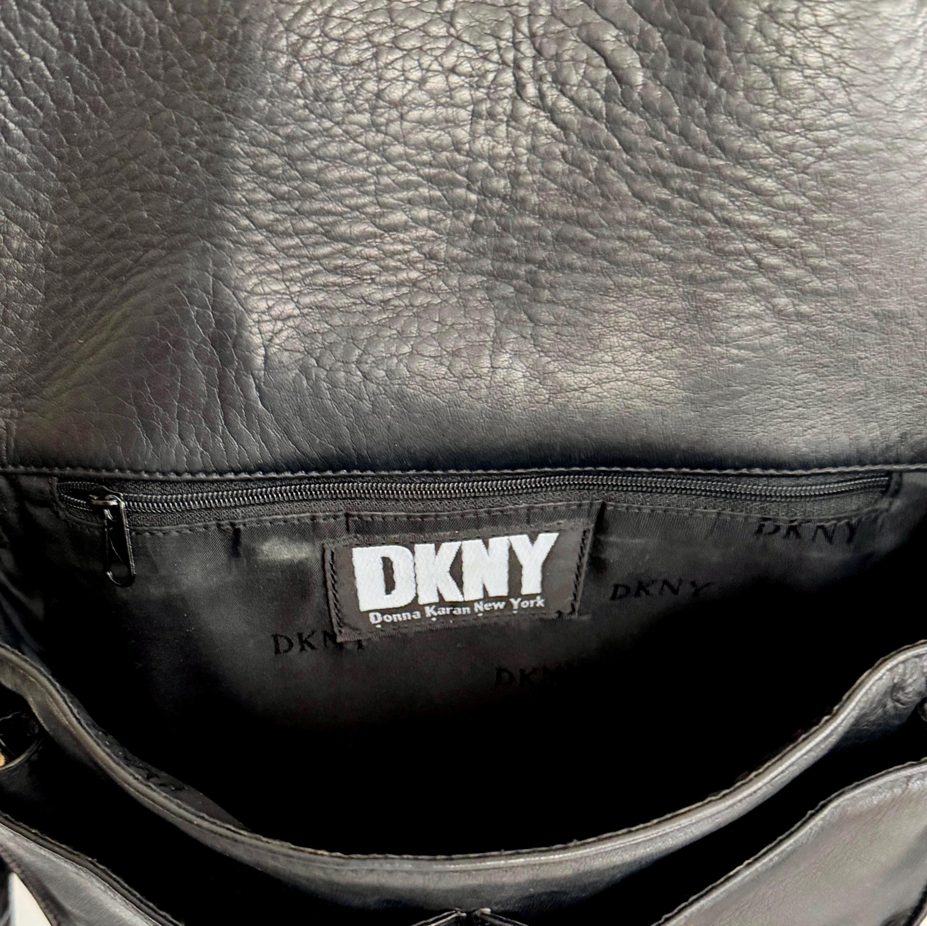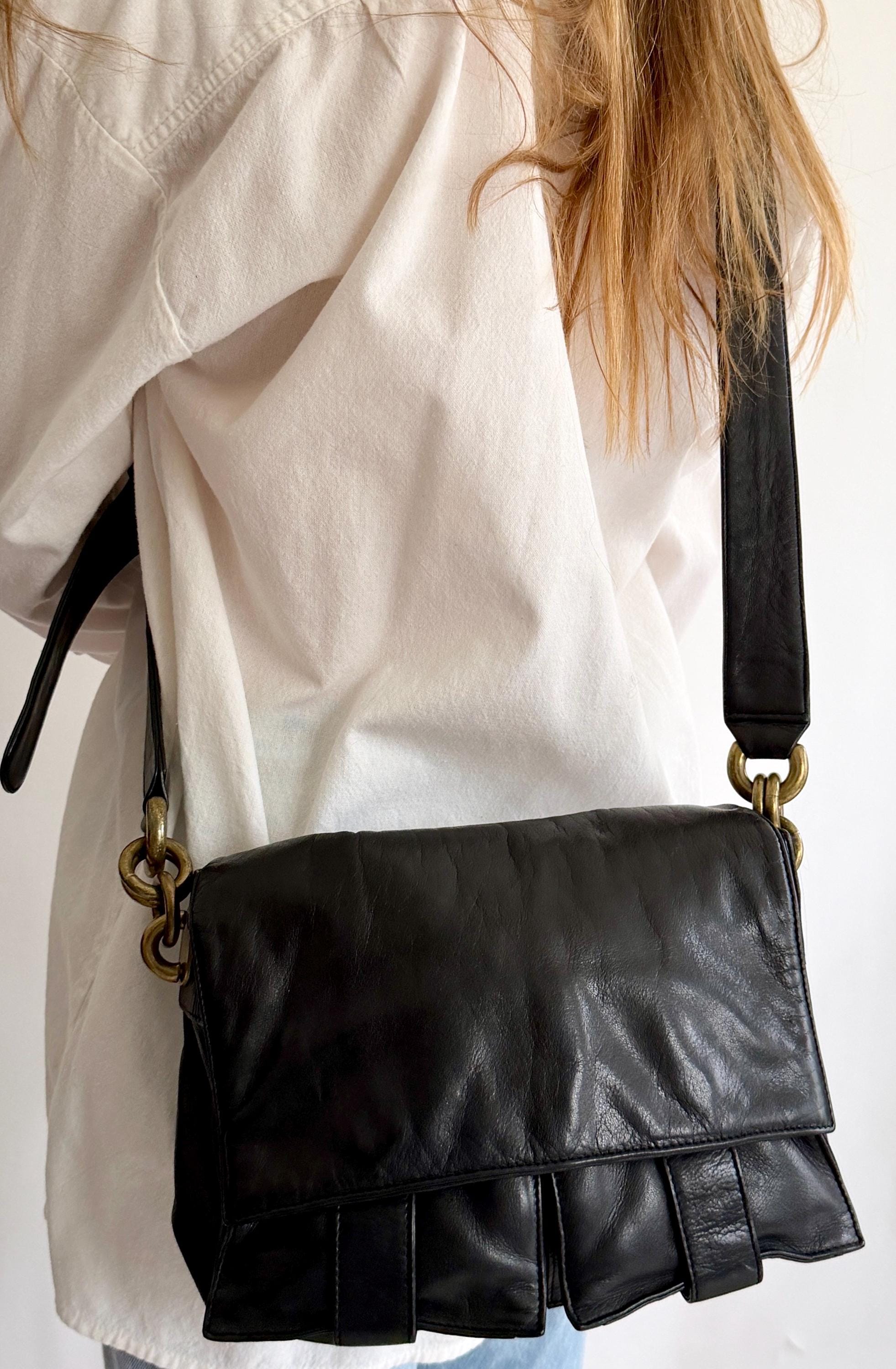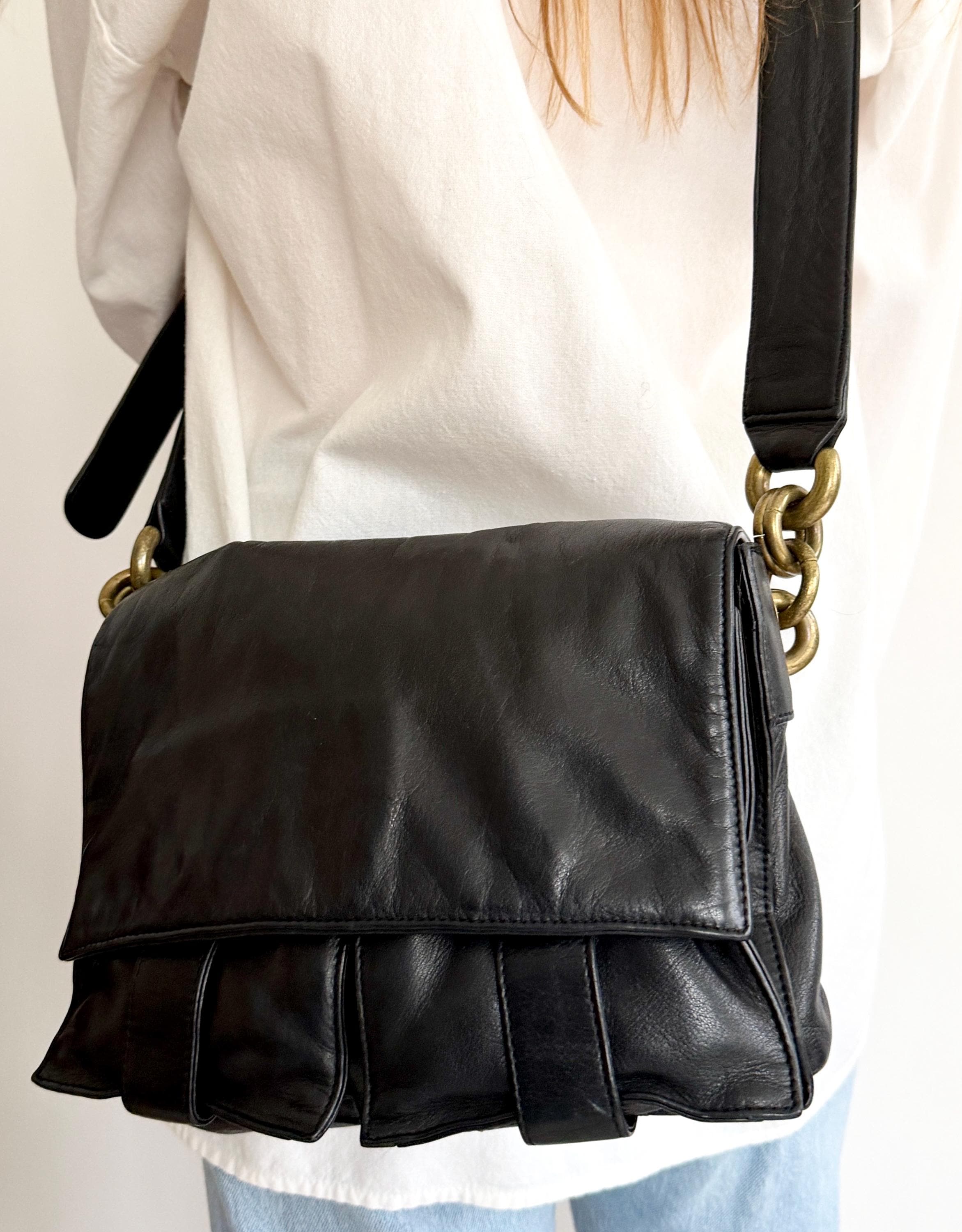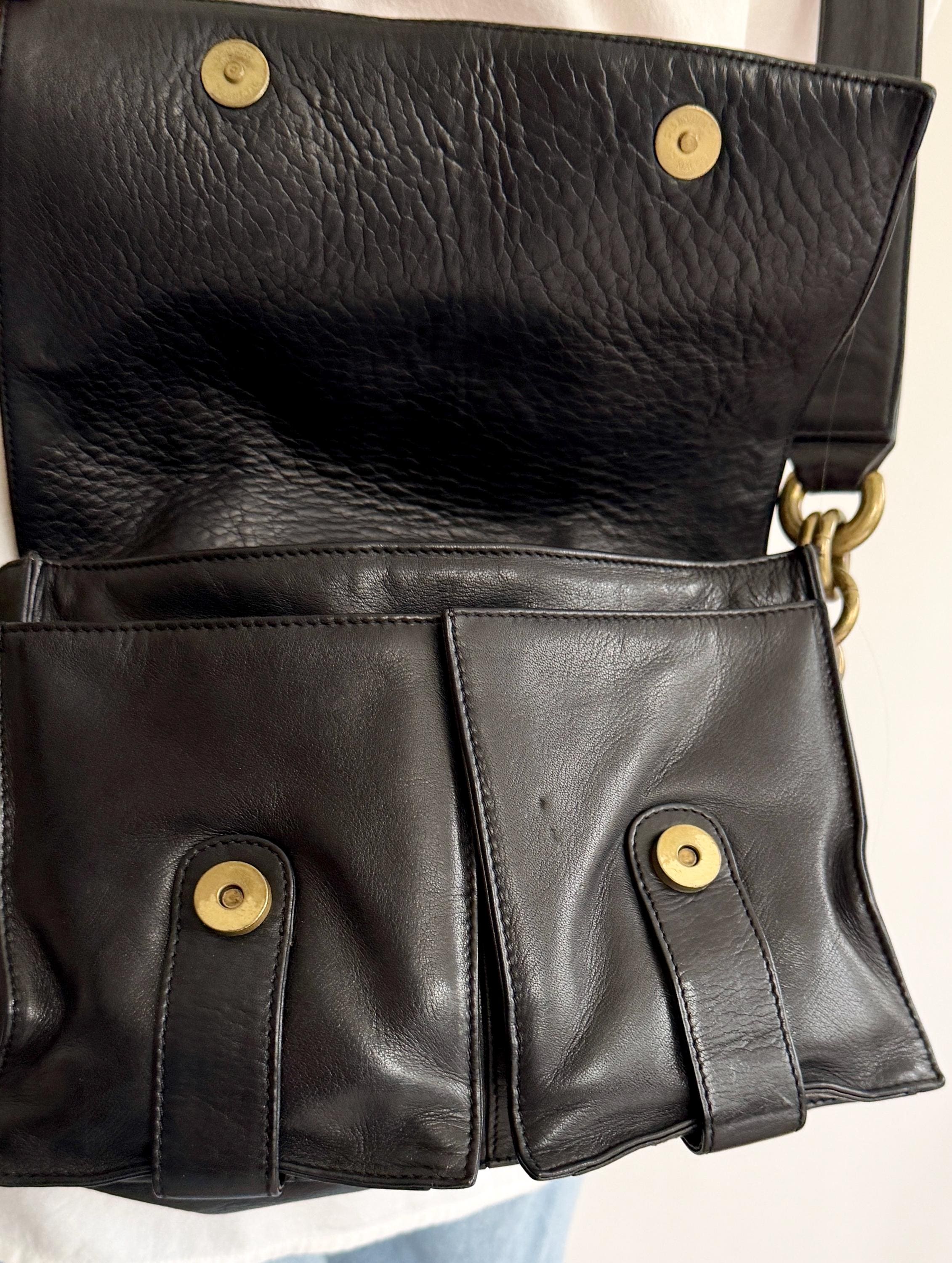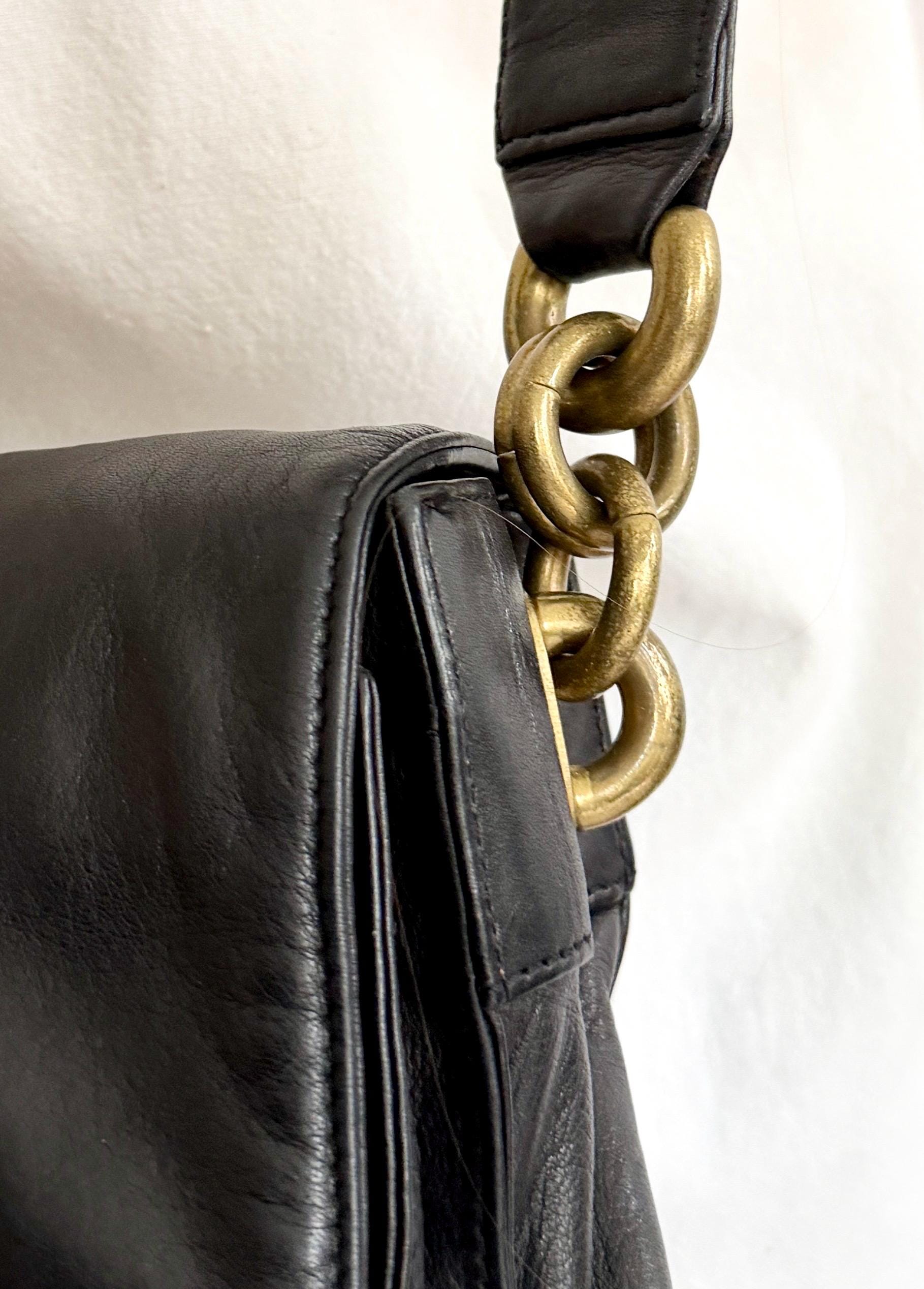 Vintage 90's DKNY buttery soft brown leather crossbody bag with oversized brass chain detail