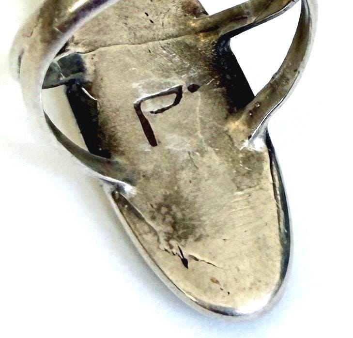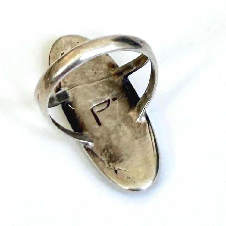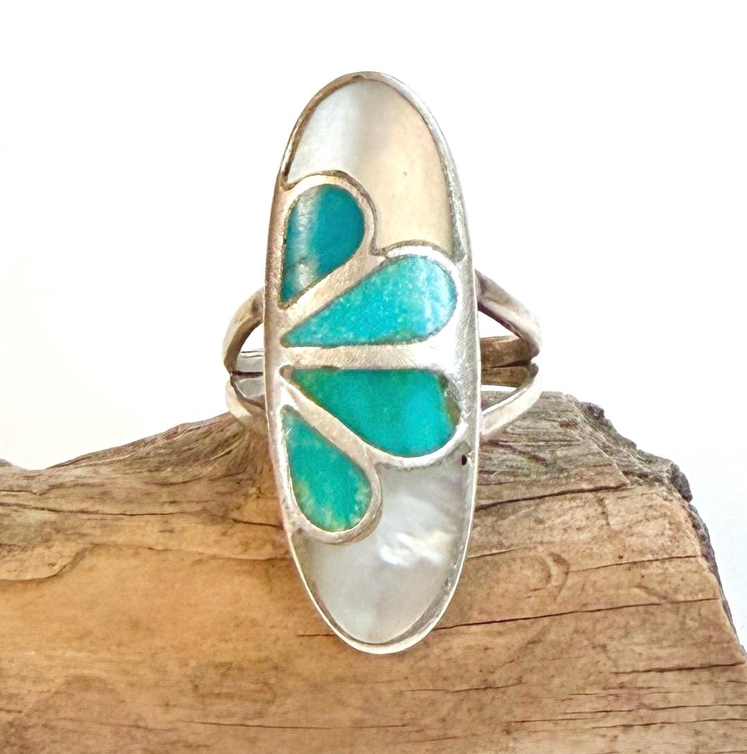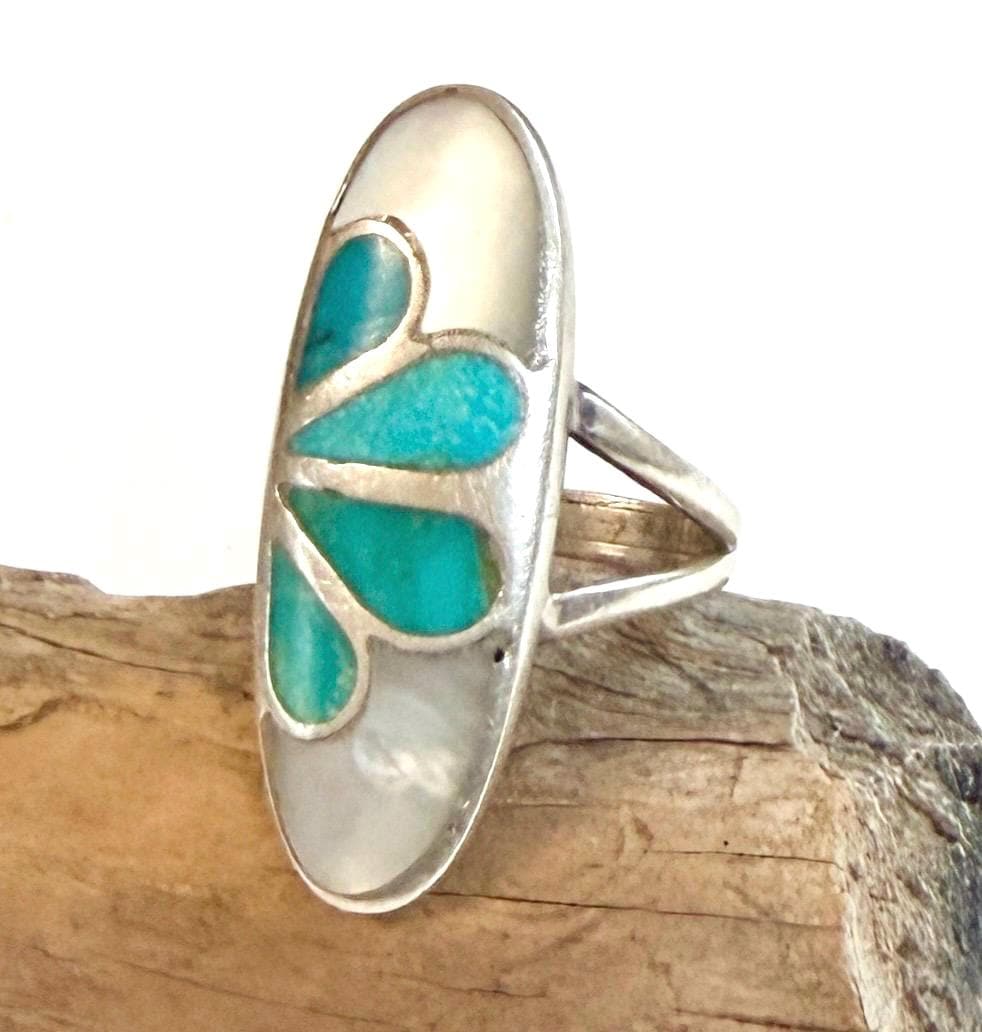 Vintage Native American Zuni sterling silver ring with turquoise and mother of pearl and flush inlay set in the design of a flower