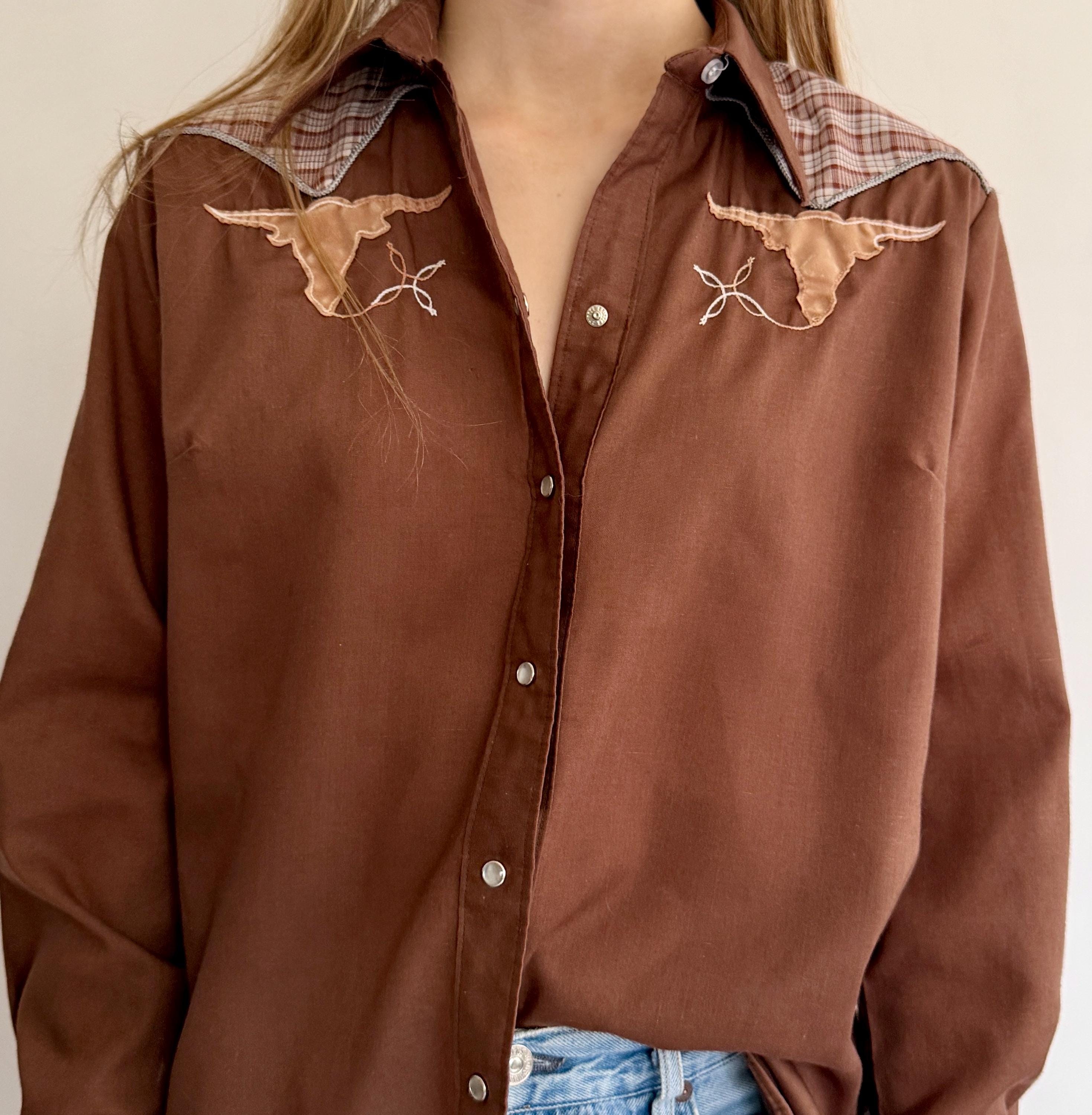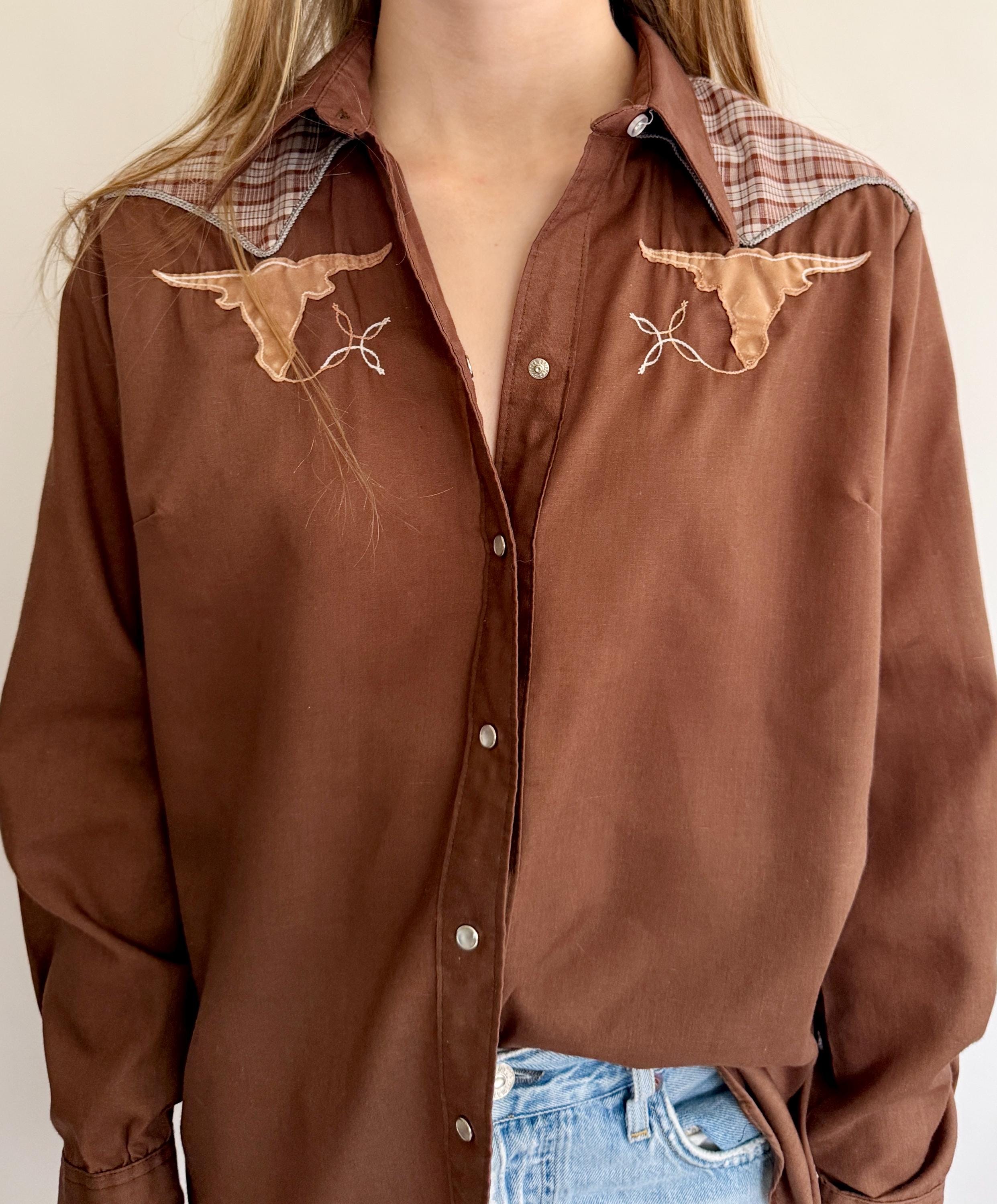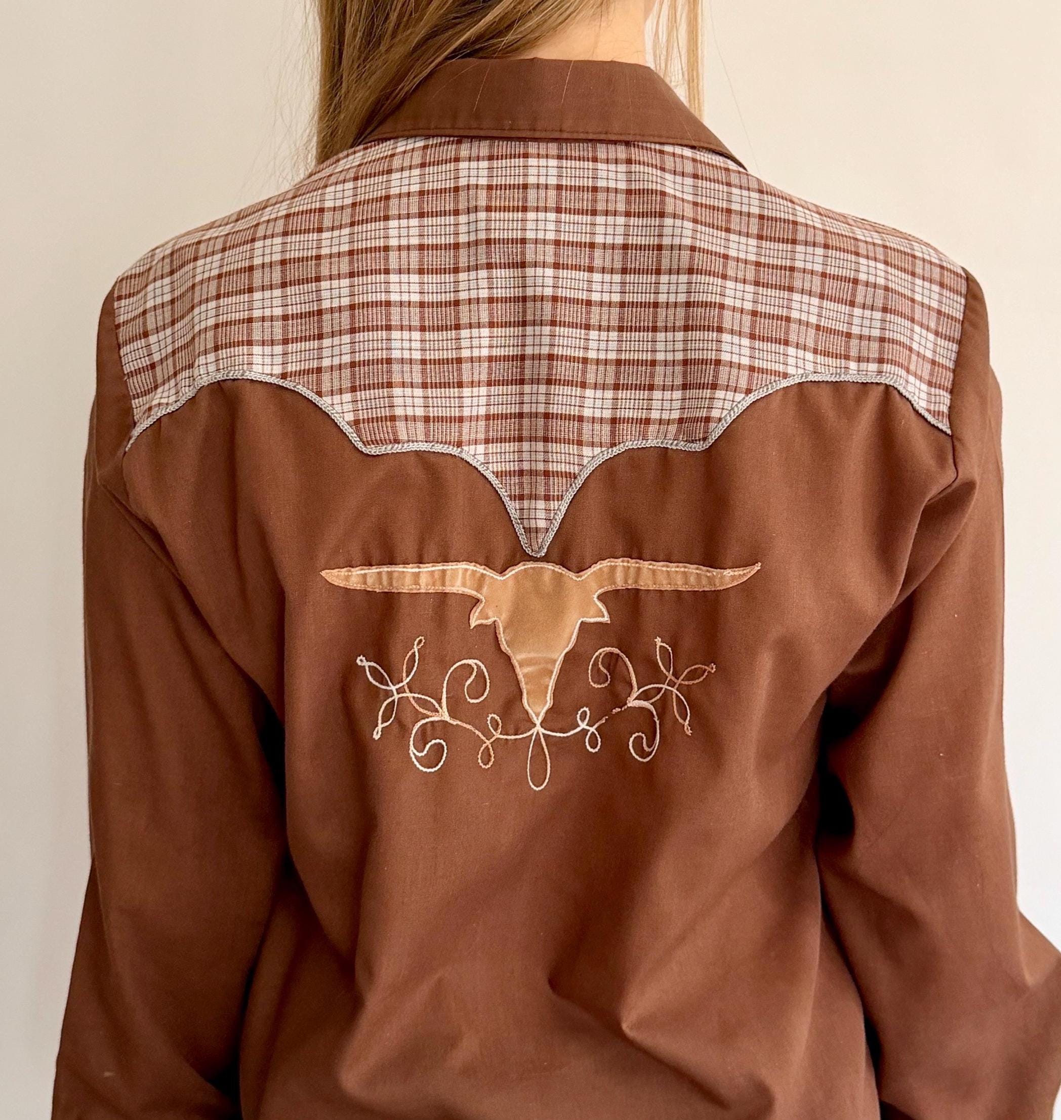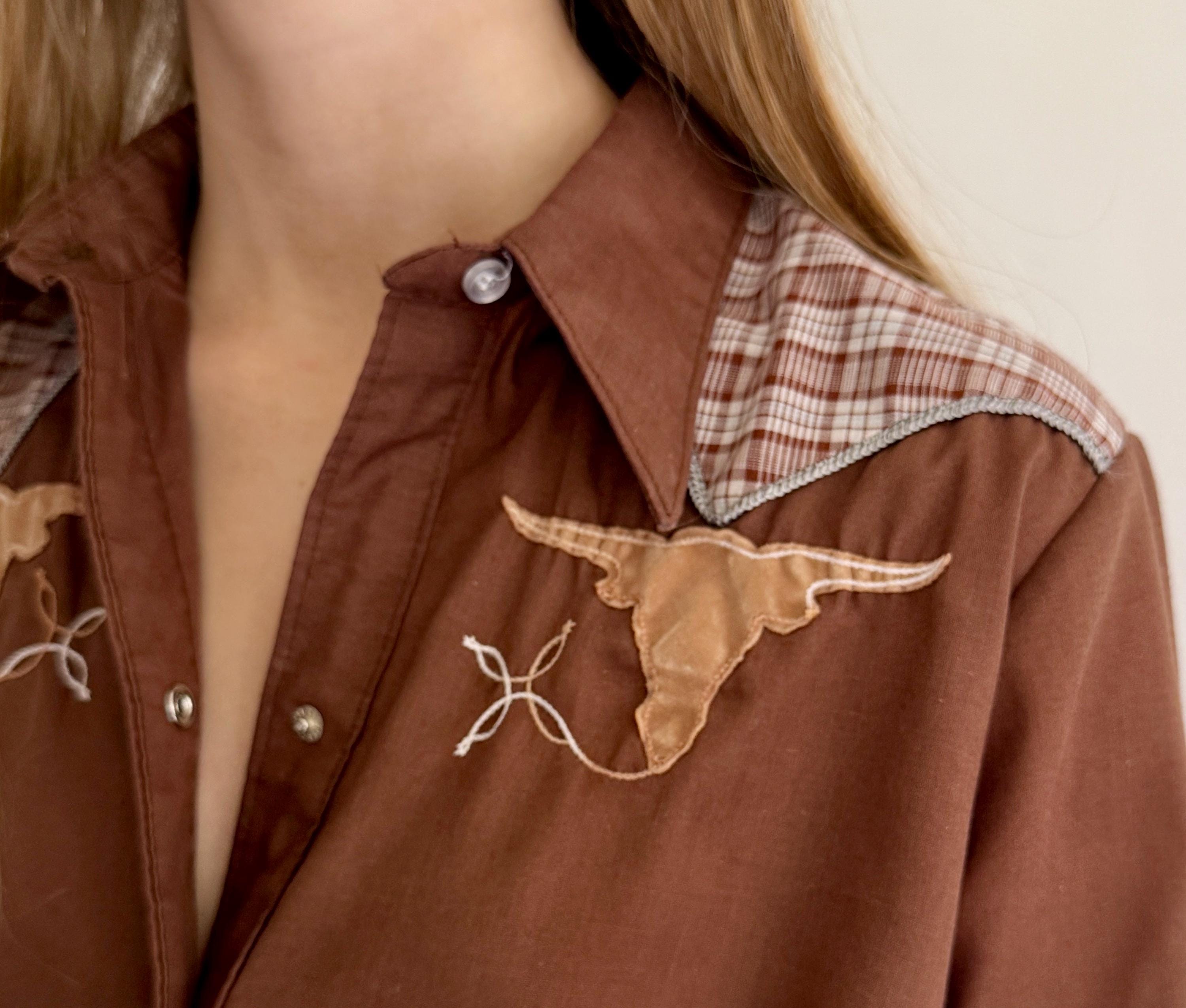 Rare and collectible vintage Rockmount Ranch Wear Western pearl snap shirt with short horn bull head appliqué
