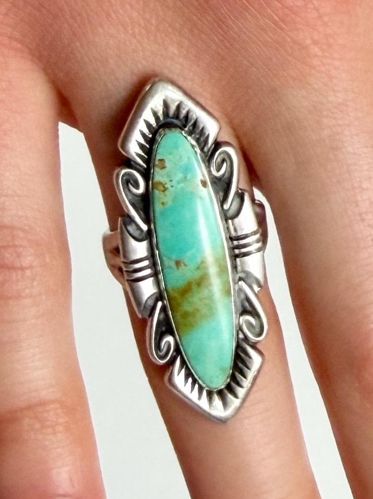 Long vintage Bell Trading Post Native American Navajo sterling silver and turquoise ring