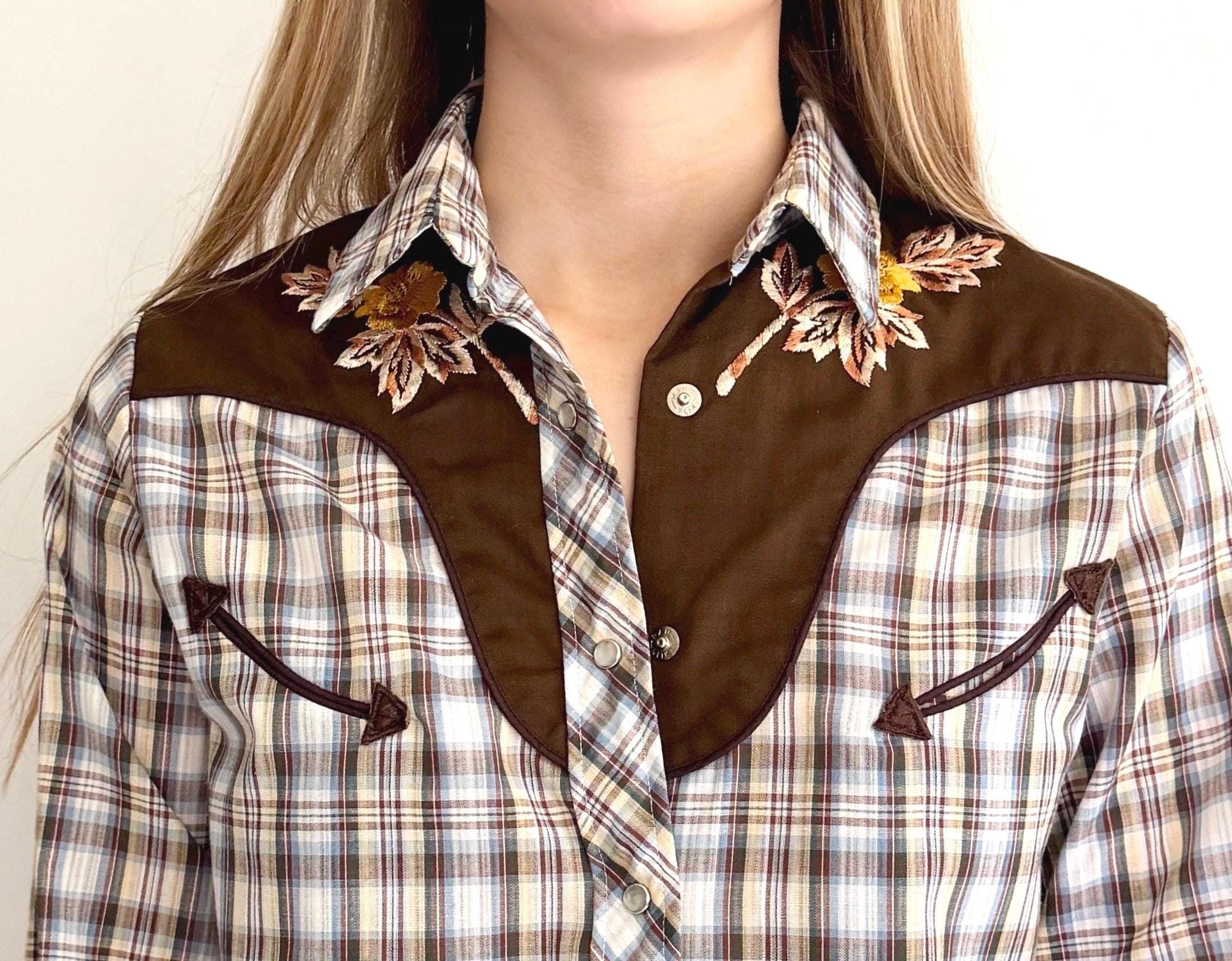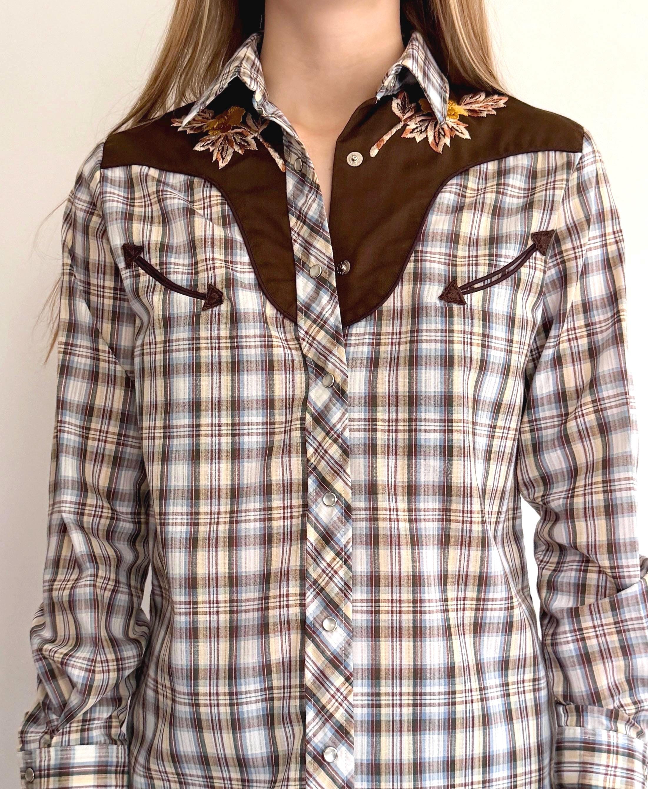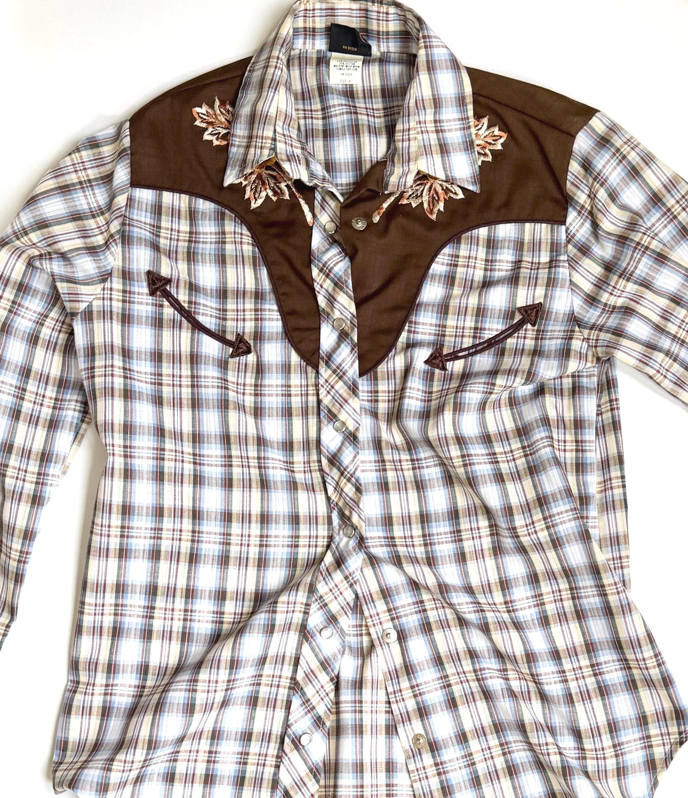 Vintage 70's Western plaid snap shirt with floral embroidery