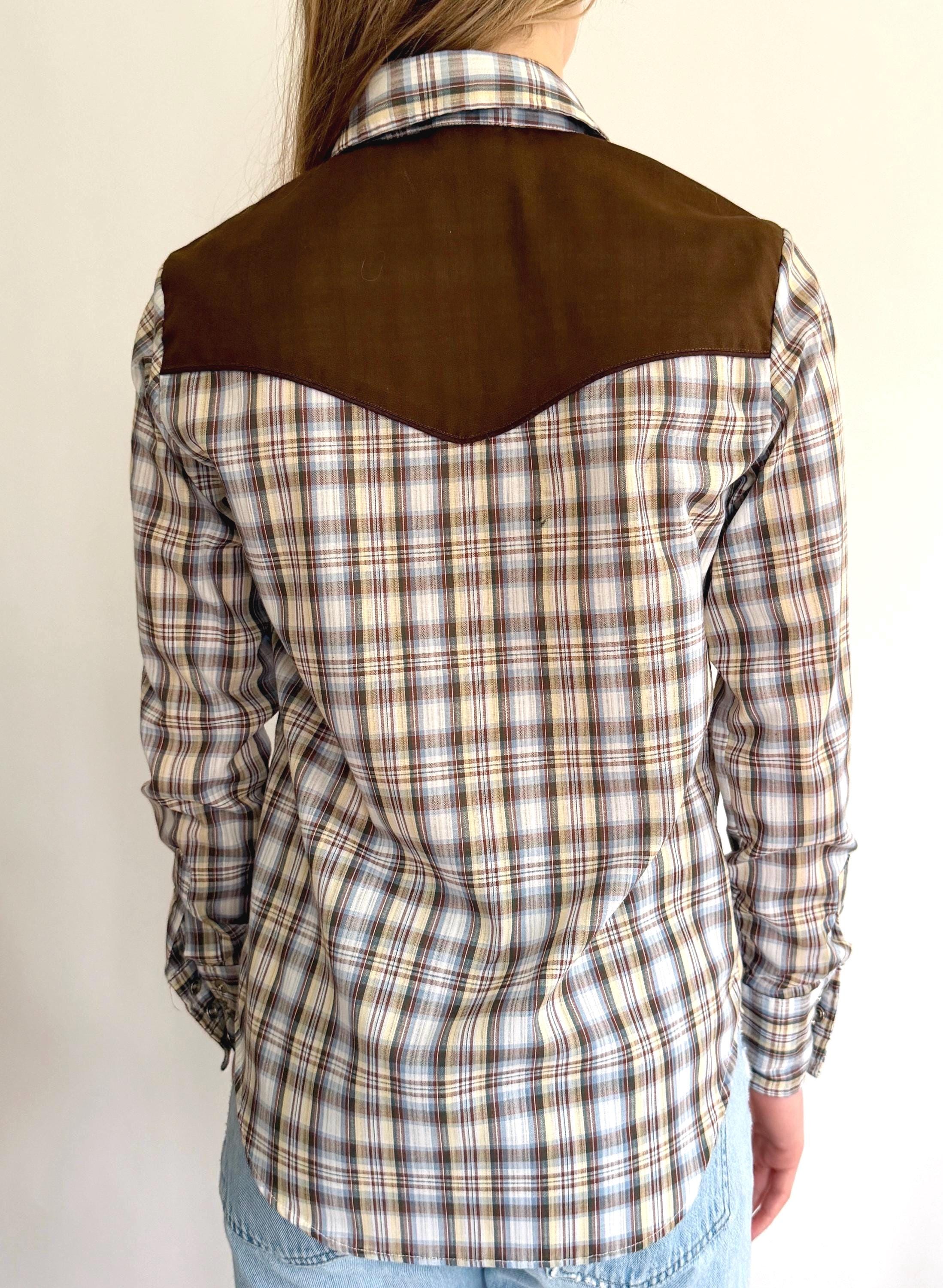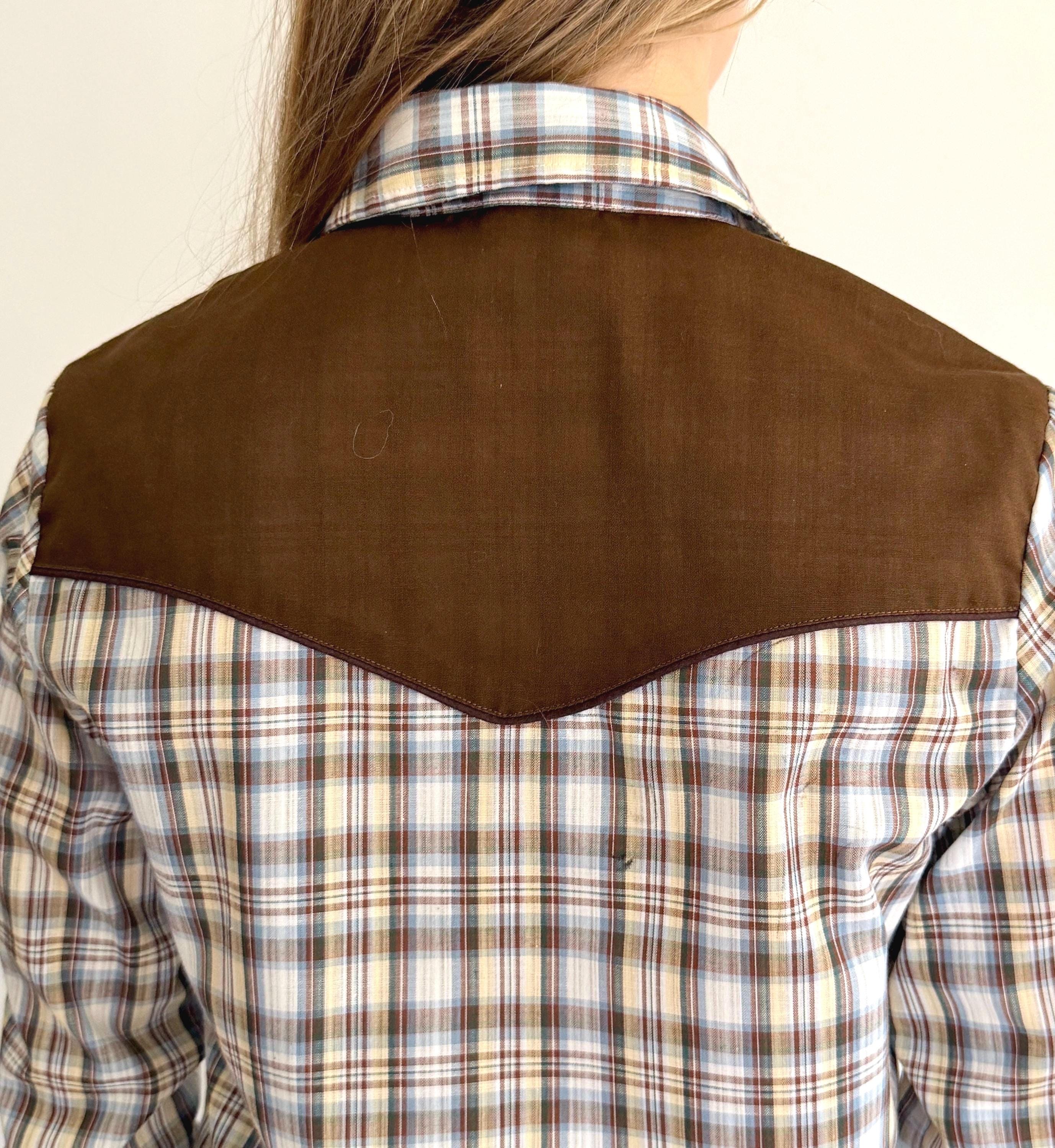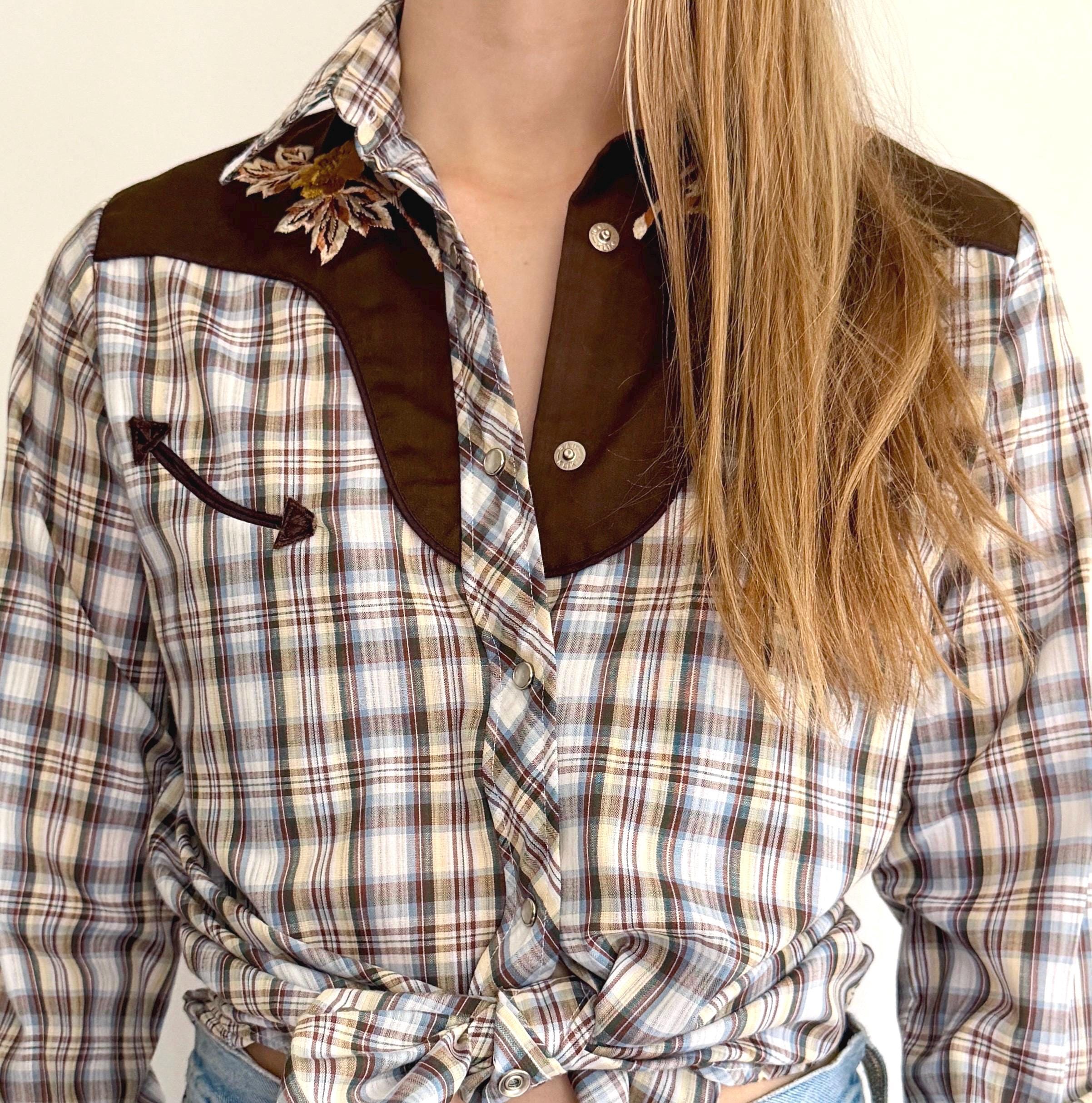 Vintage 70's Western plaid snap shirt with floral embroidery
