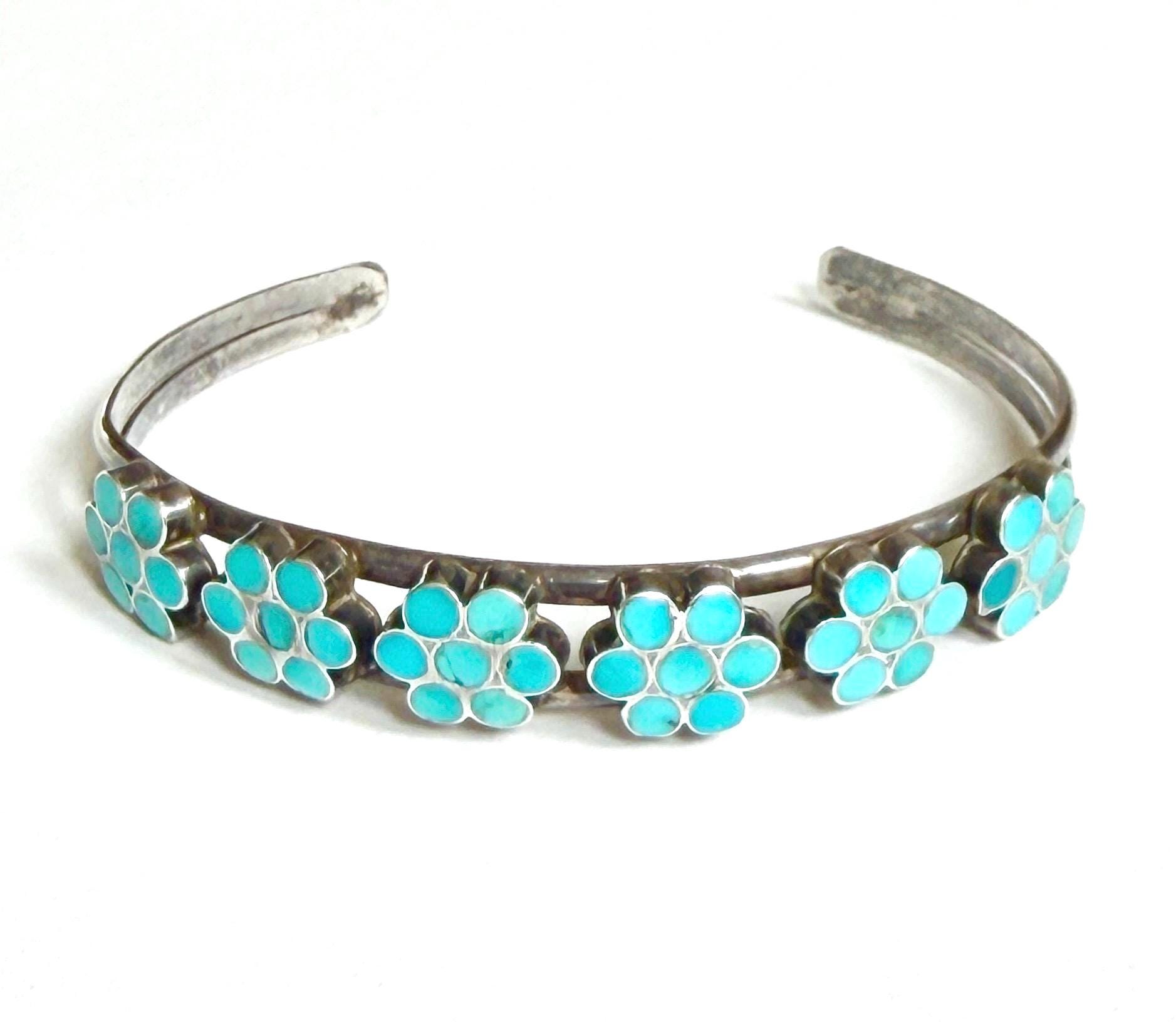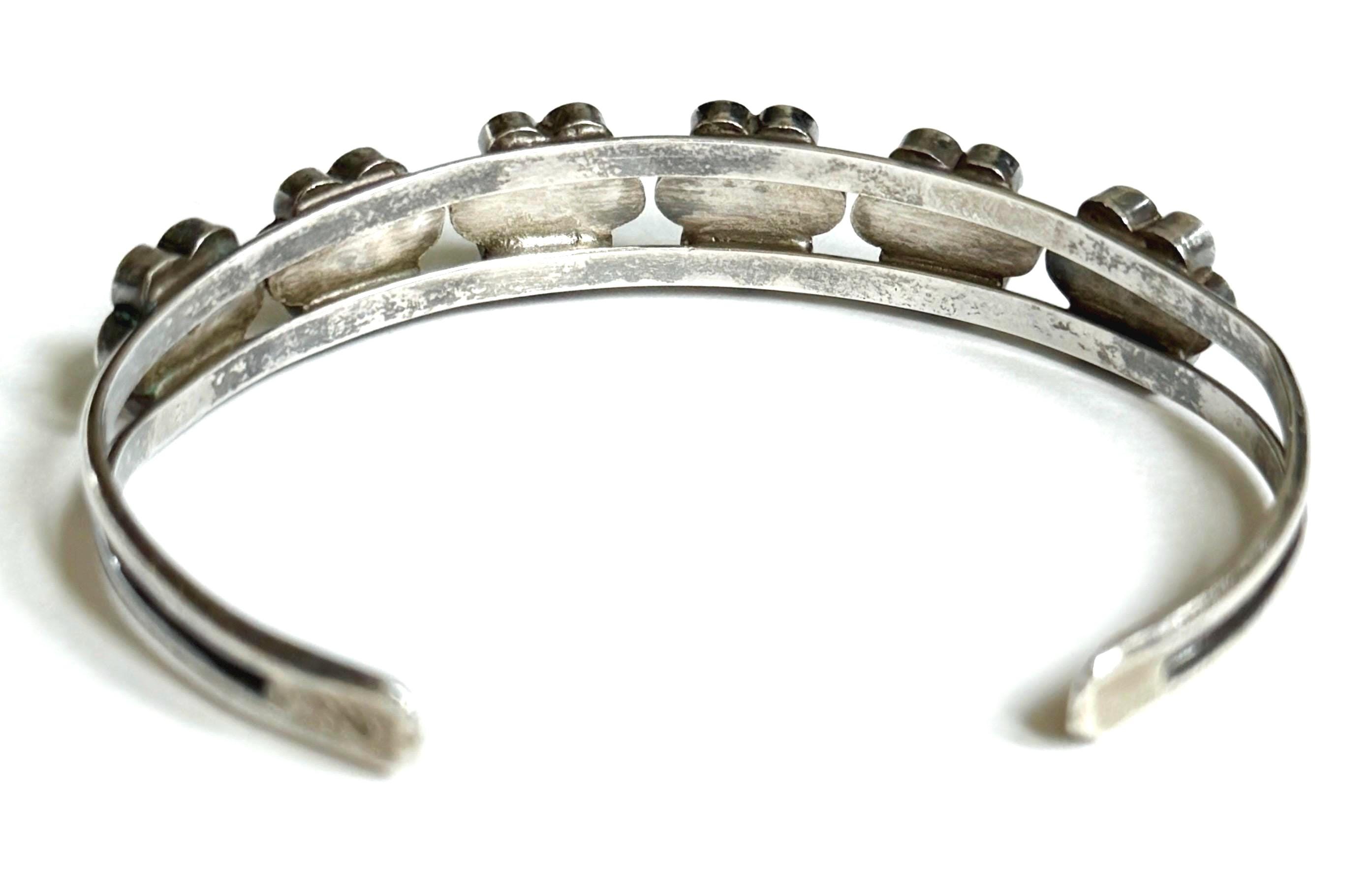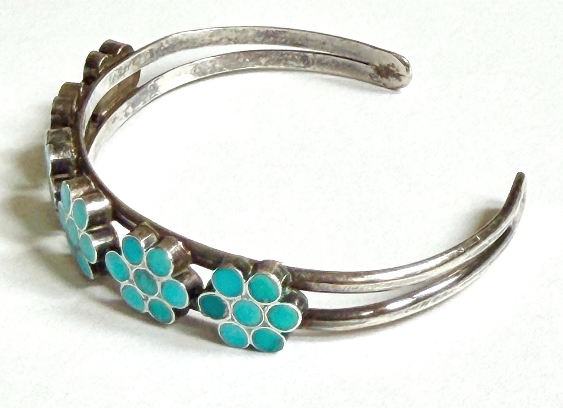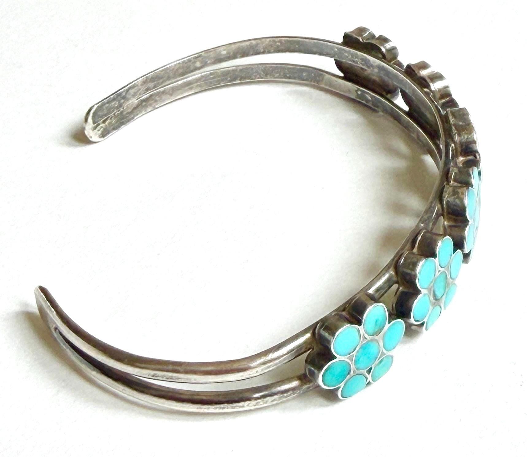 Native American Dishta sterling silver cuff bracelet with six flush inlaid turquoise flowers and split shank band