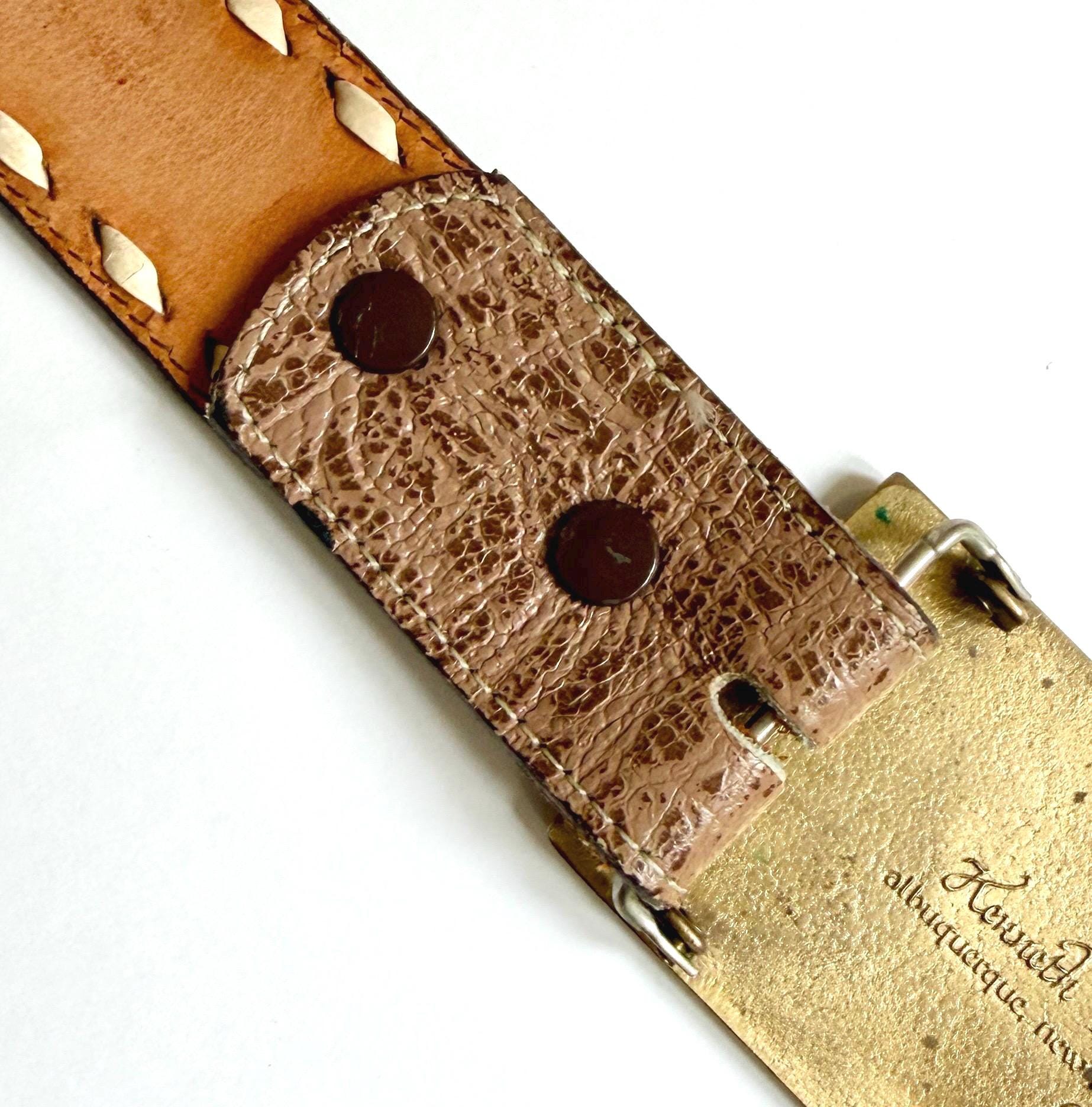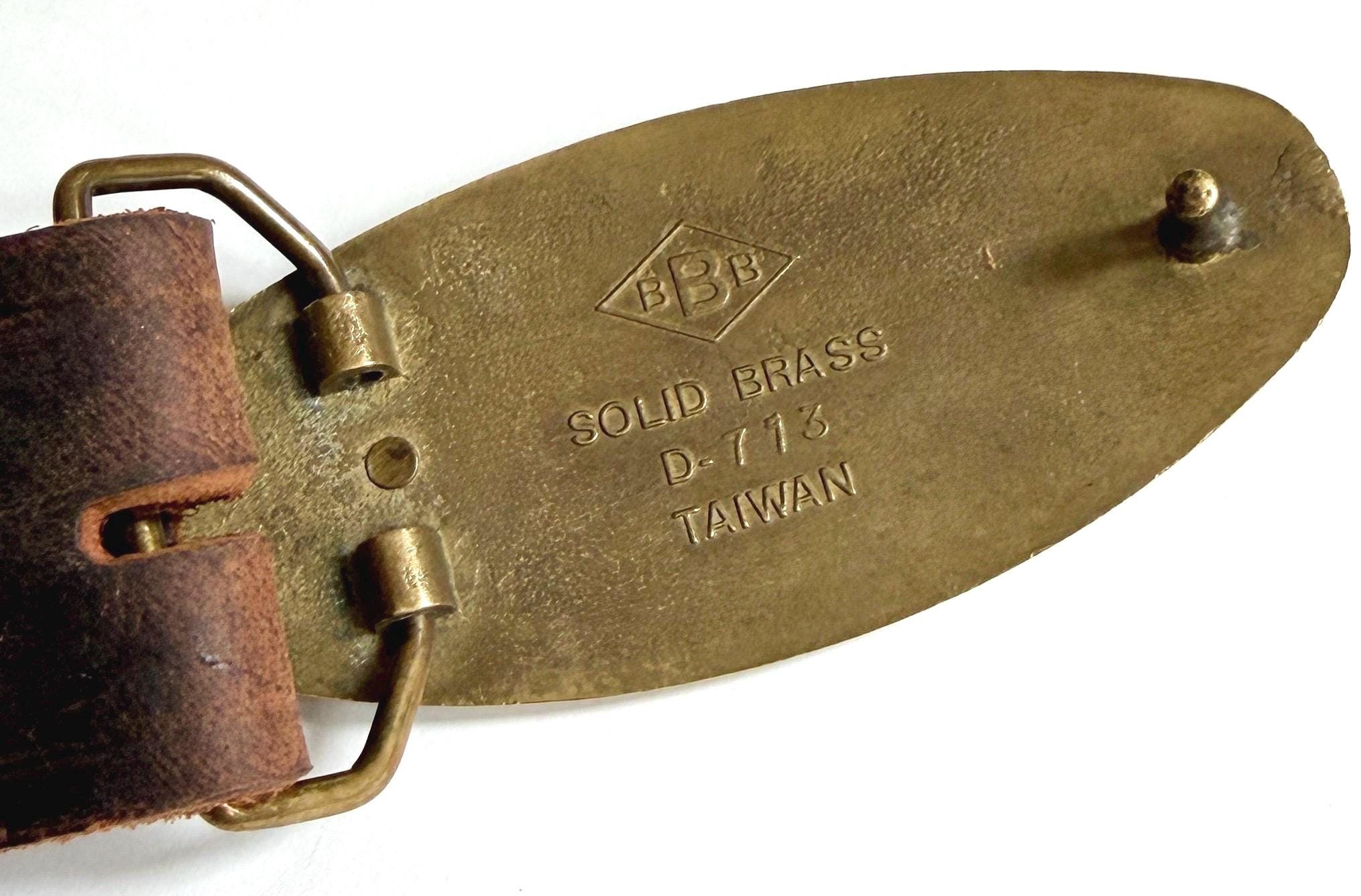 Summer music fest ready vintage 80's solid brass Country Music buckle on an aged dark brown leather belt strap
