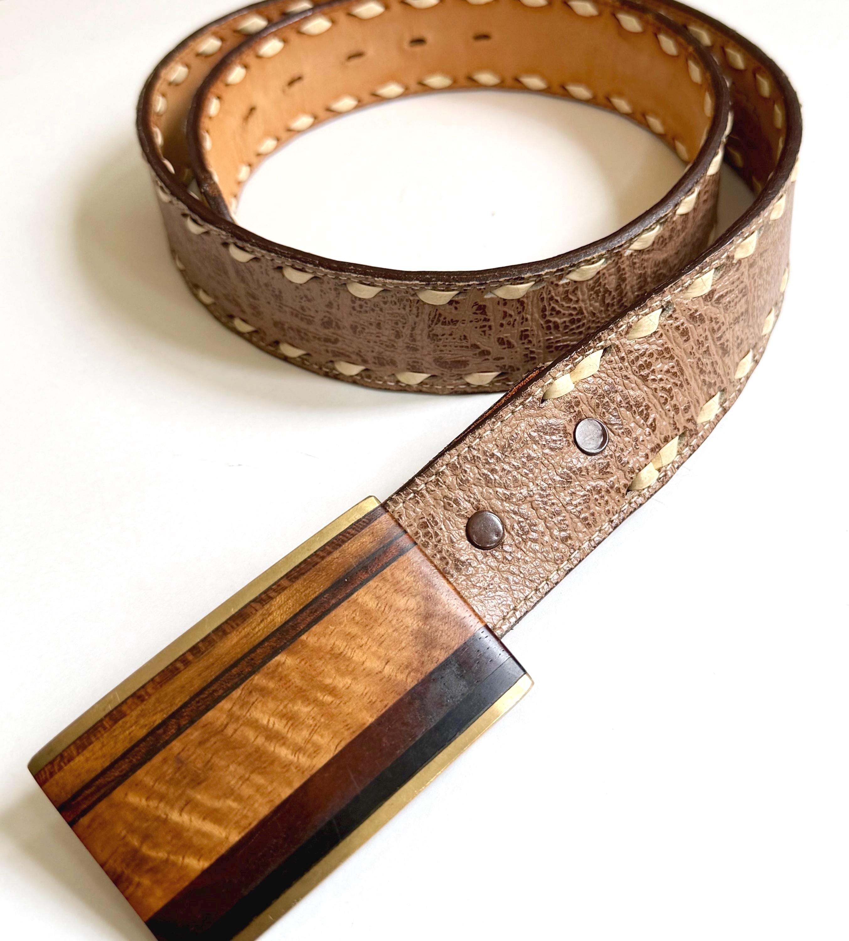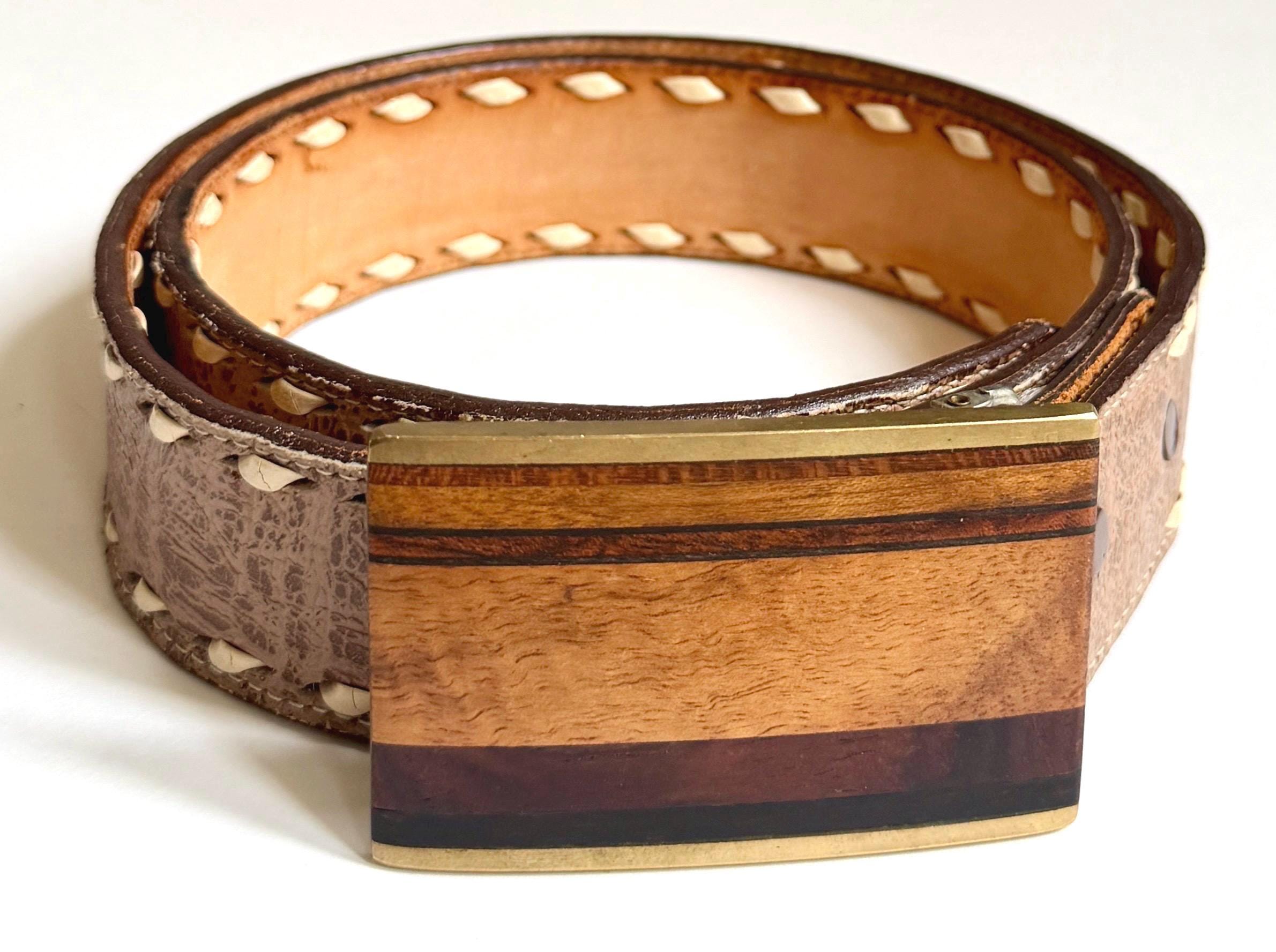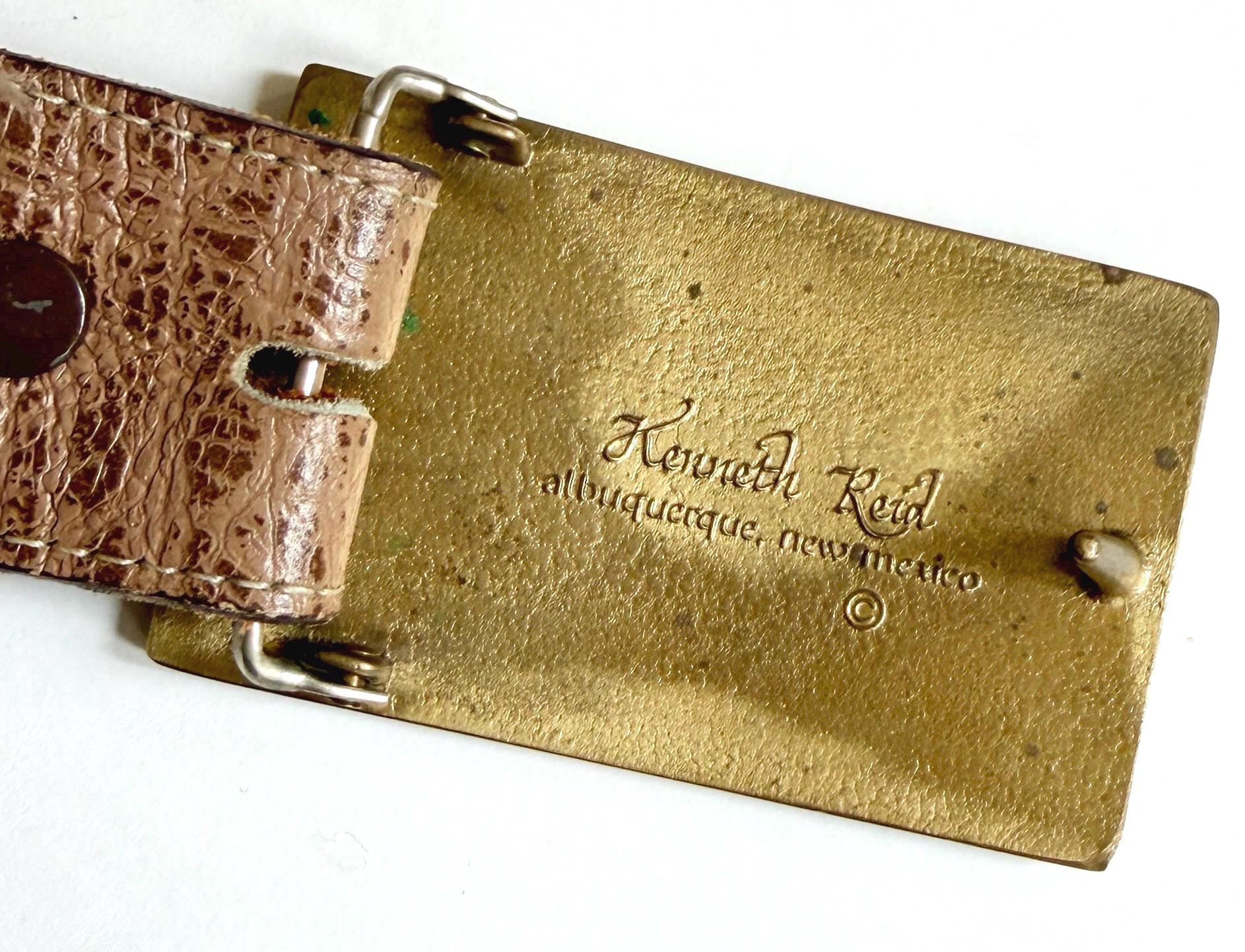 Vintage Kenneth Reid (Albuquerque, NM) brass and wood inlaid belt buckle on Western leather strap