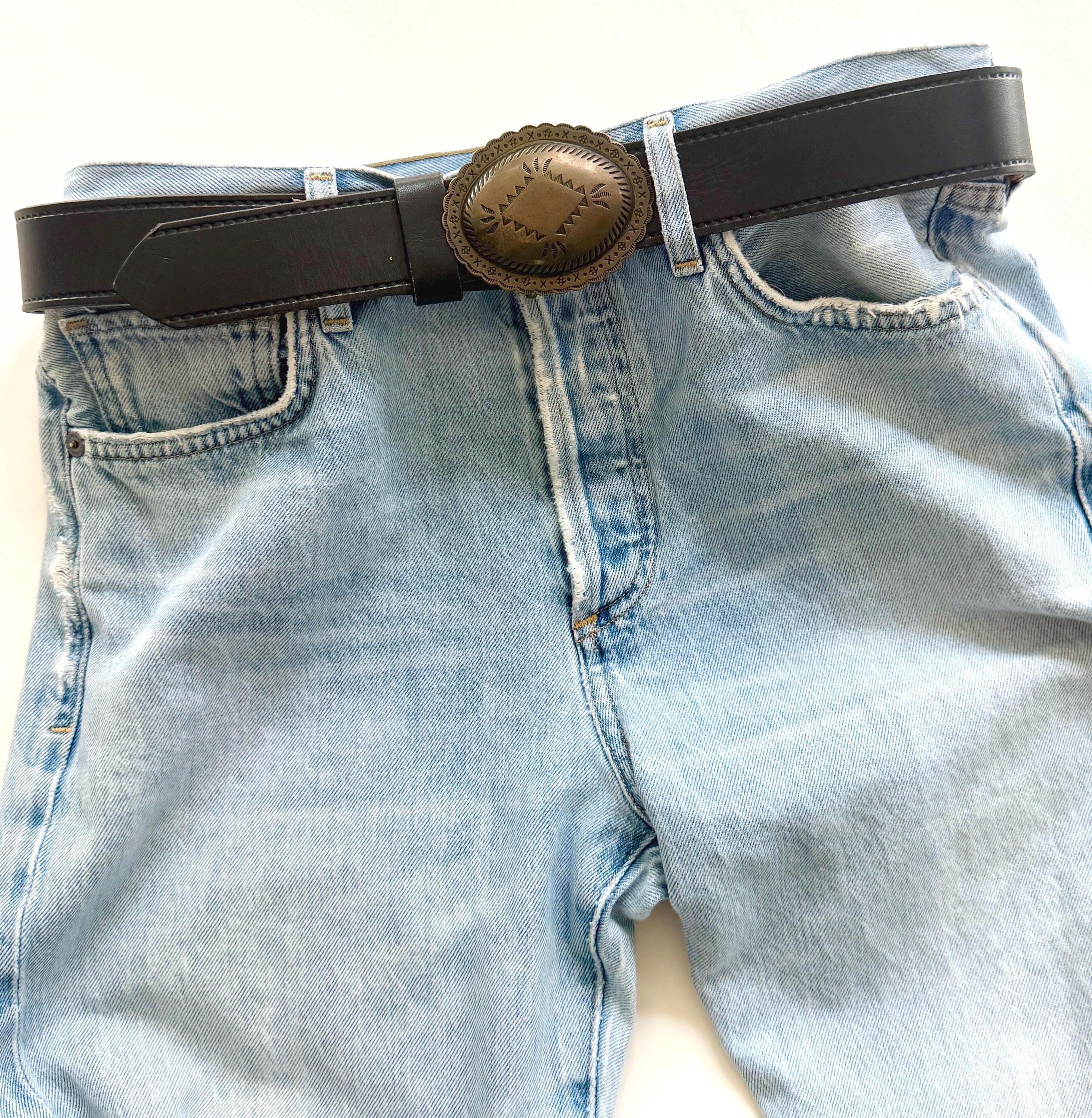 Vintage solid brass Navajo-style concho buckle on a black full grain leather strap