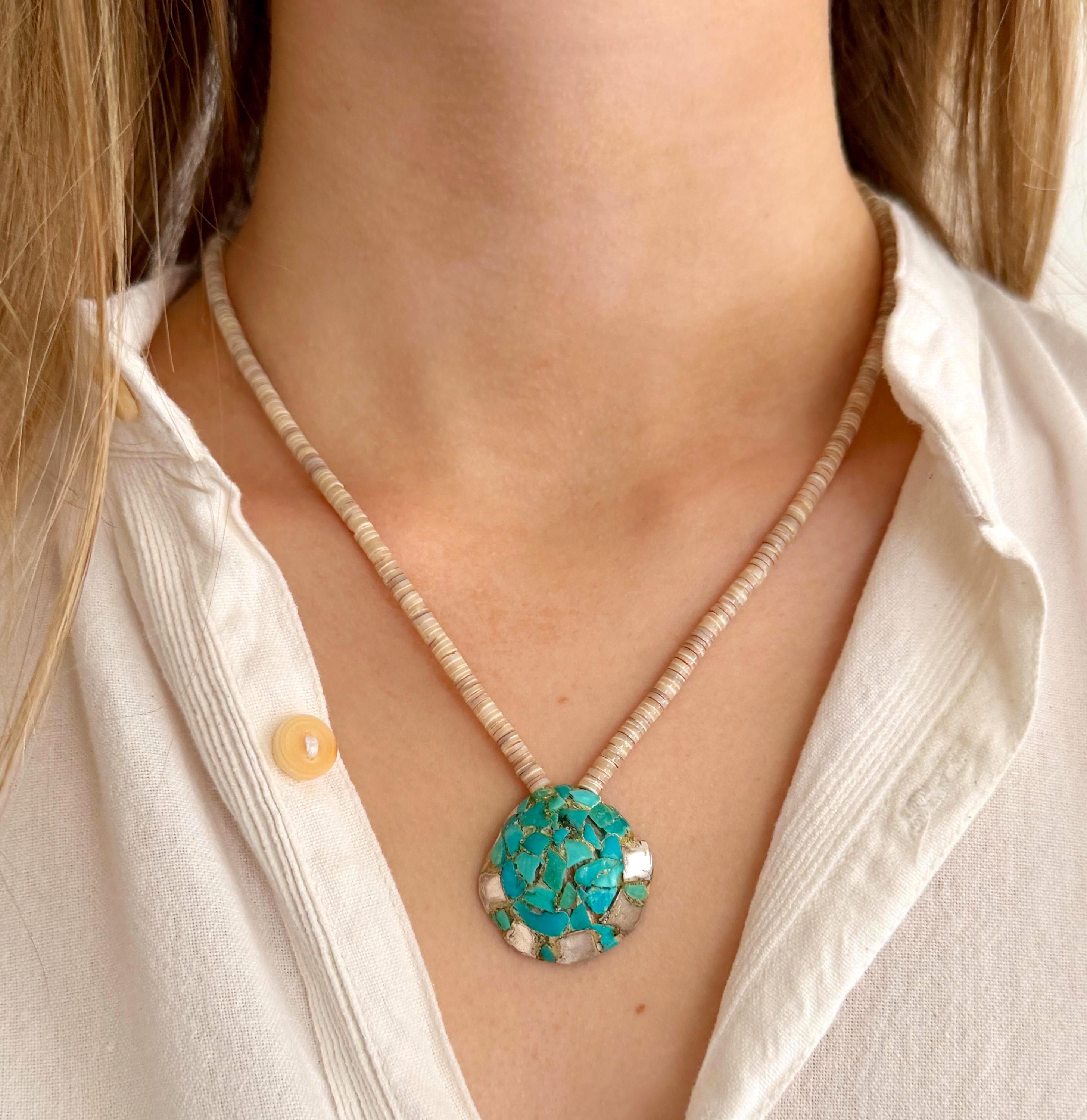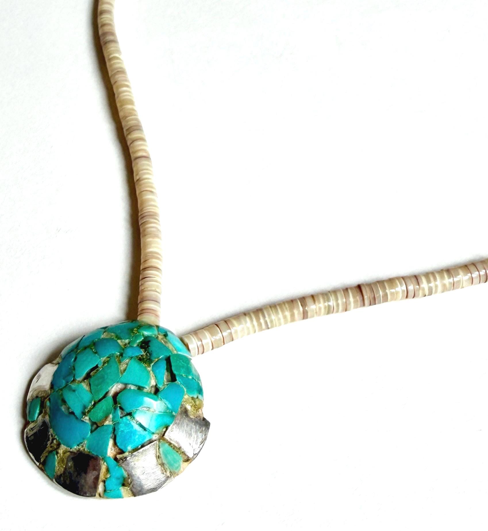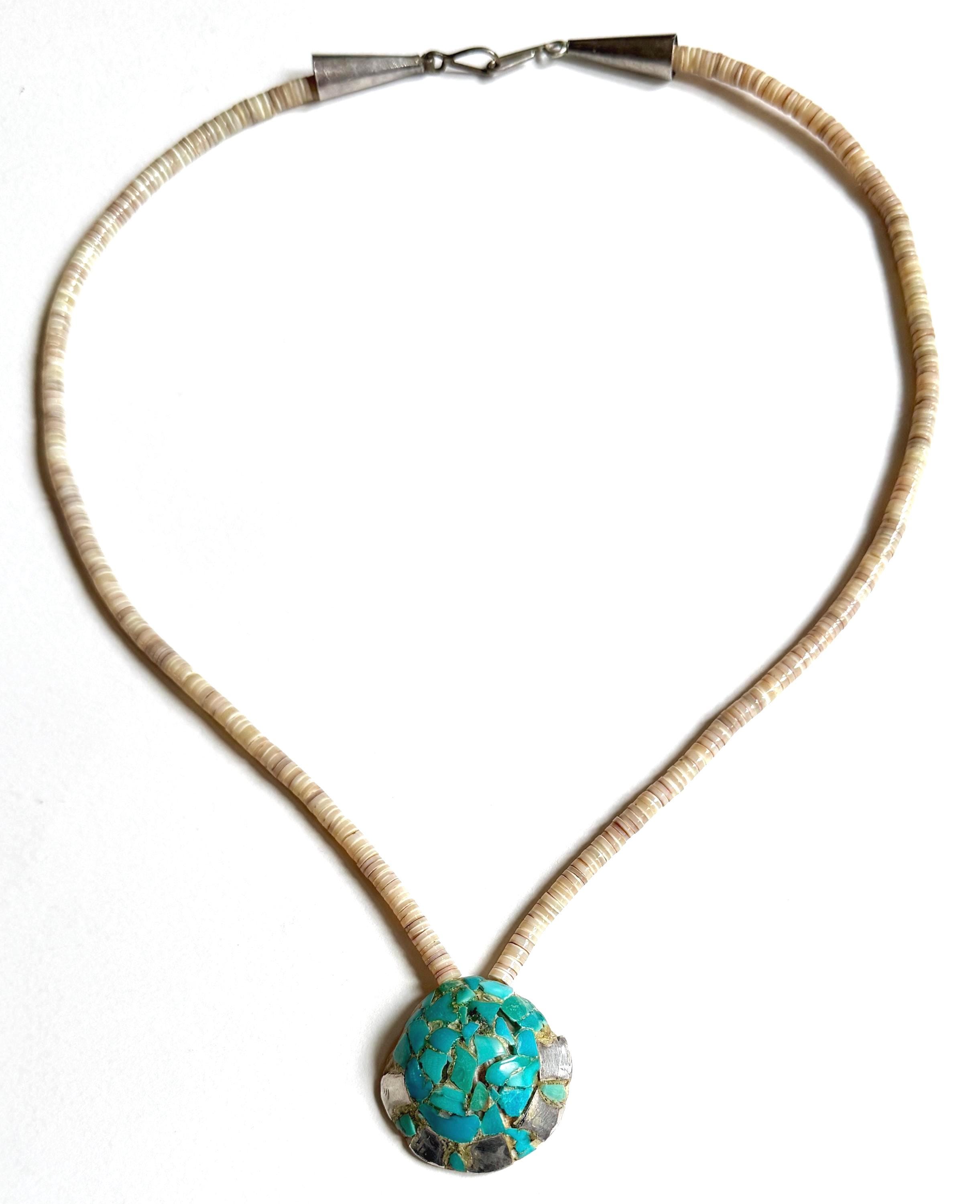 Old vintage Native American shell beaded necklace with mosaic turquoise inlaid pendant on top of a natural shell base