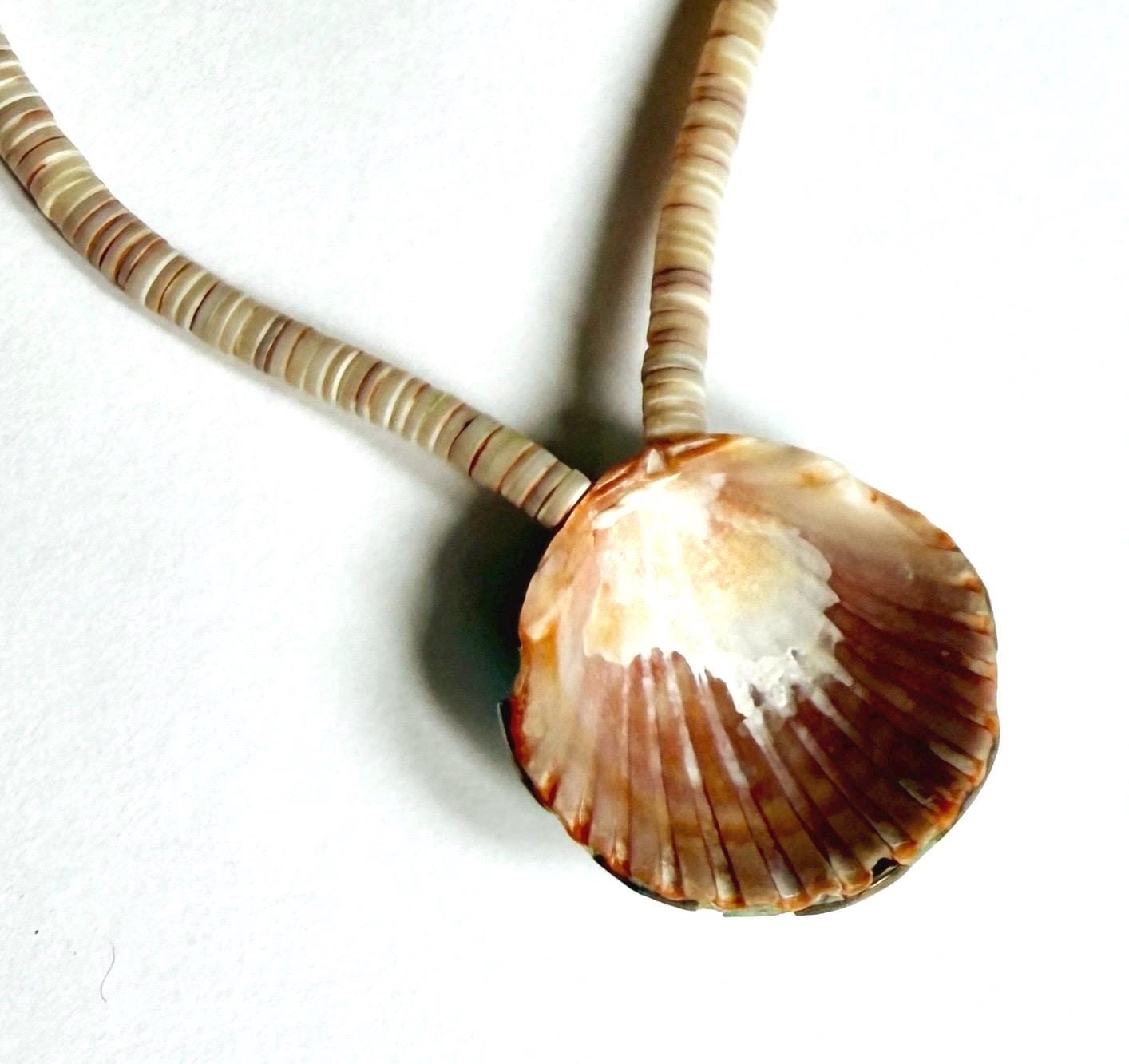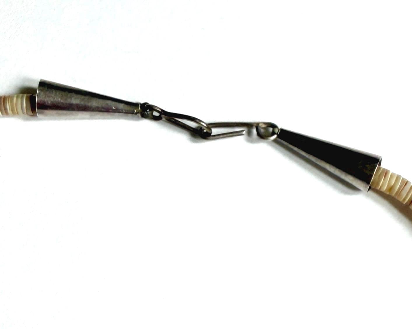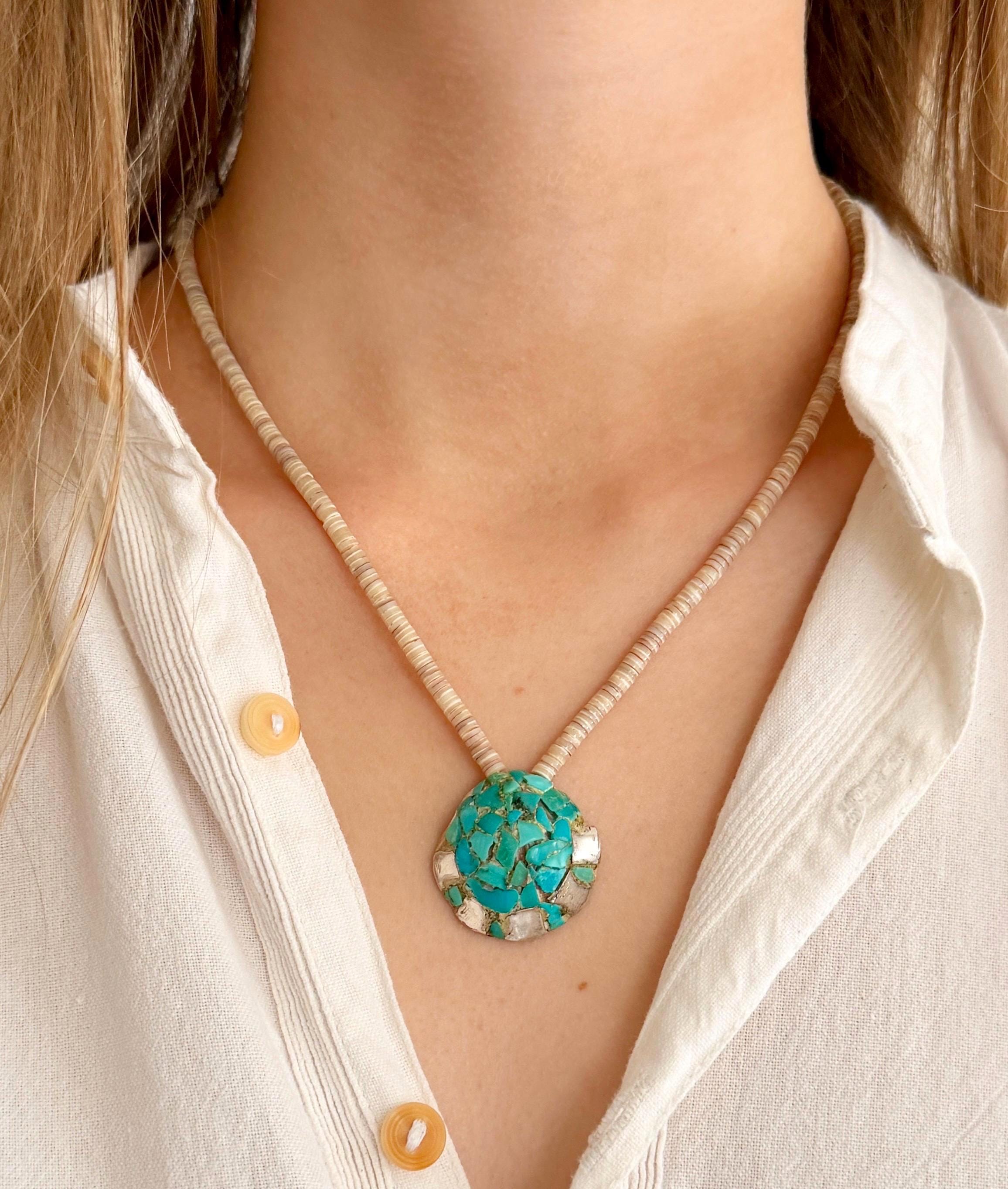 Old vintage Native American shell beaded necklace with mosaic turquoise inlaid pendant on top of a natural shell base