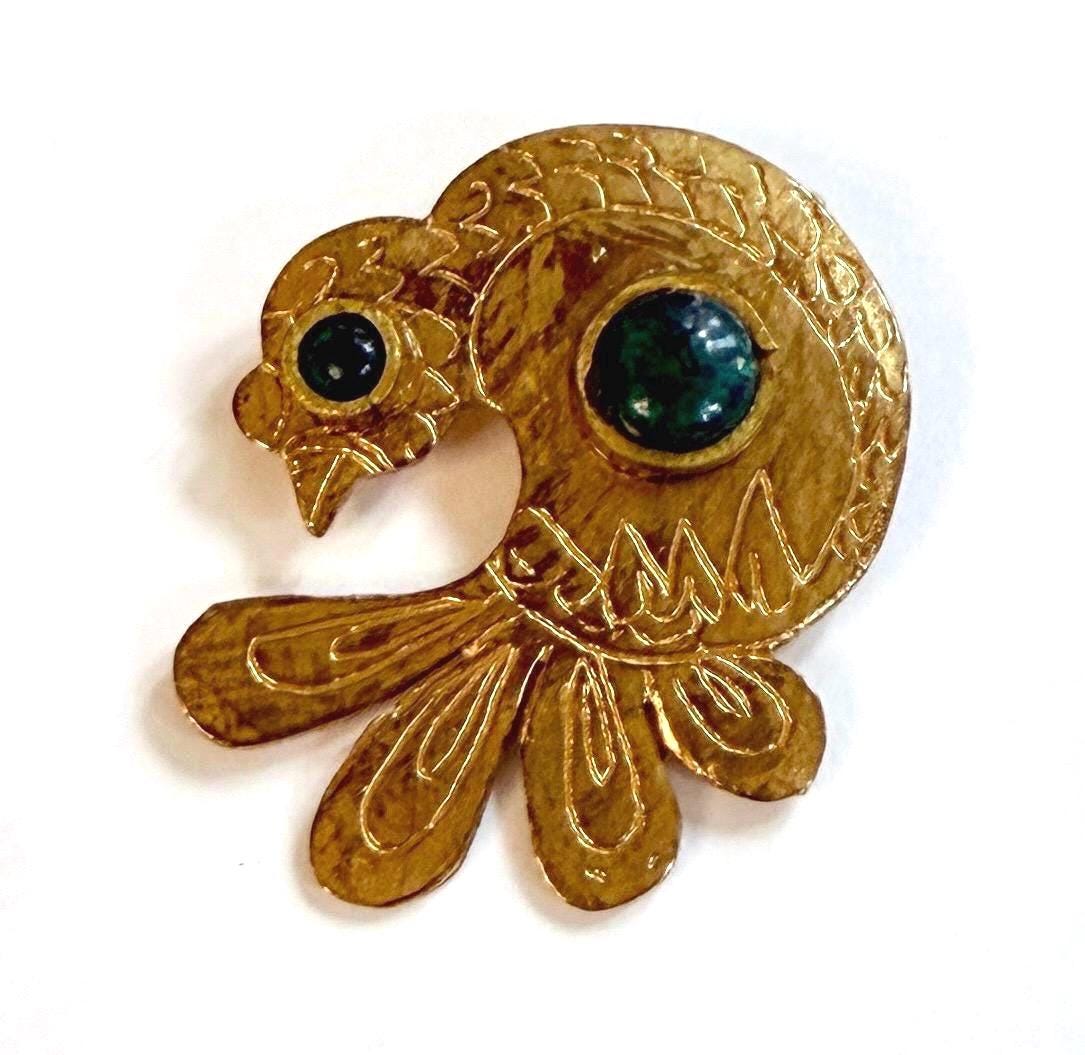 Mid Century vintage gold bird brooch with dark green stone accents