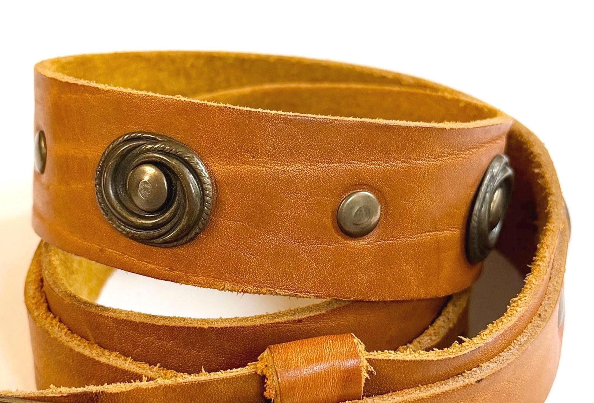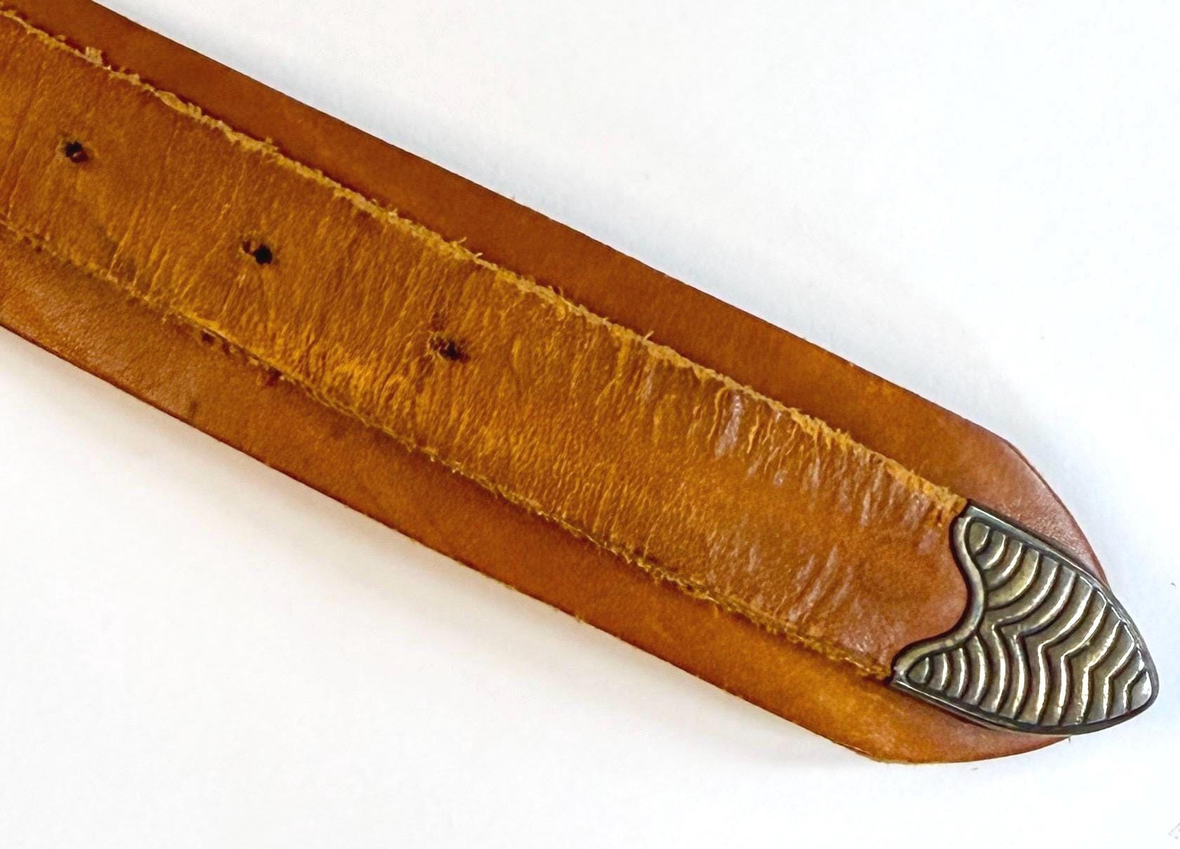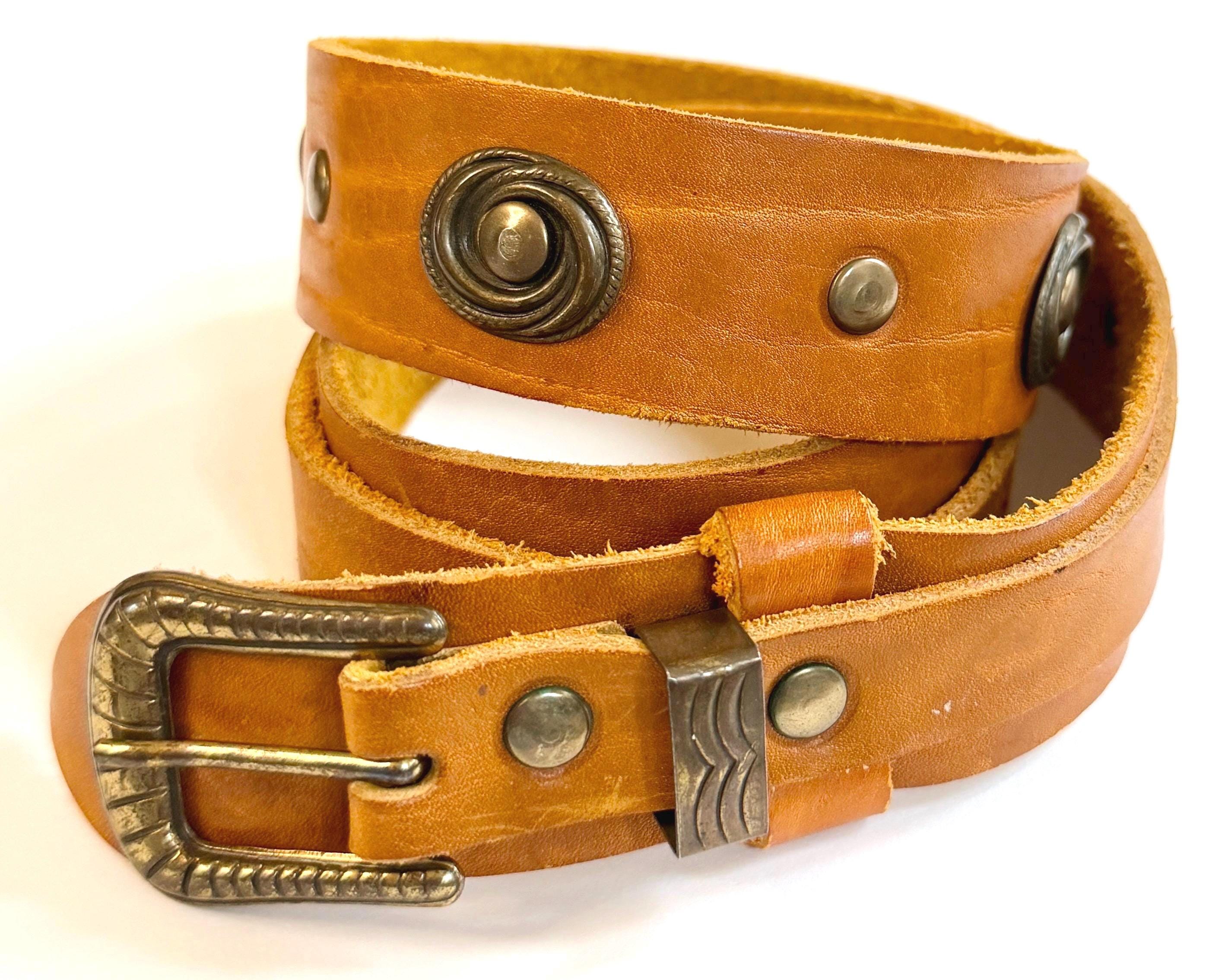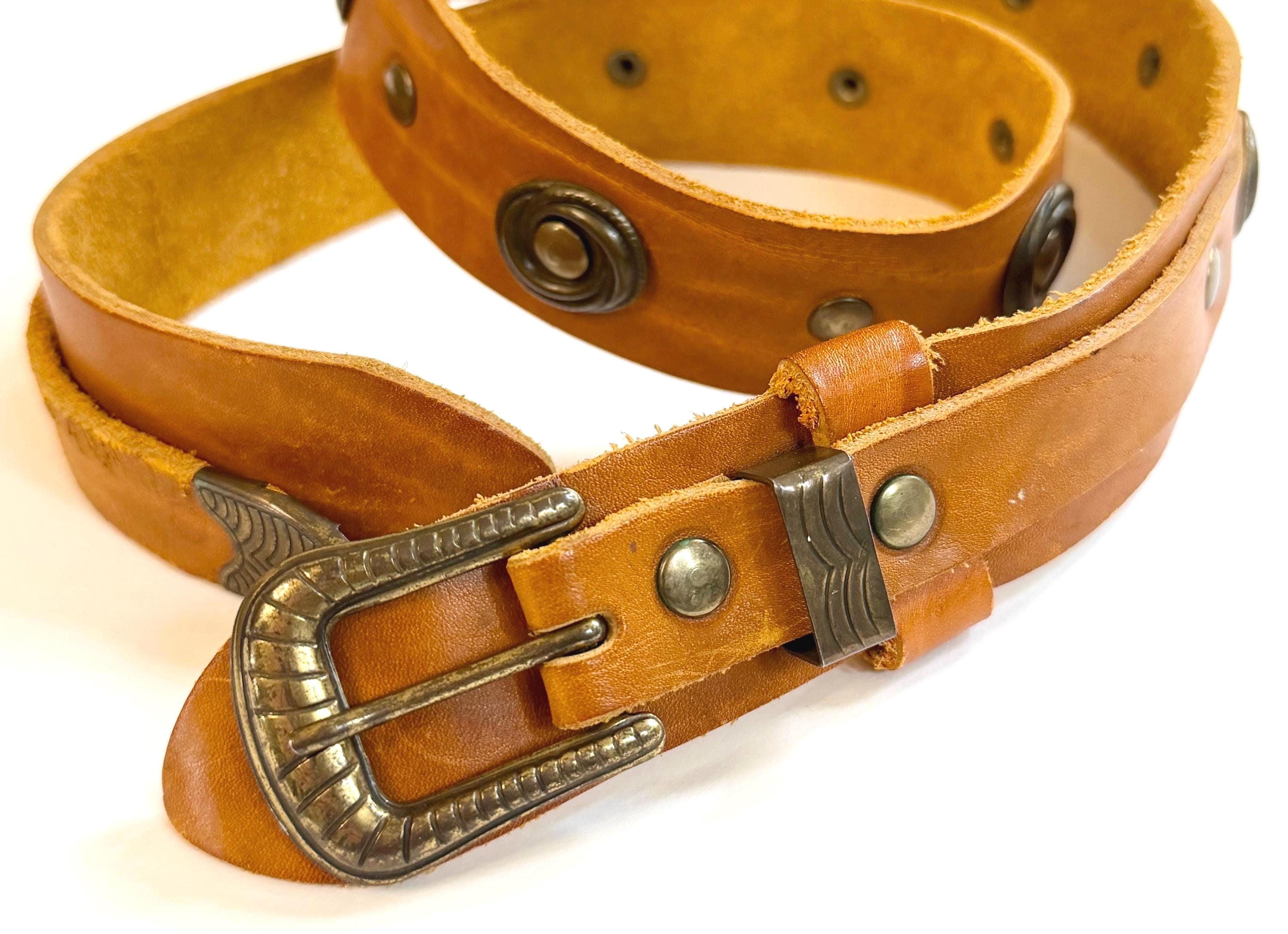 Soft handmade vintage tan leather belt with brass tone buckle, concho studs and Western tip