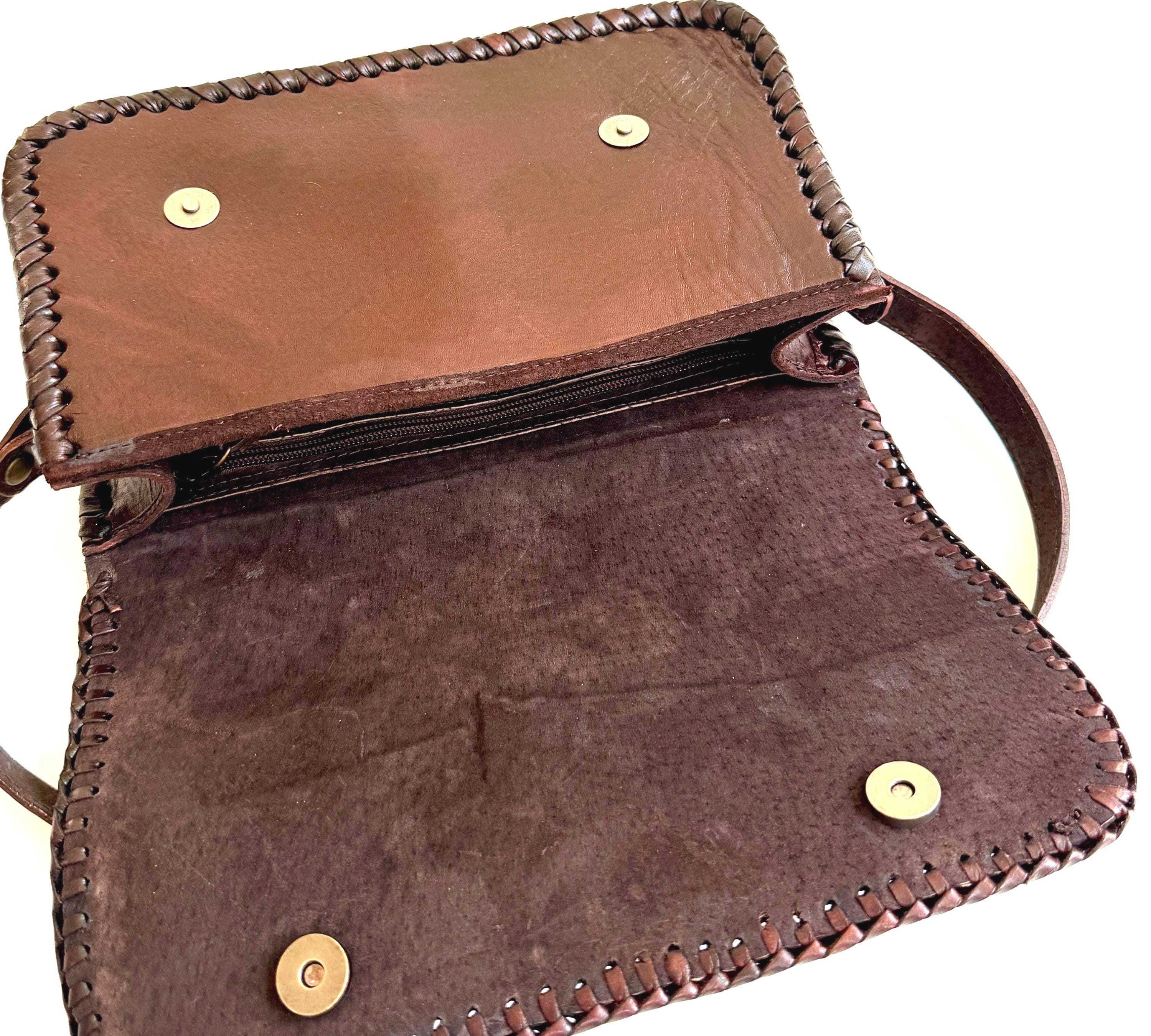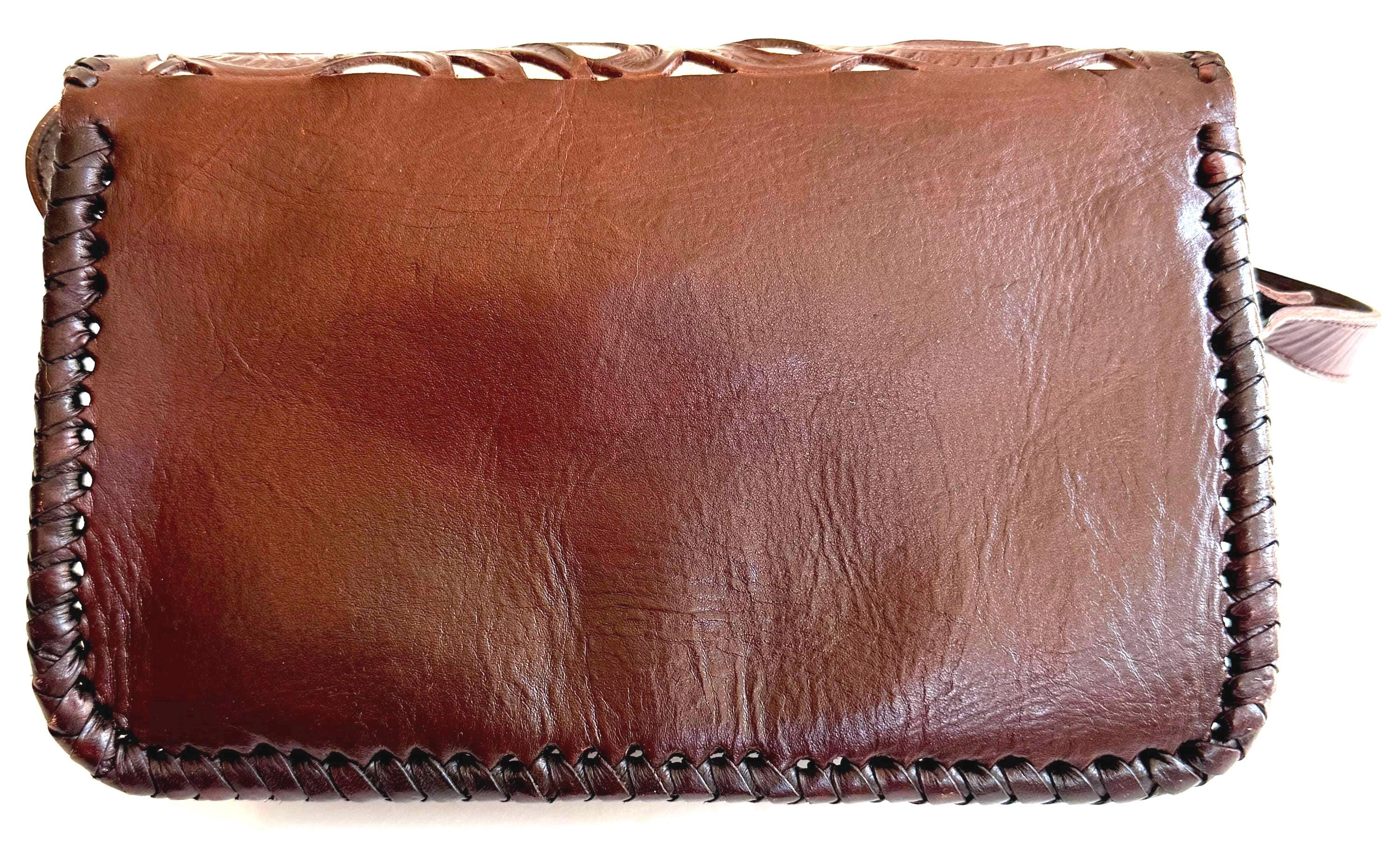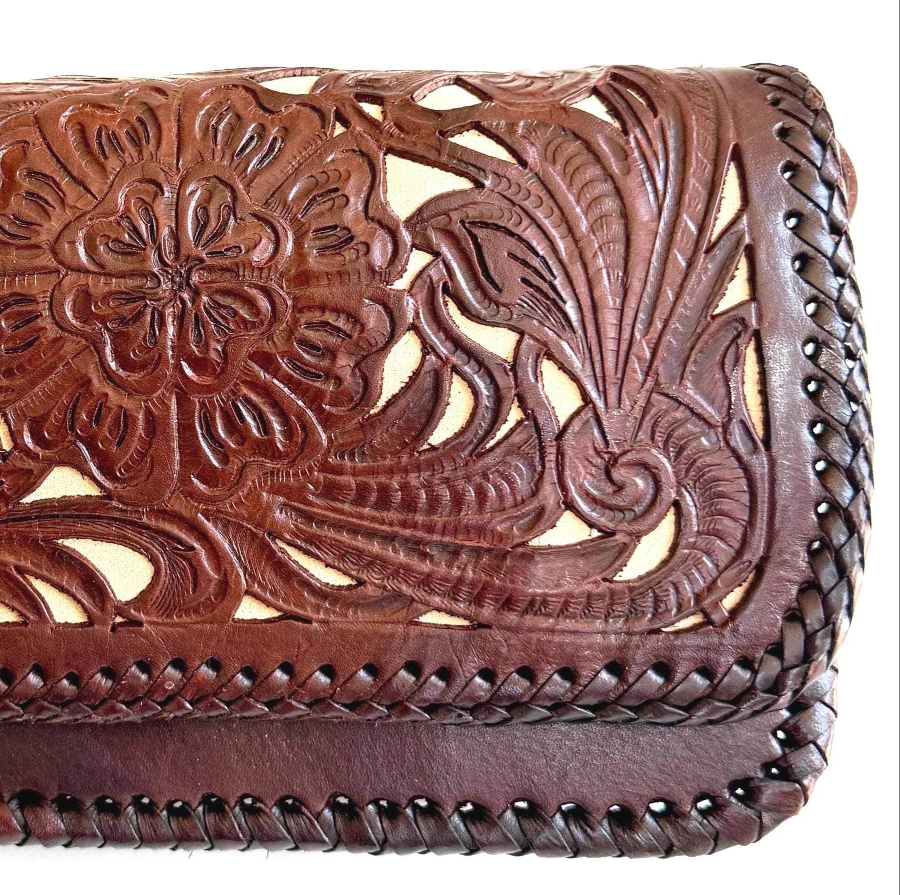 Vintage floral tooled leather shoulder bag with braided leather trim