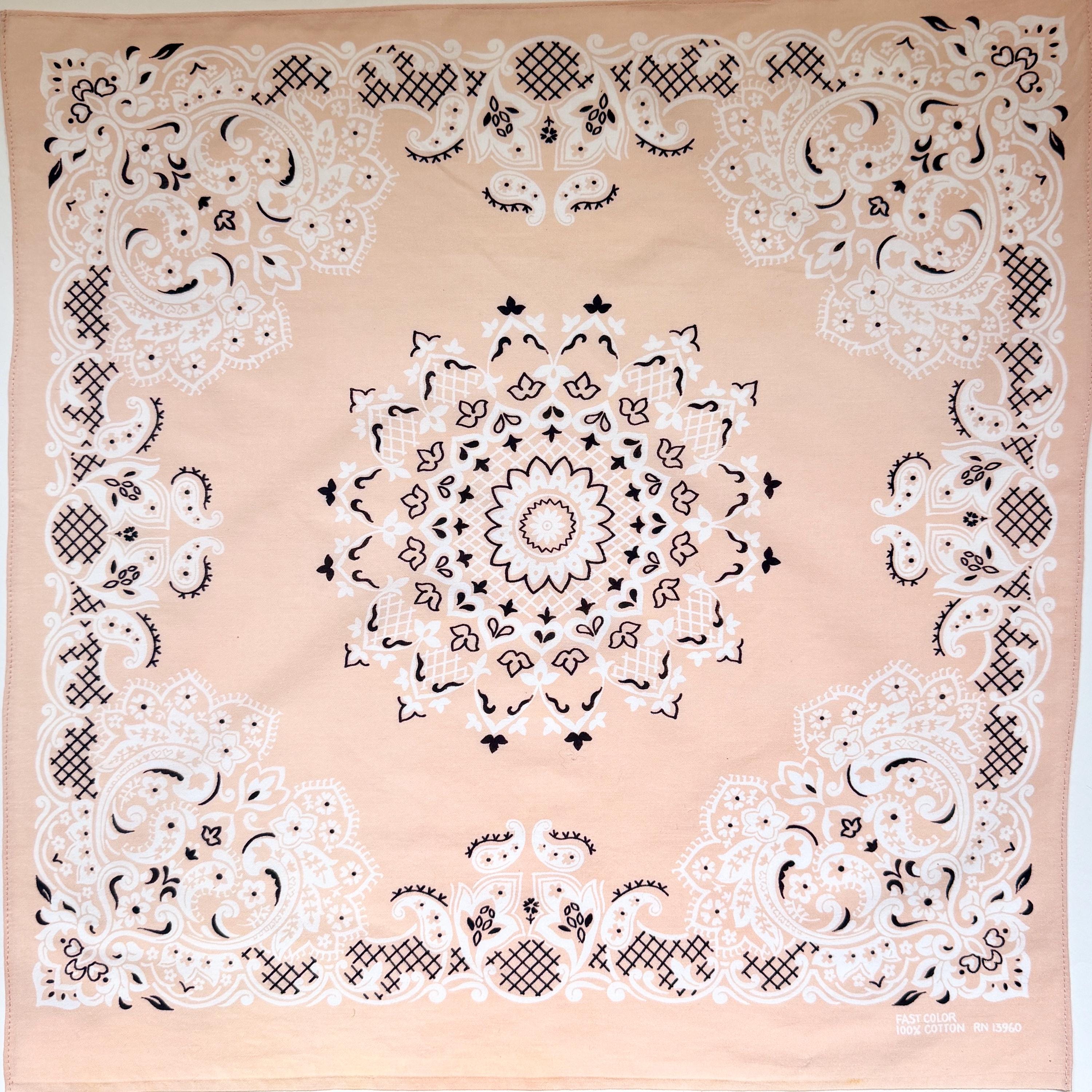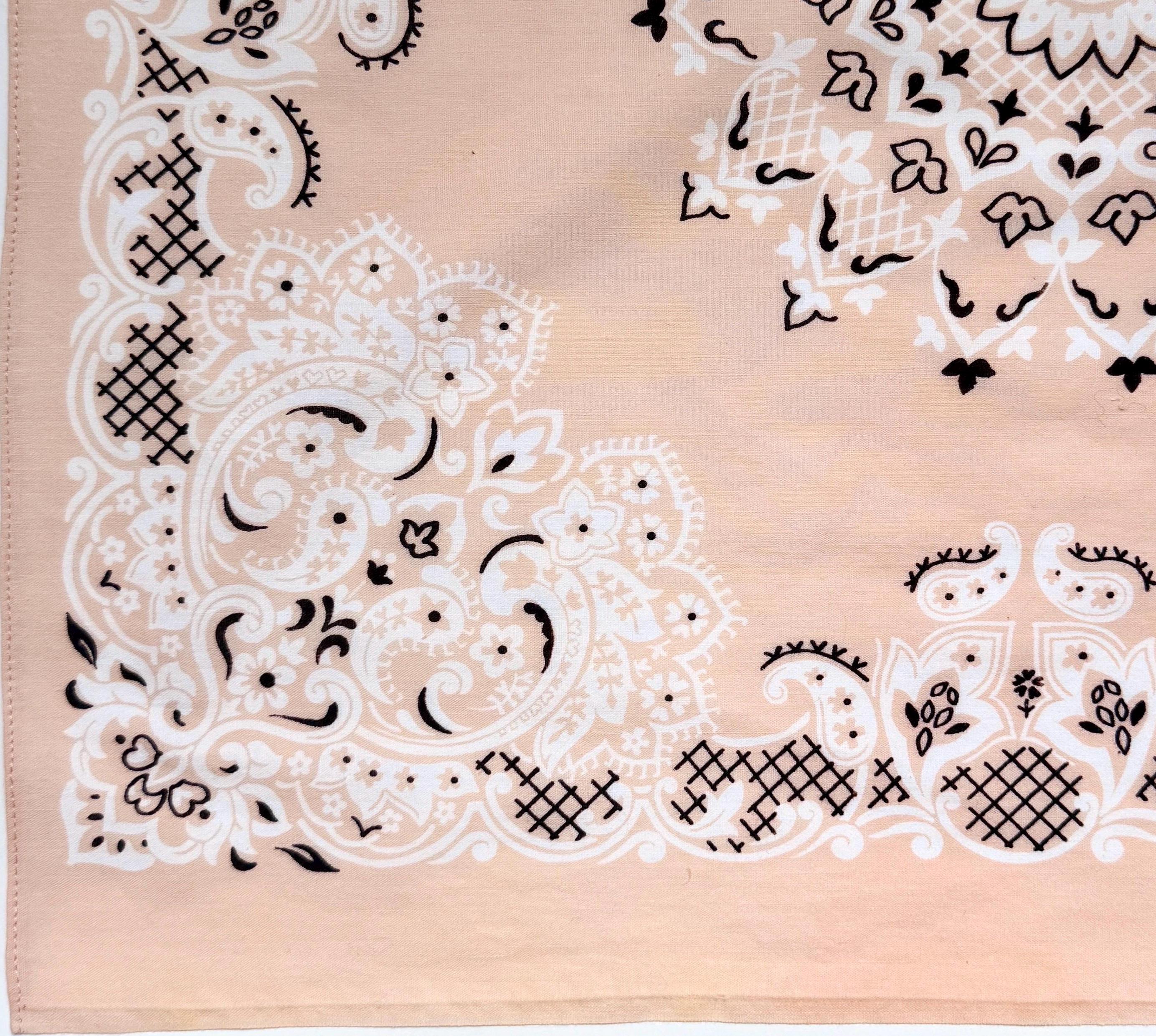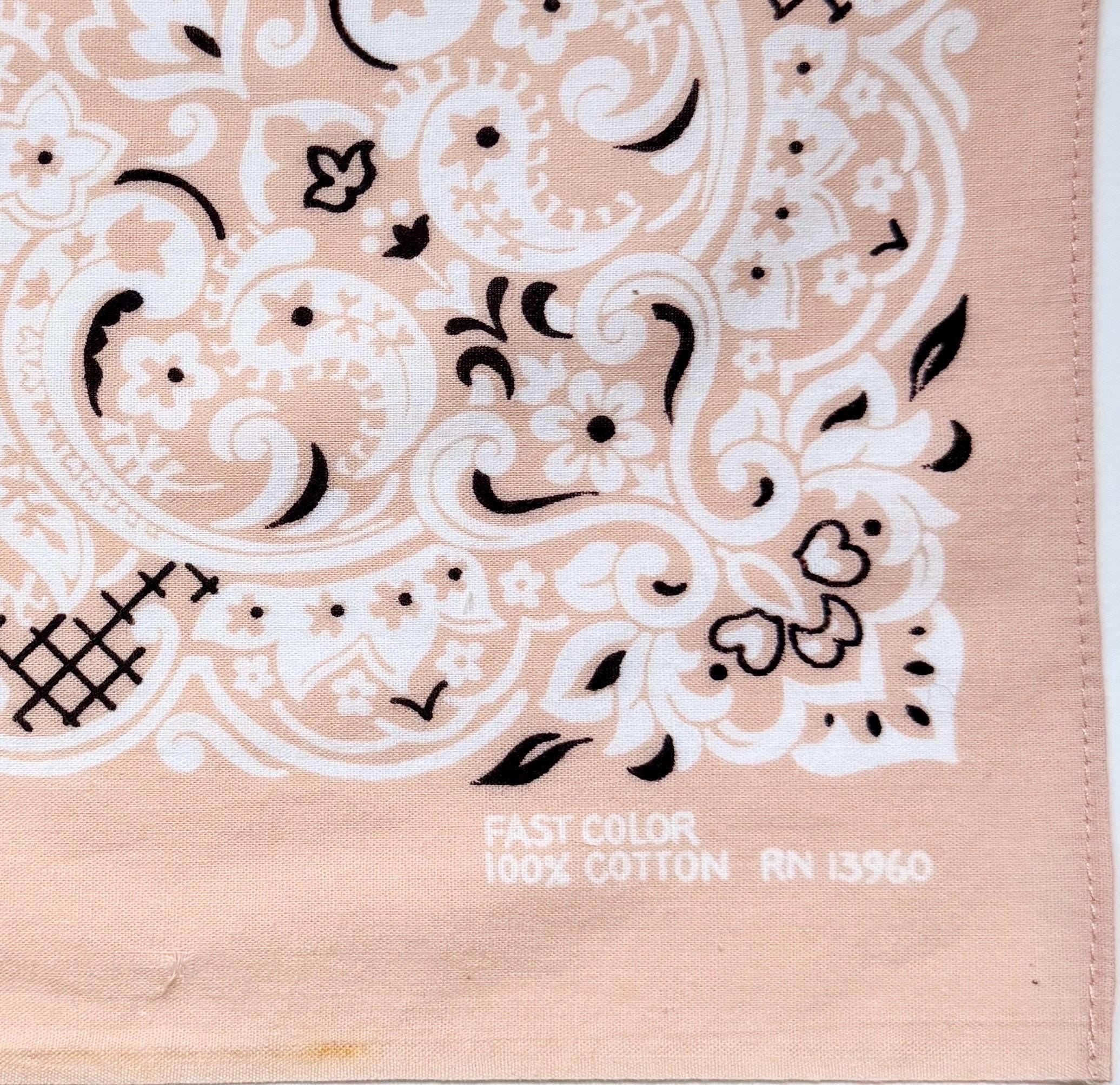 We did back flips when we found this old stock vintage 50's/60's Fast Color factory bandana print fabric in a rare faded peach color! Our favorite local seamstress finished the job and transformed the fabric into 5 bandanas we now have to sell!