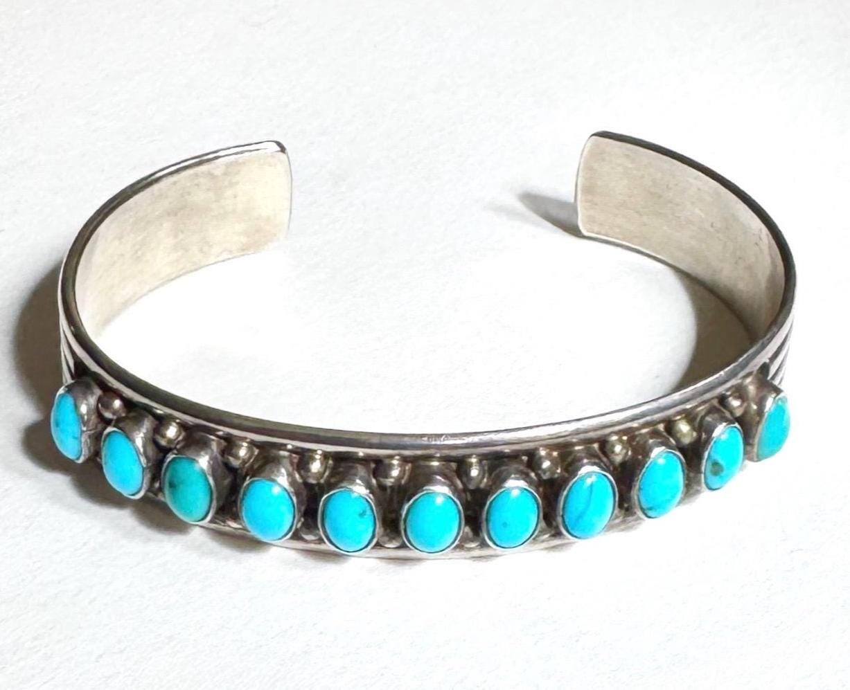 Vintage Native American Navajo sterling silver and multi stone turquoise cuff bracelet with ribbed railroad style band