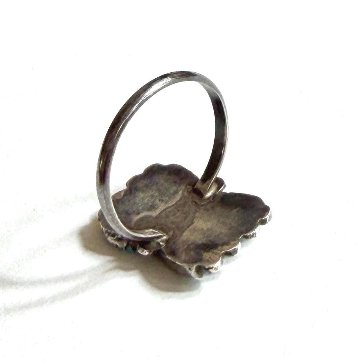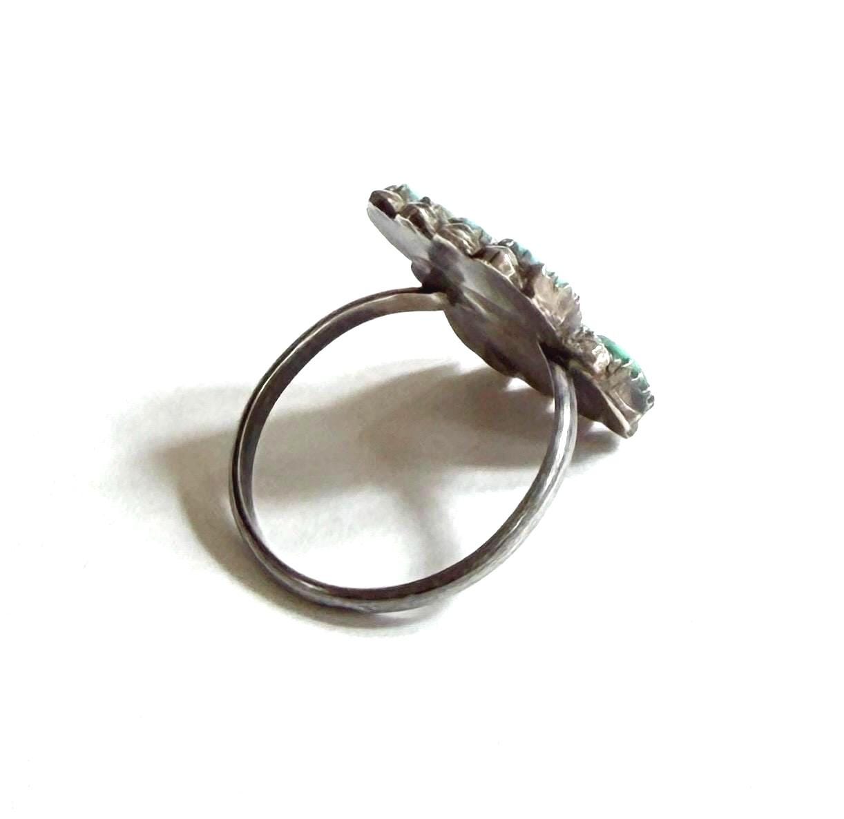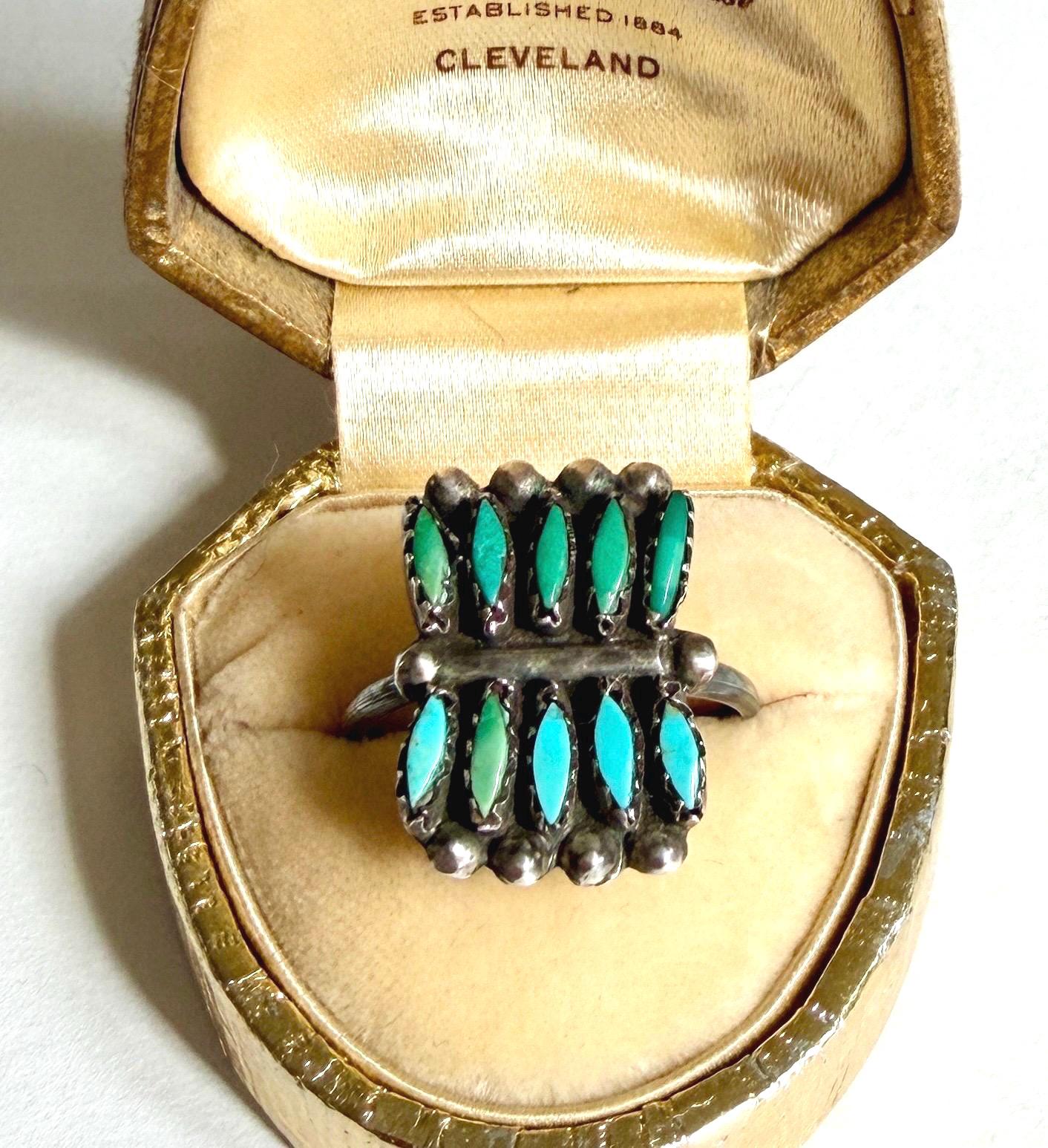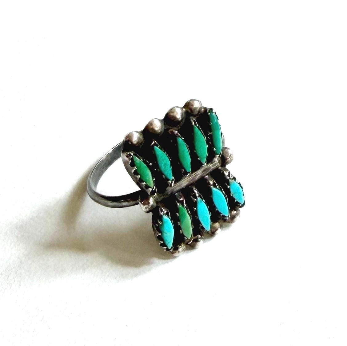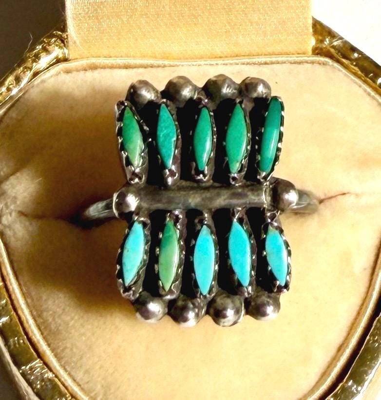 Vintage Native American Zuni sterling silver ring with needlepoint set turquoise stones set in a rare rectangular shape