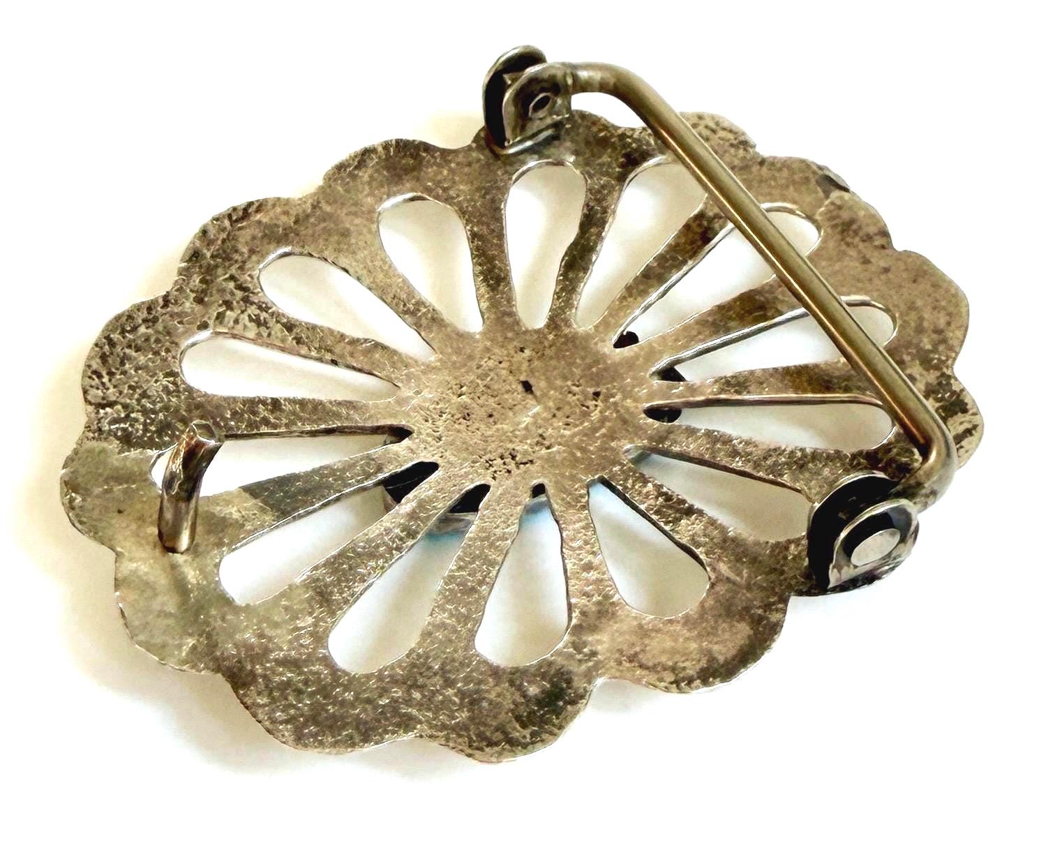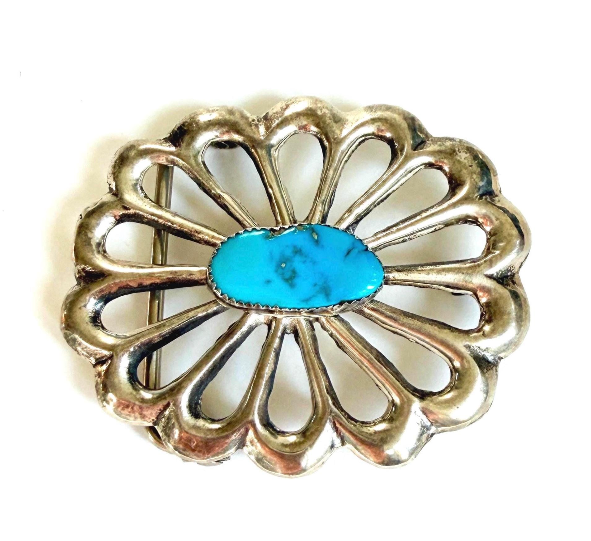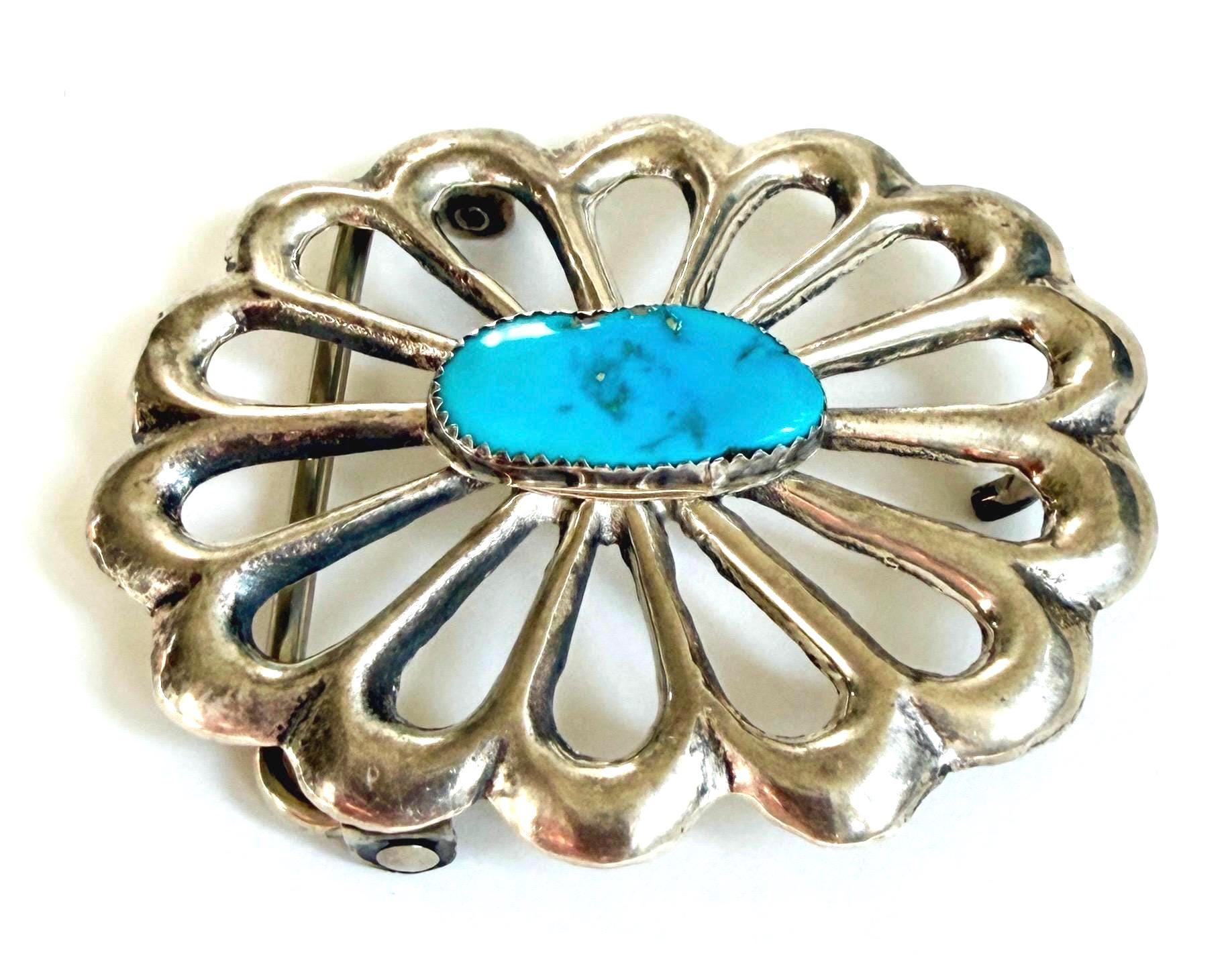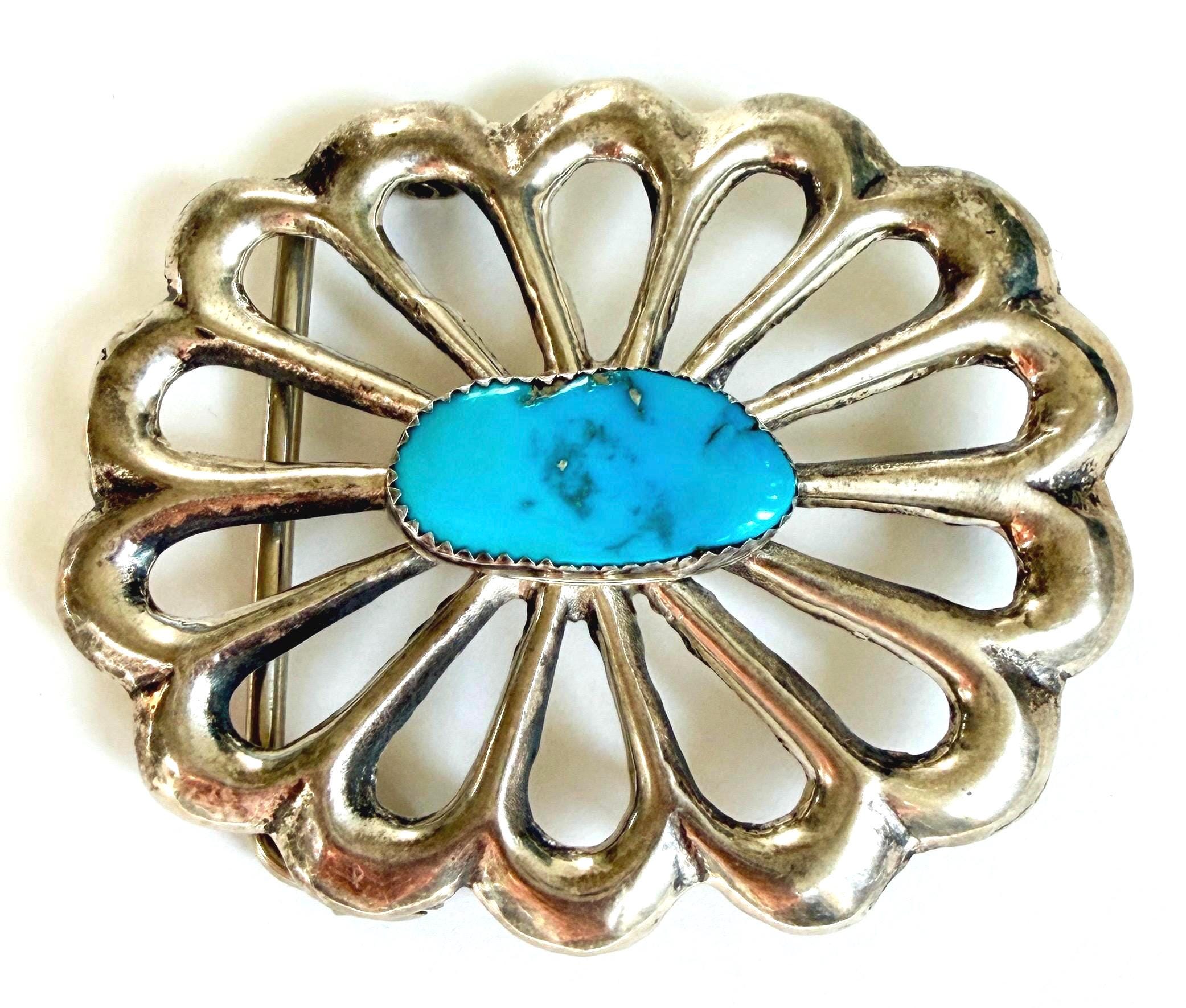 Vintage Native American Navajo cast sterling silver and pyrite-flecked Morenci turquoise belt buckle