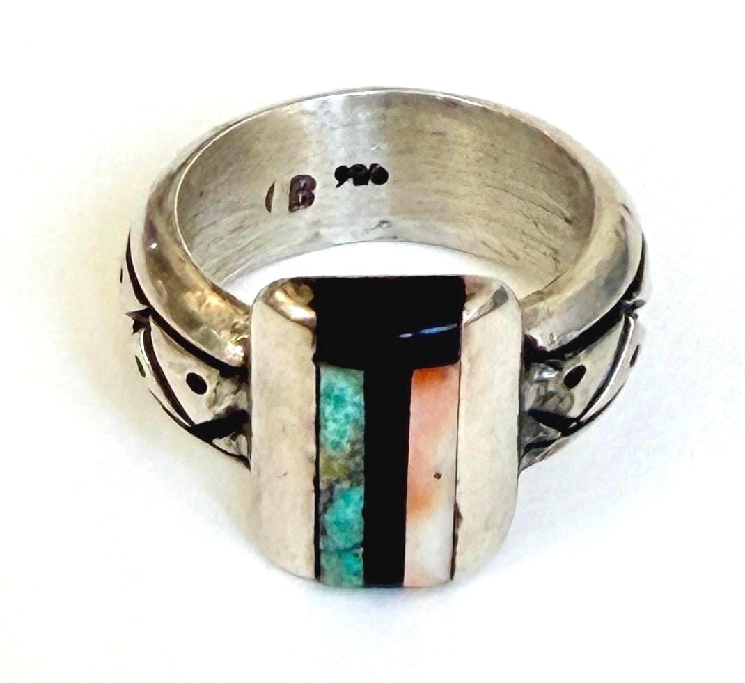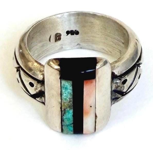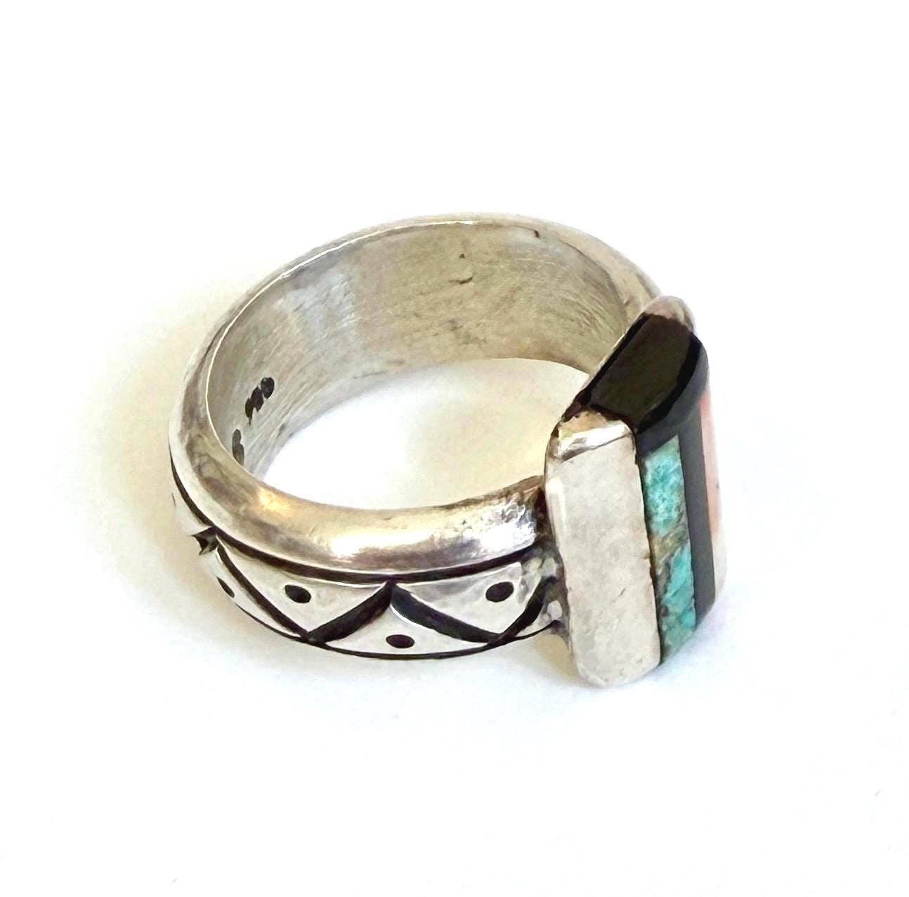 Hefty vintage Native American handmade sterling silver ring with turquoise, jet and spiny oyster flush inlaid face
