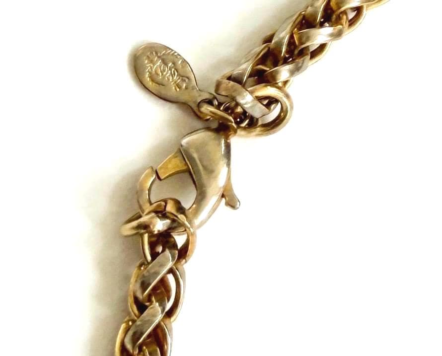 Vintage worn oval brass locket strung on a heavy gold tone metal chain