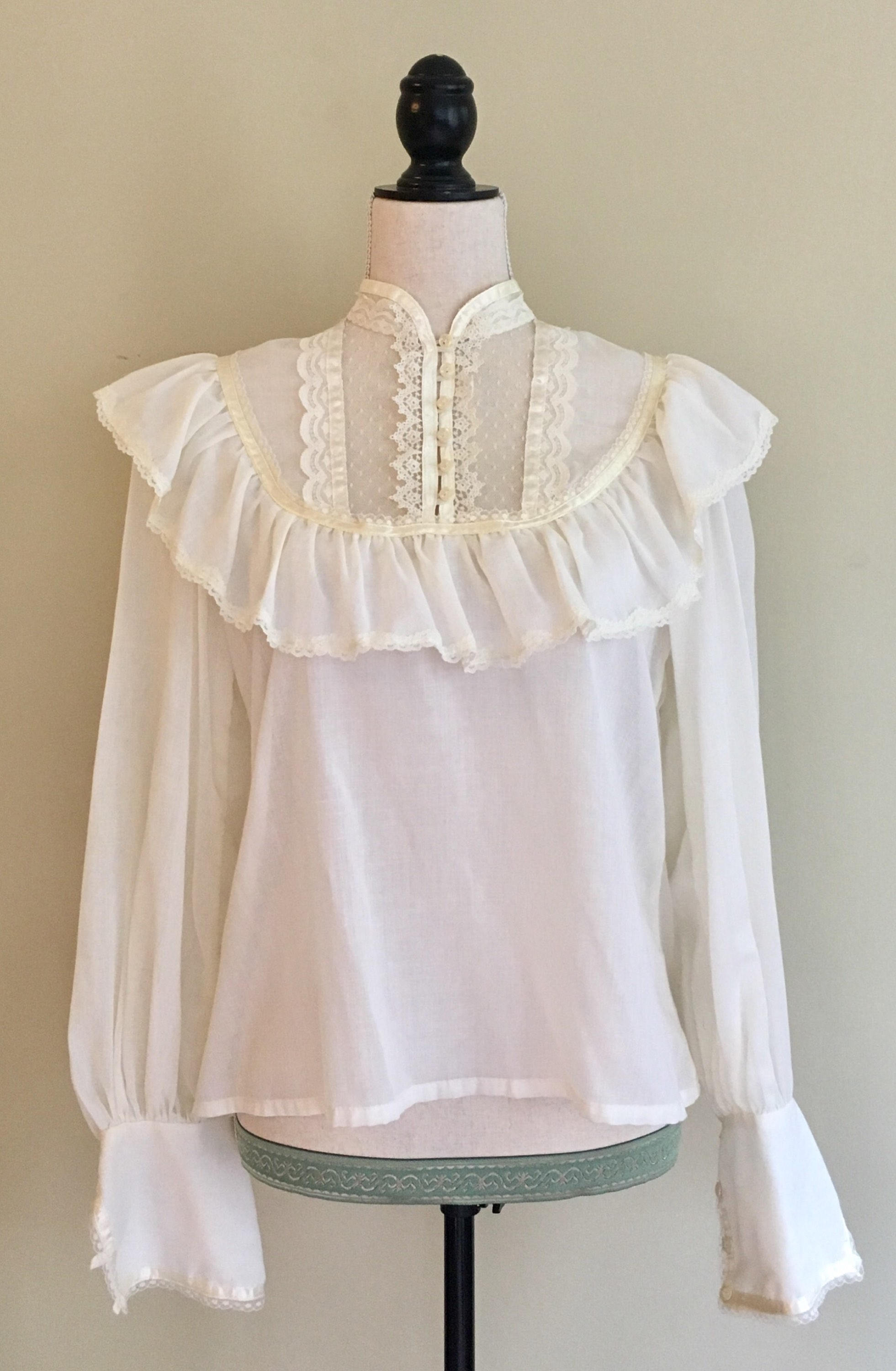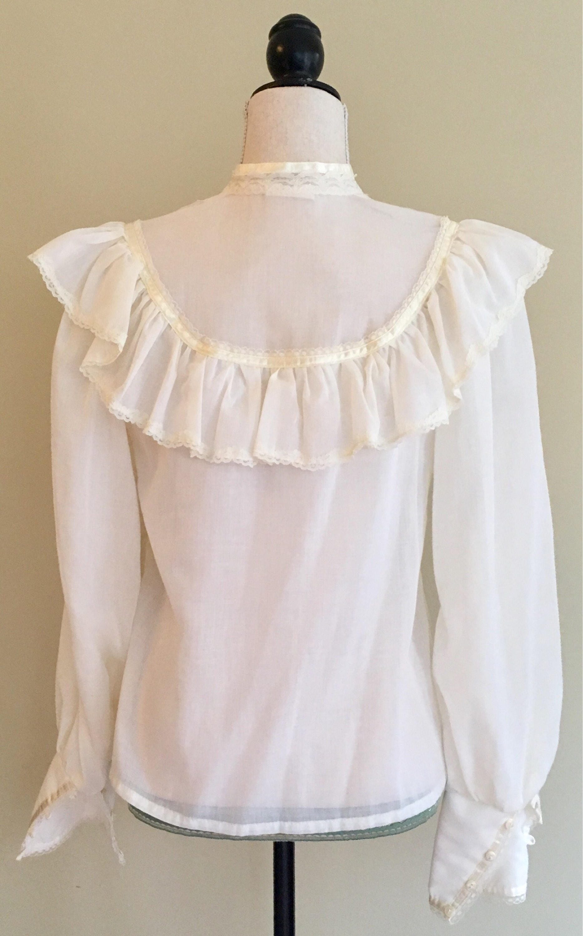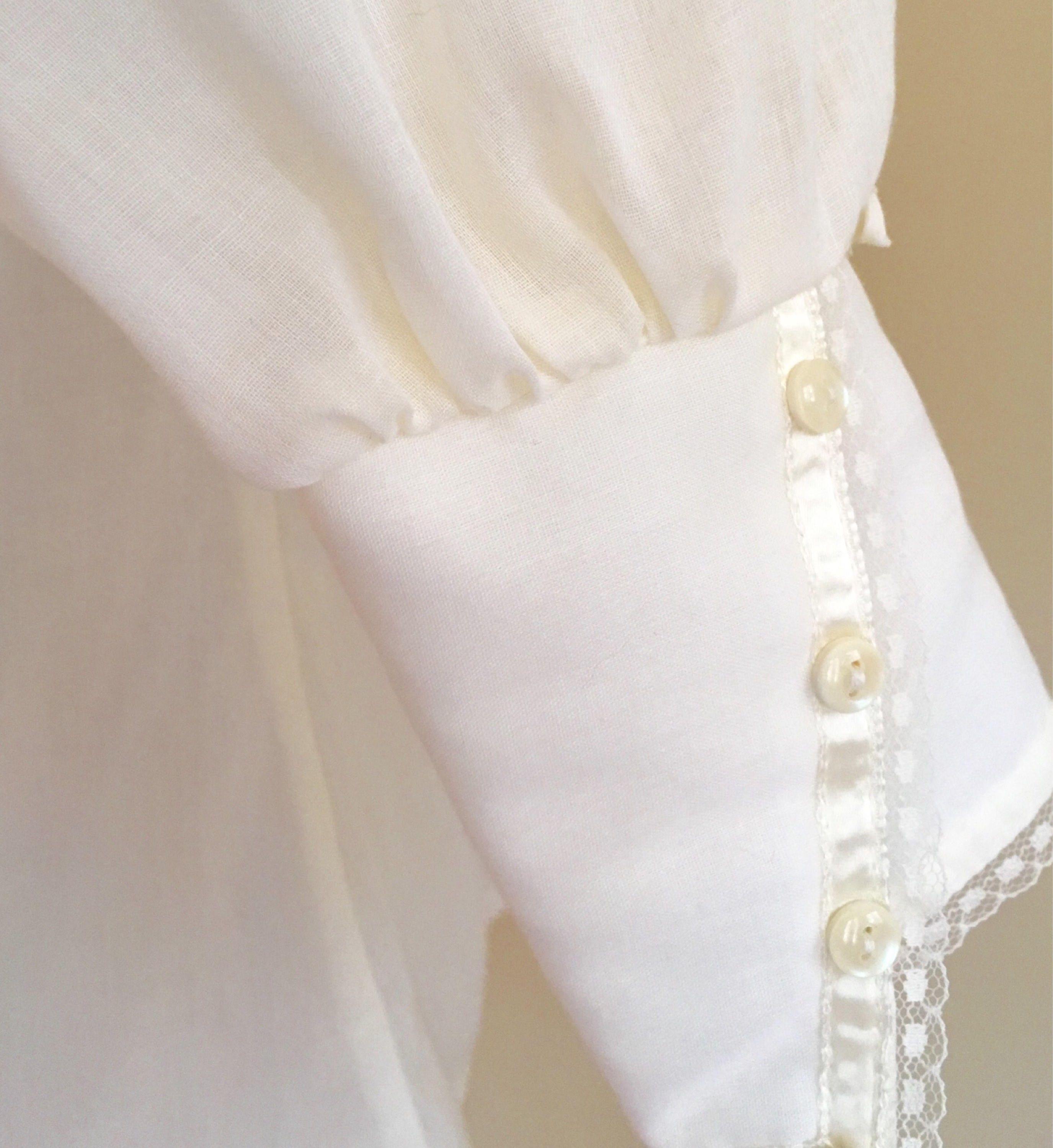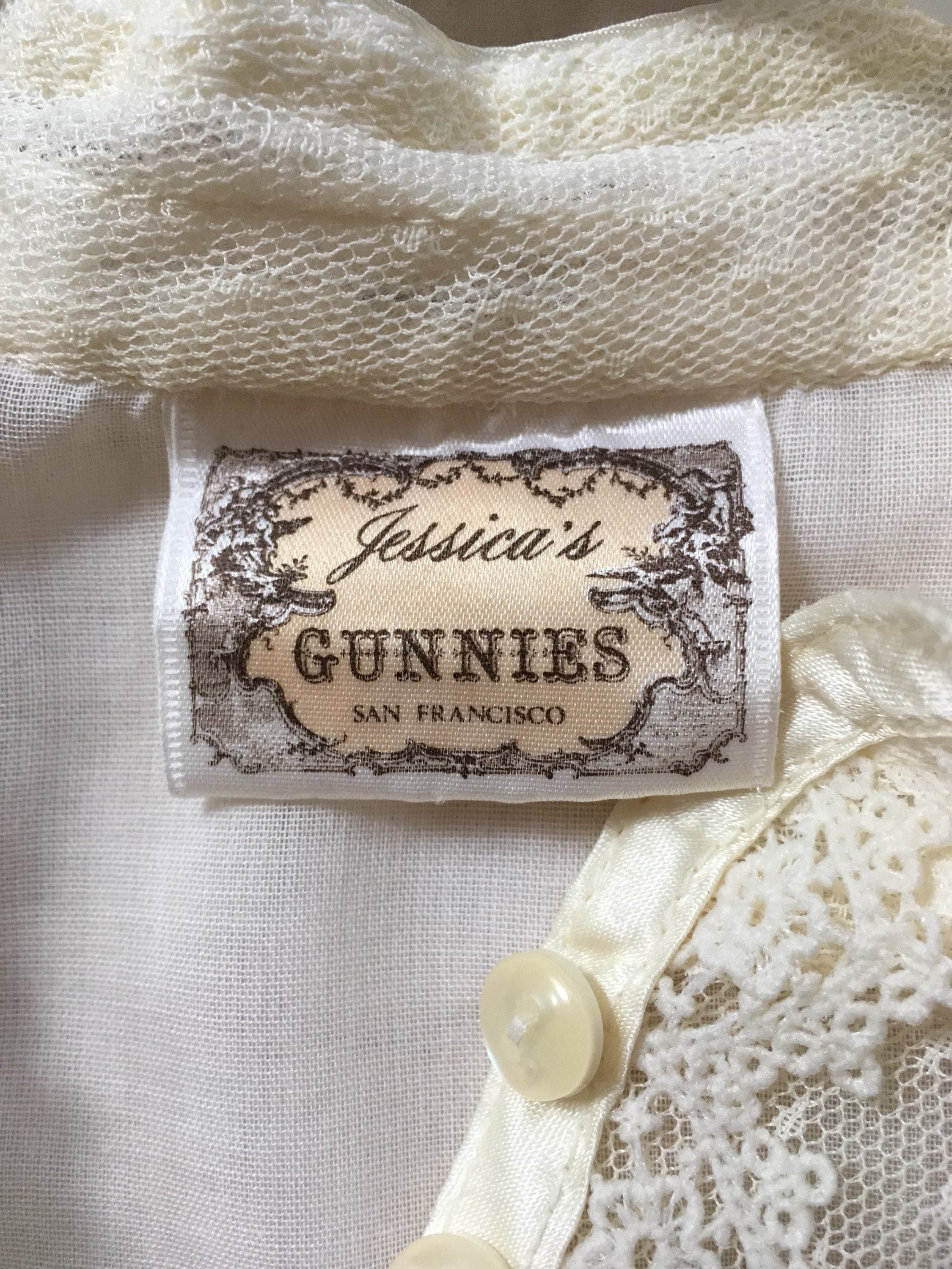 This vintage 'Jessica's Gunnies' Gunne Sax peasant blouse is a great piece to mix in with your everyday wardrobe. The pearl colored buttons, lace and satin trim epitomize the spirit of this iconic 70's brand.
