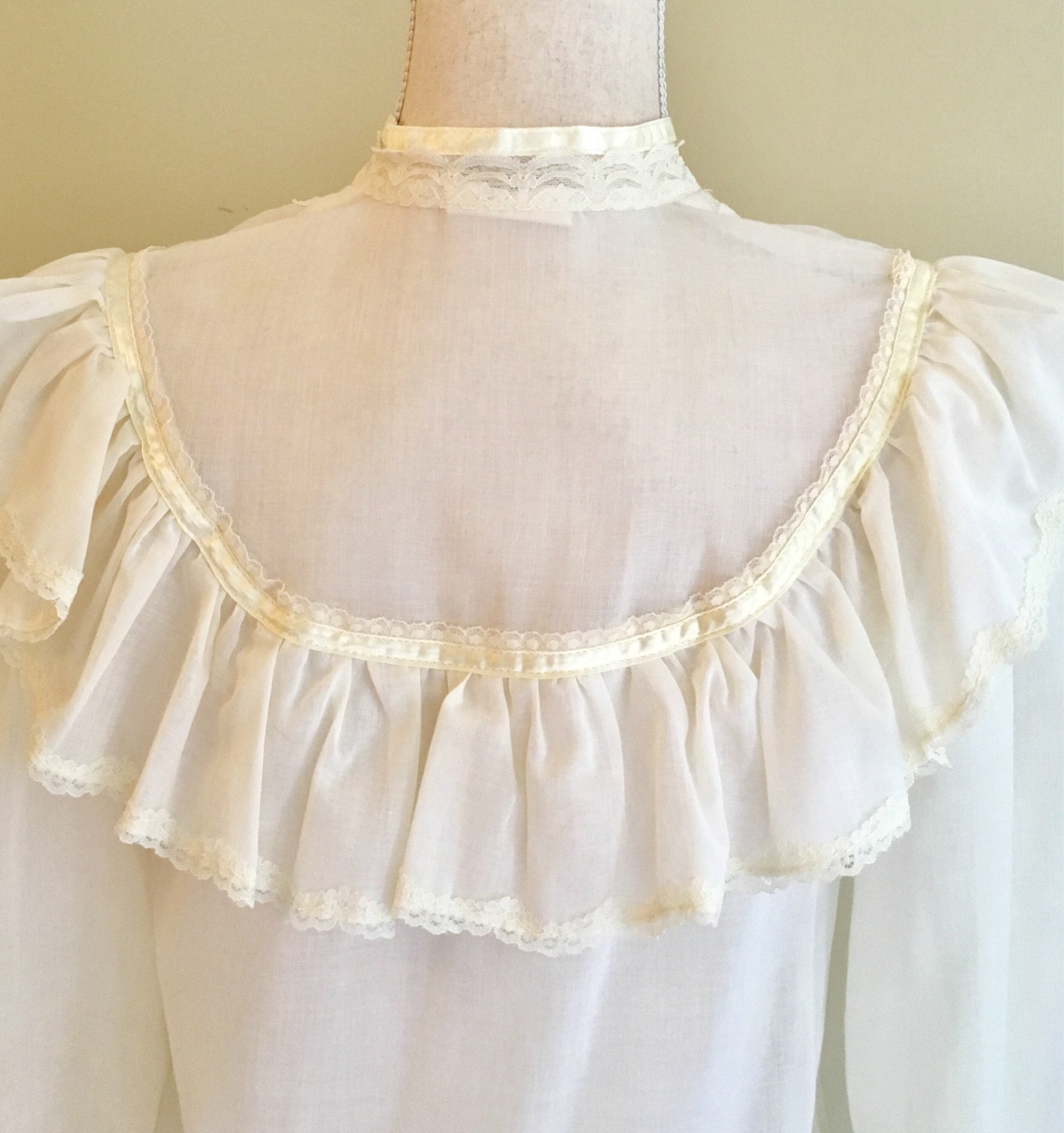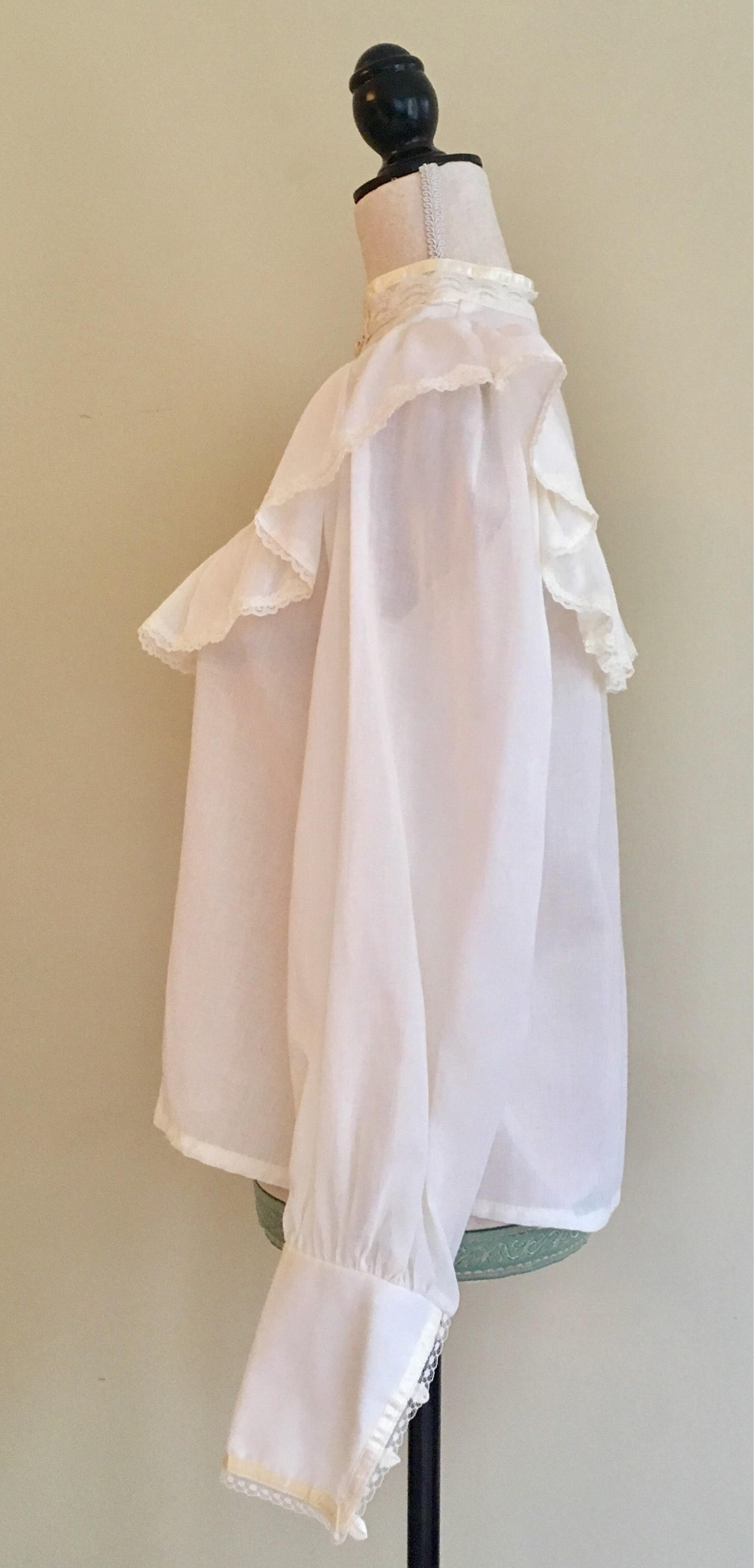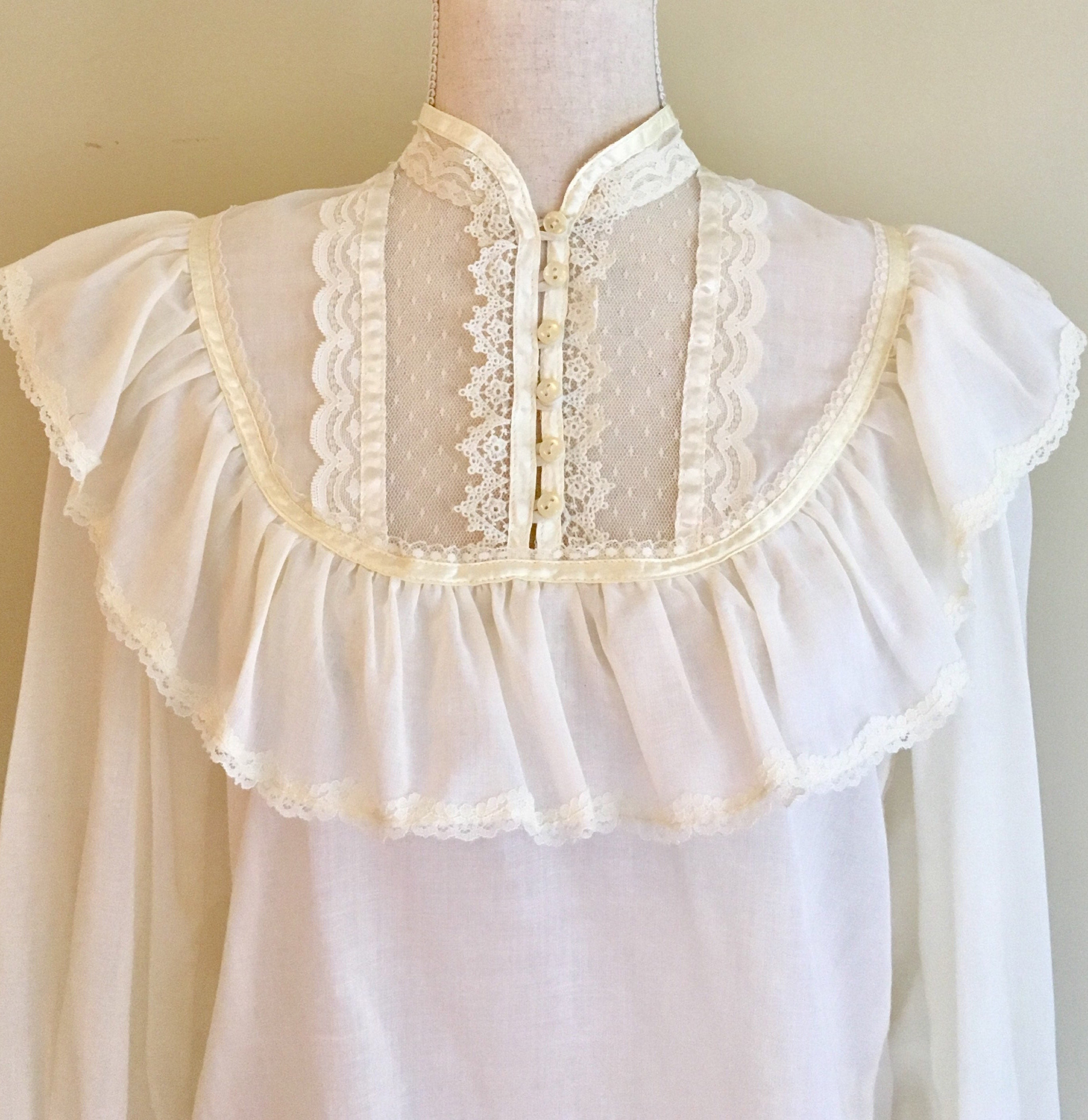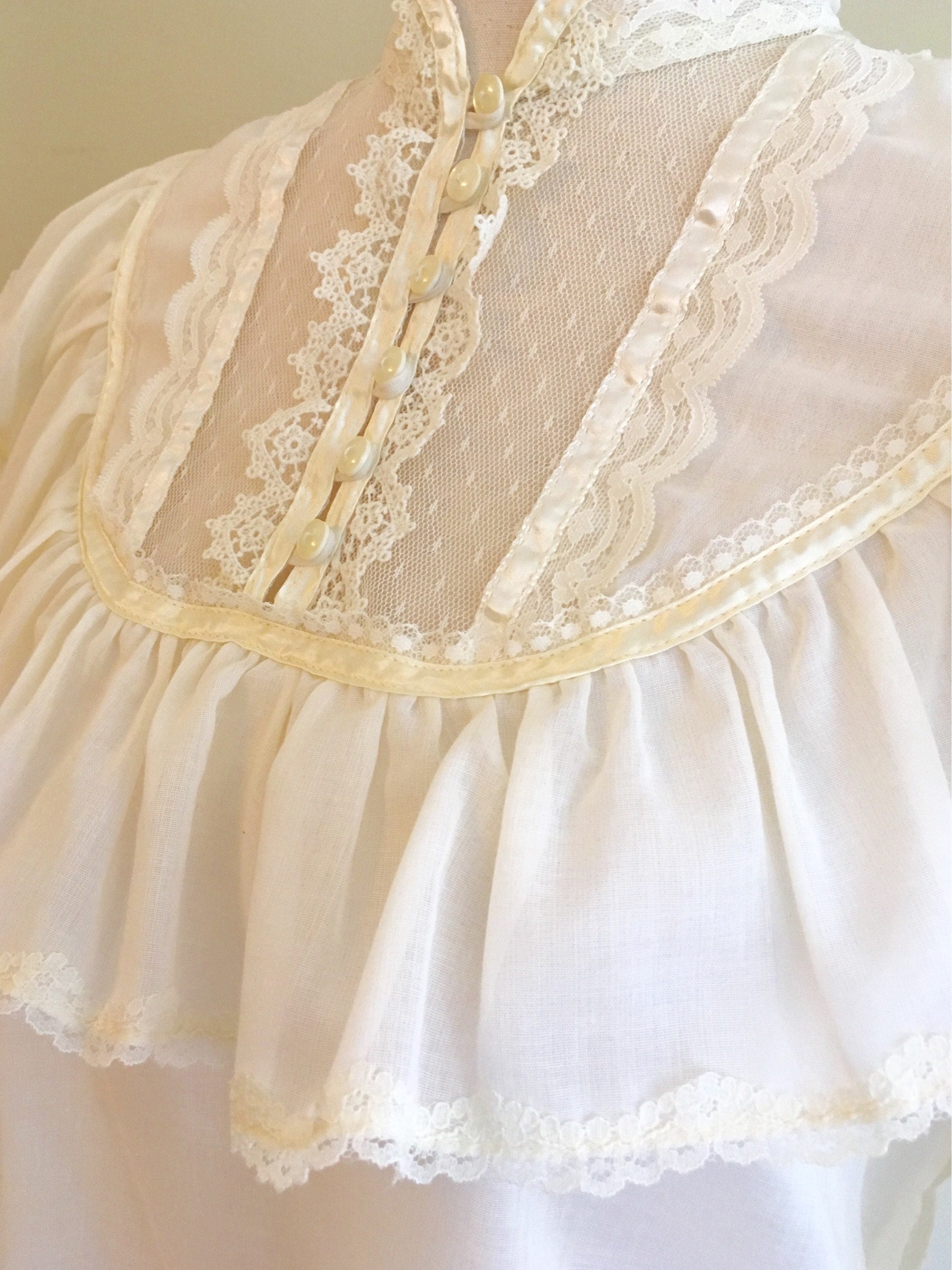 This vintage 'Jessica's Gunnies' Gunne Sax peasant blouse is a great piece to mix in with your everyday wardrobe. The pearl colored buttons, lace and satin trim epitomize the spirit of this iconic 70's brand.
