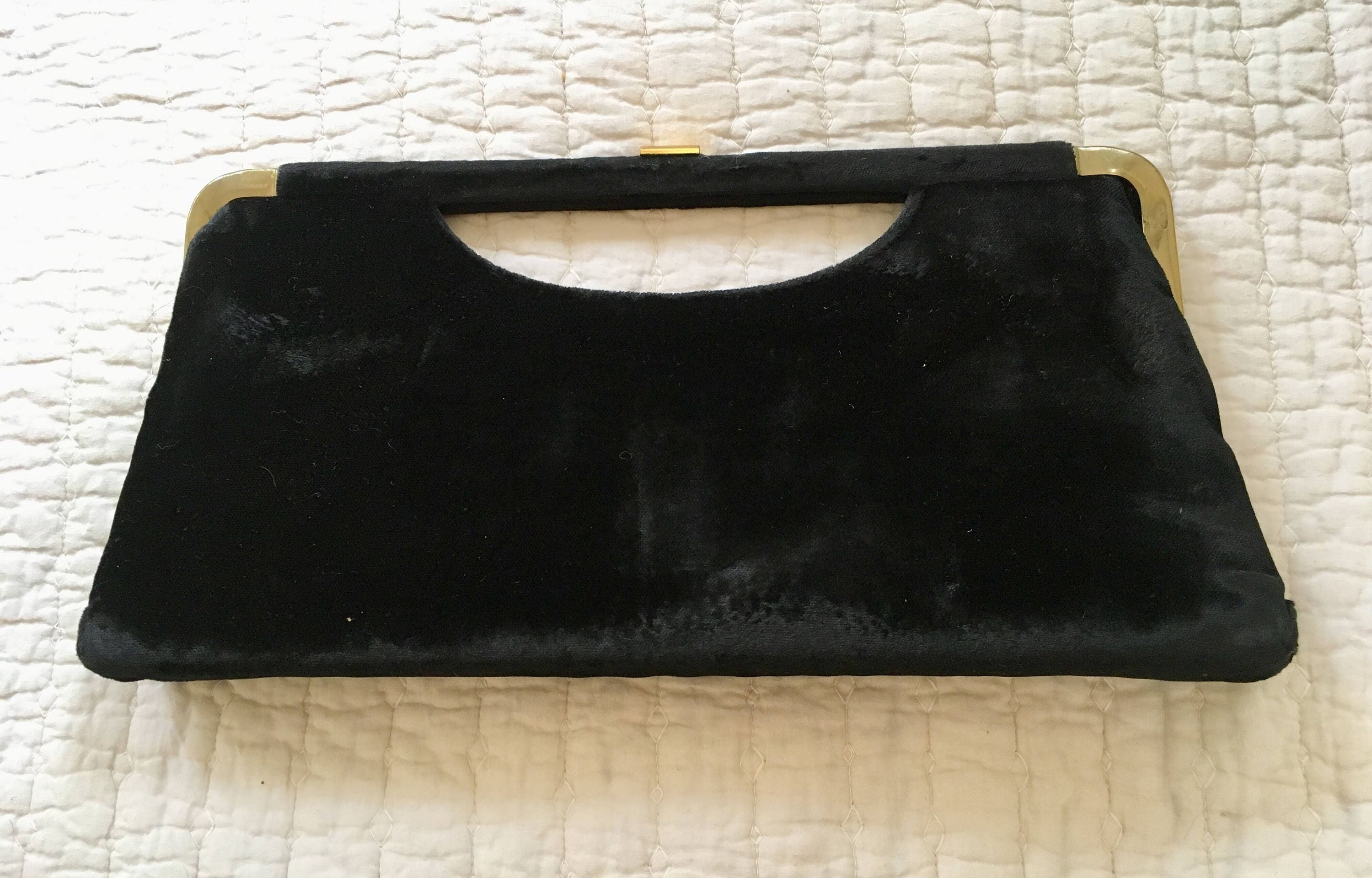 Gorgeous vintage 1950s black velvet clutch. Gold-tone frame and clasp with black interior lining stamped "Dover - Made in the USA"