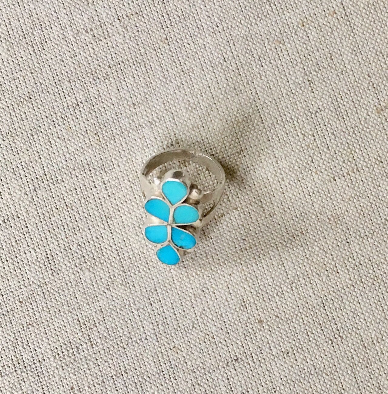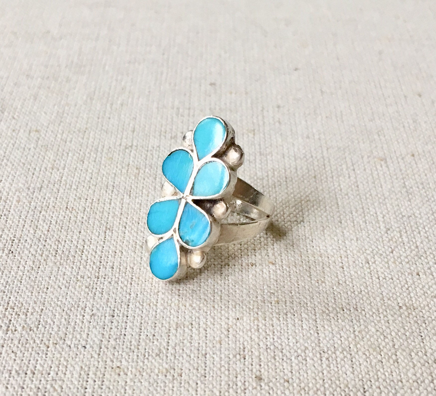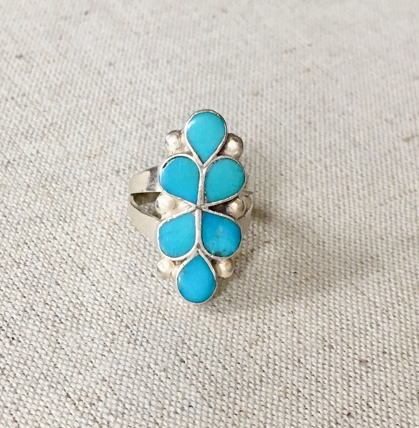 This lovely Native American Zuni flower ring is beautifully crafted! Six teardrop shaped inlay turquoise stones set in a unique floral/laurel design.