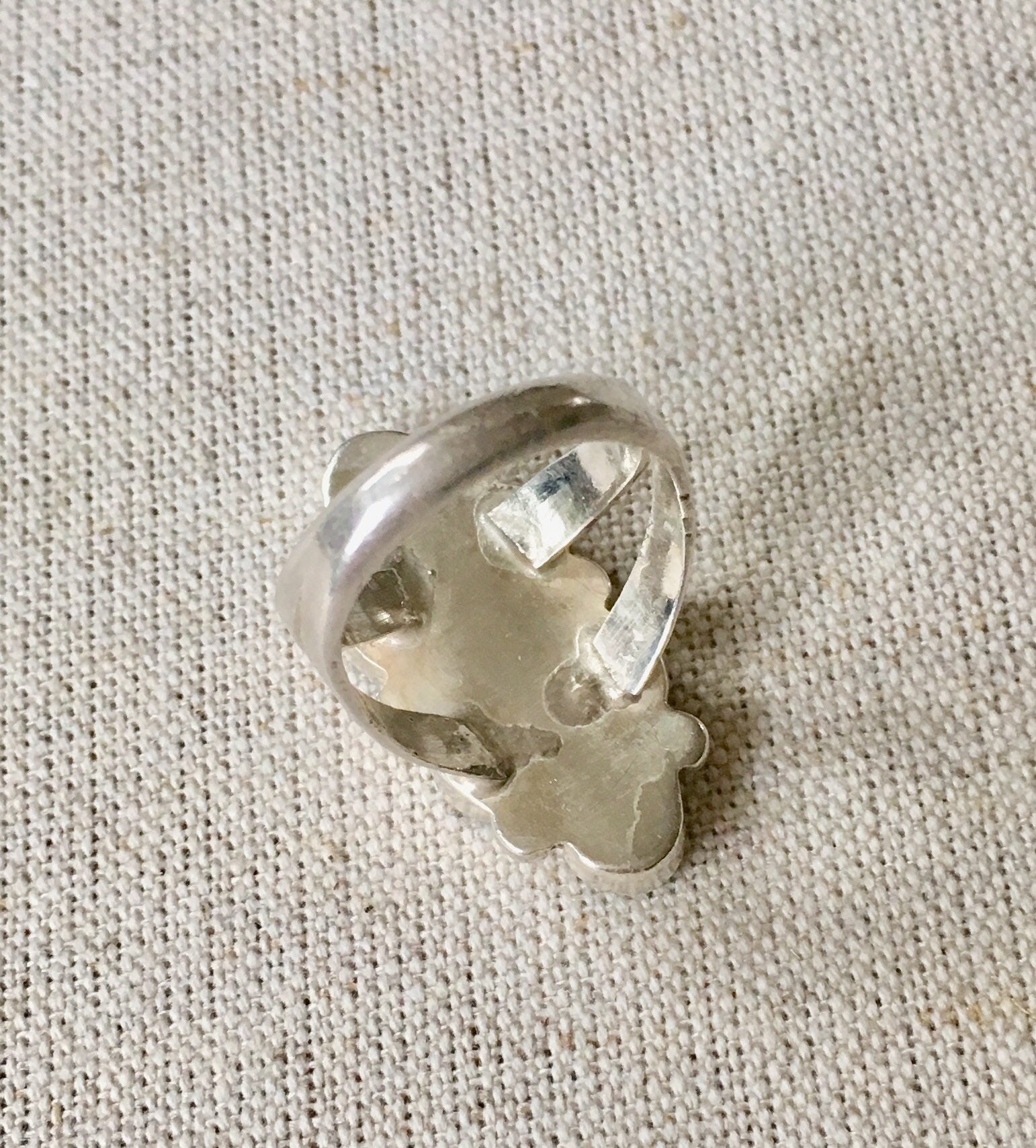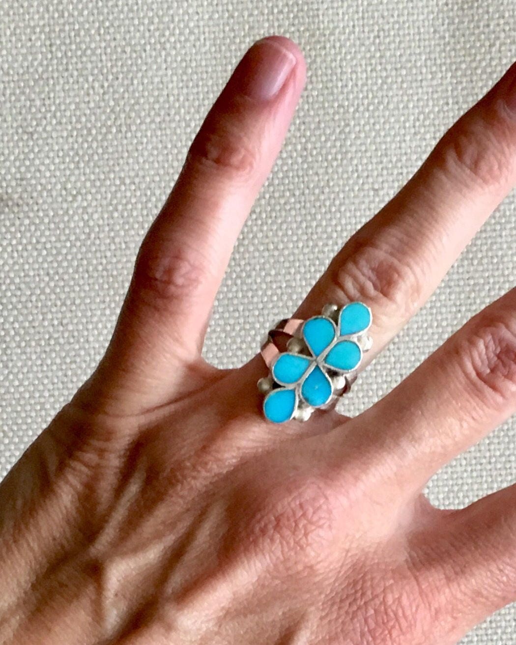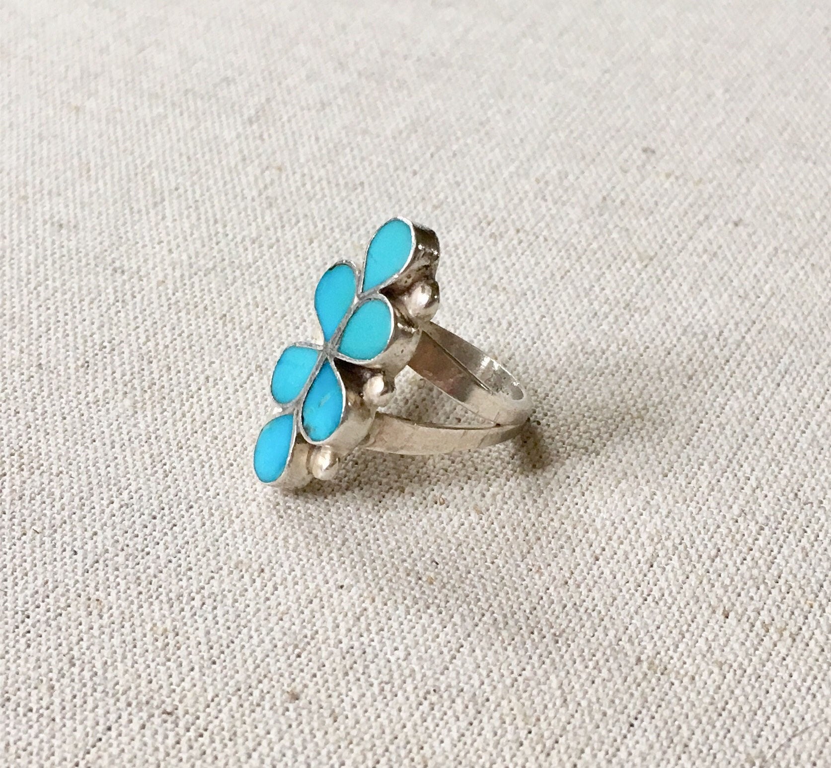 This lovely Native American Zuni flower ring is beautifully crafted! Six teardrop shaped inlay turquoise stones set in a unique floral/laurel design.