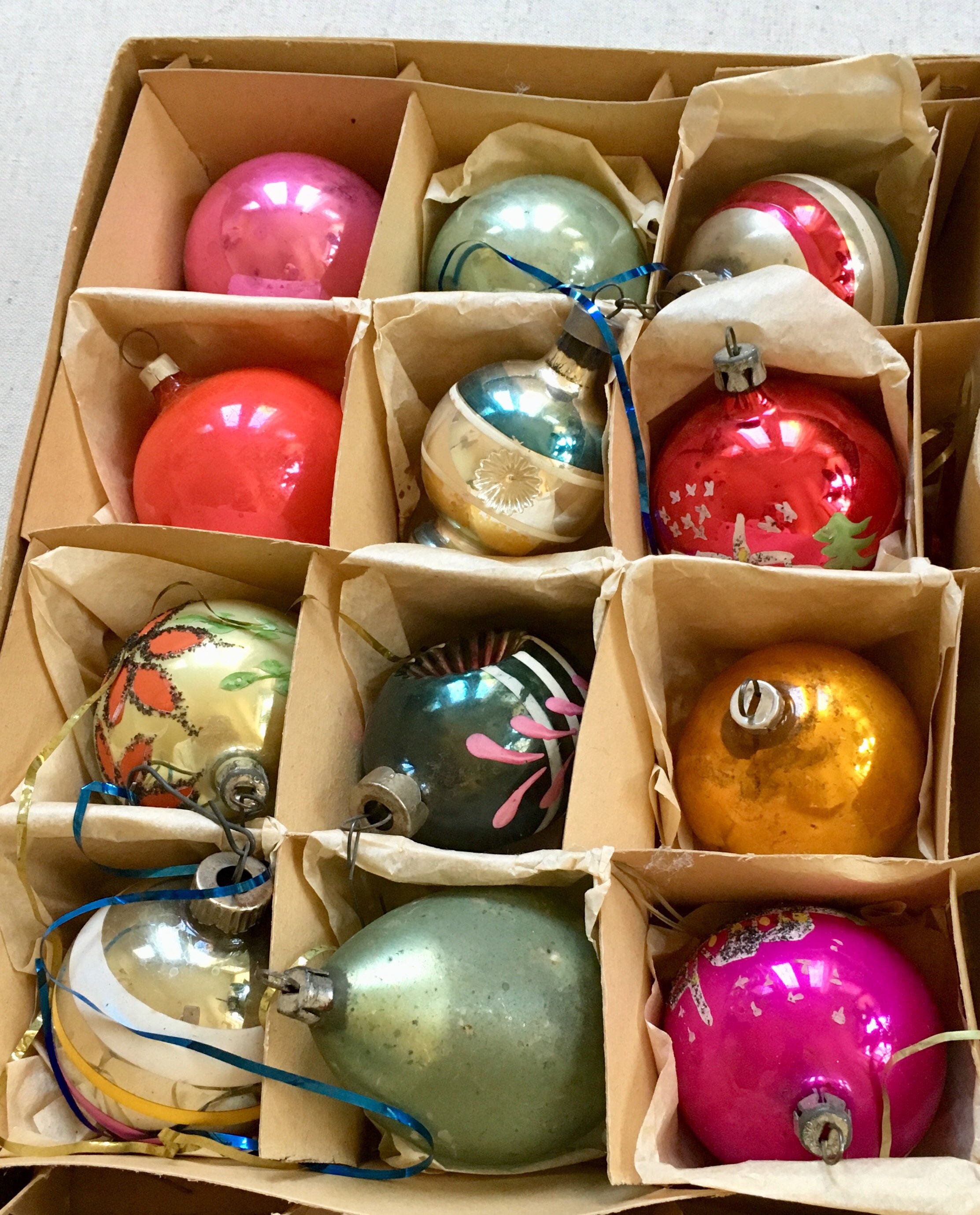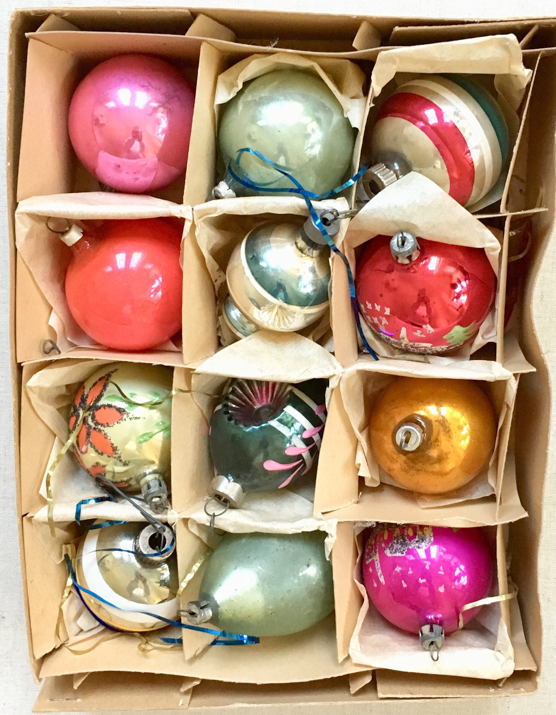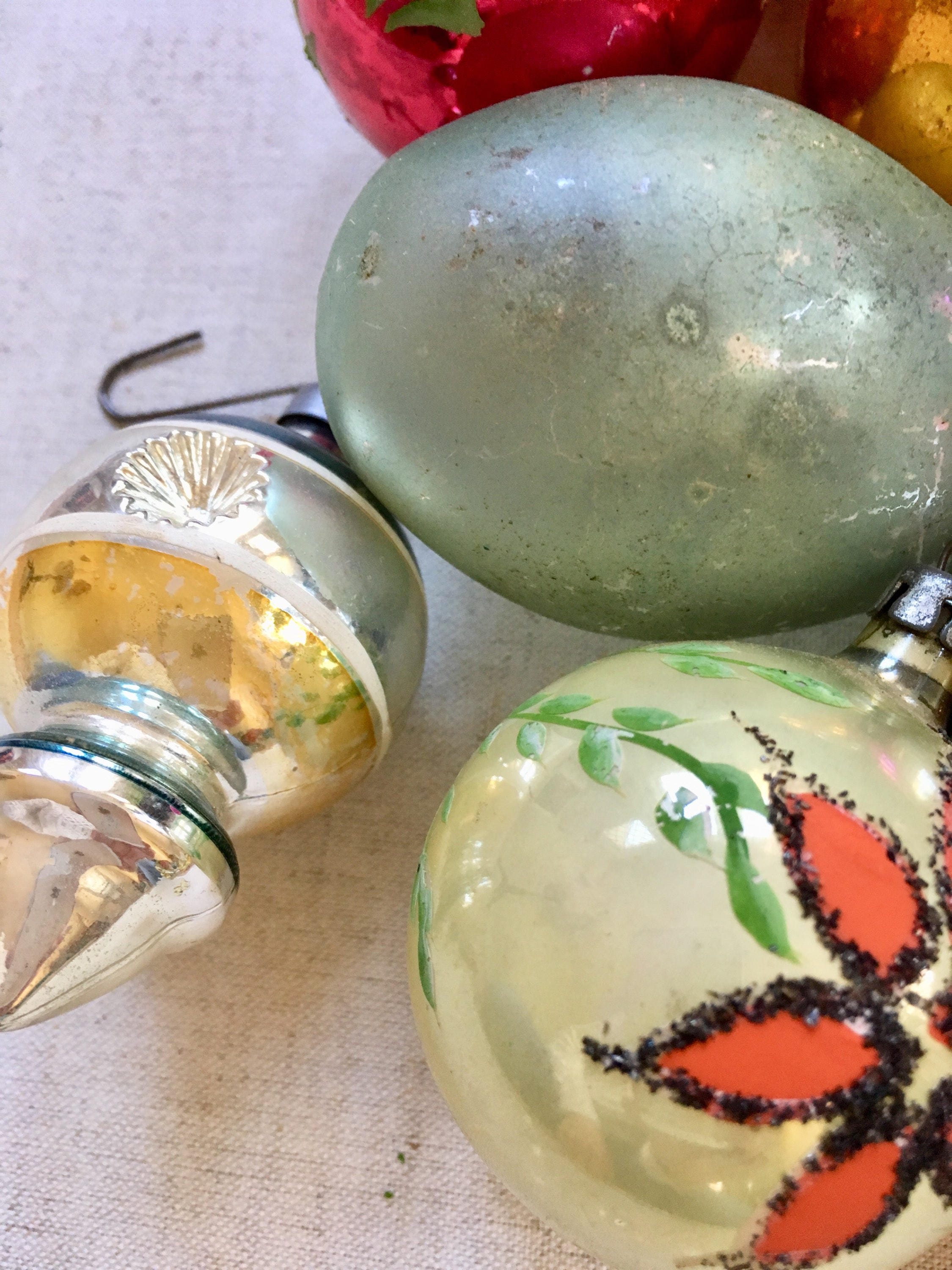 Vintage ornaments are in pre-owned condition with "flaws" such as inconsistent color, worn-off paint and tarnish patina.