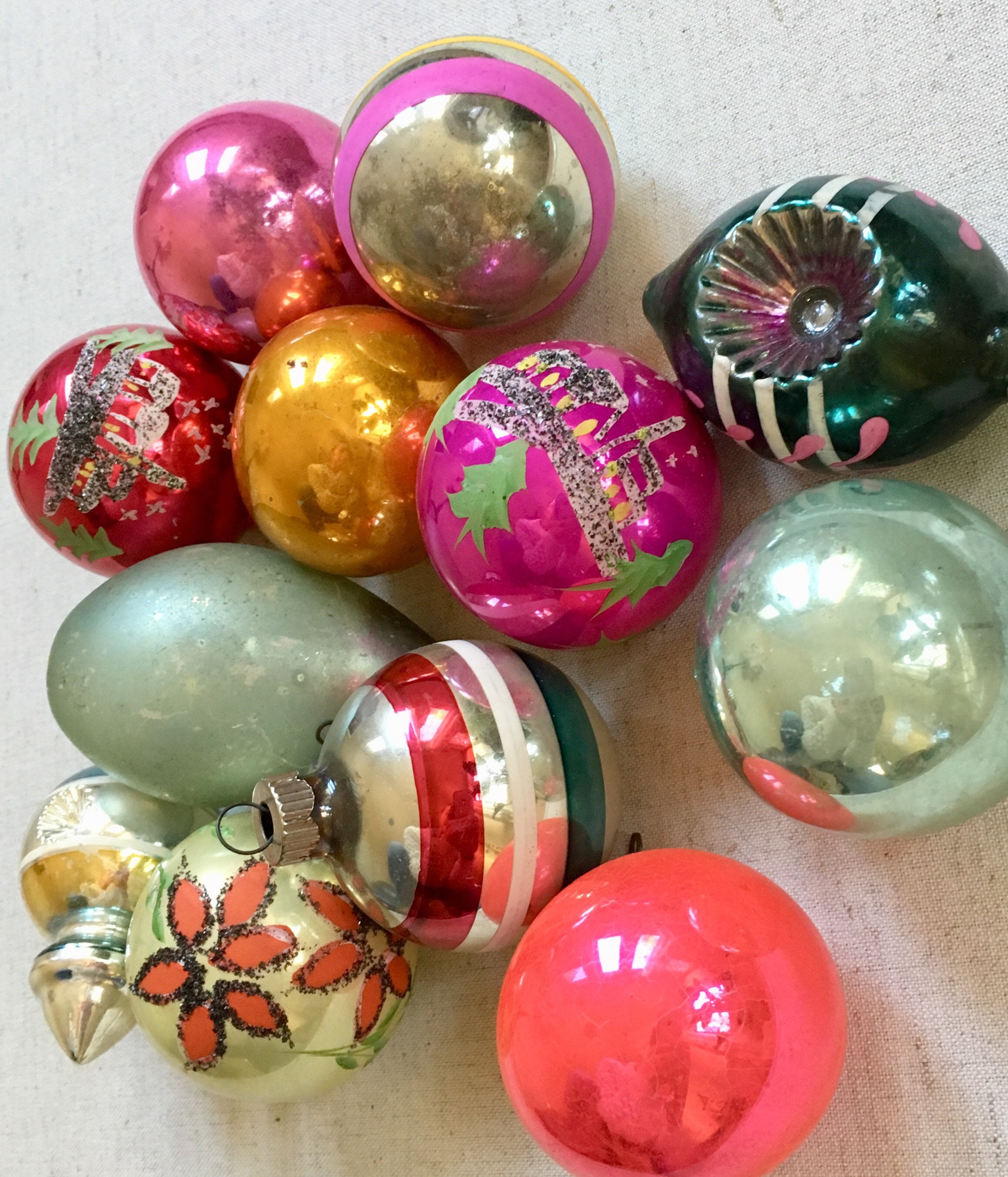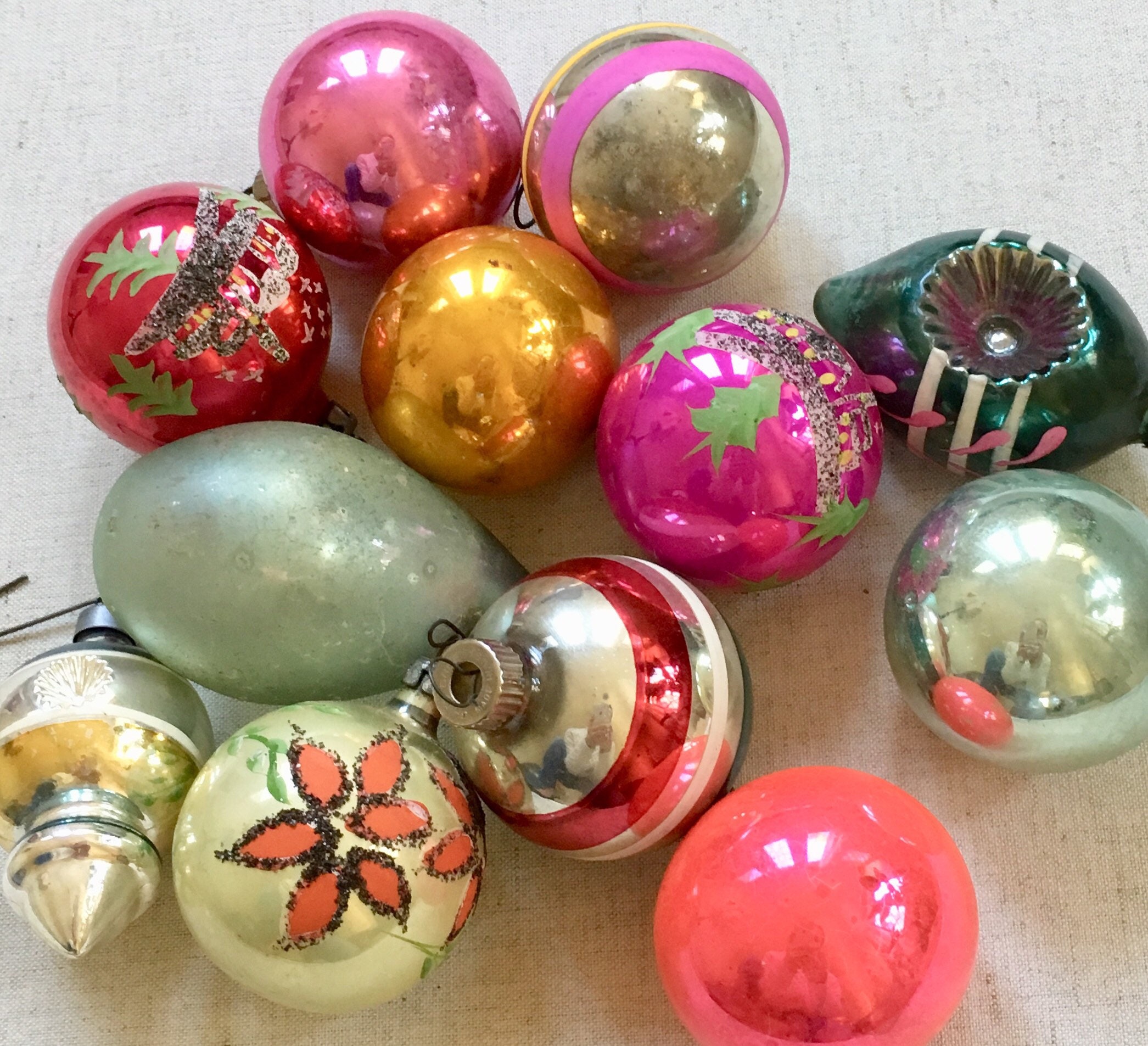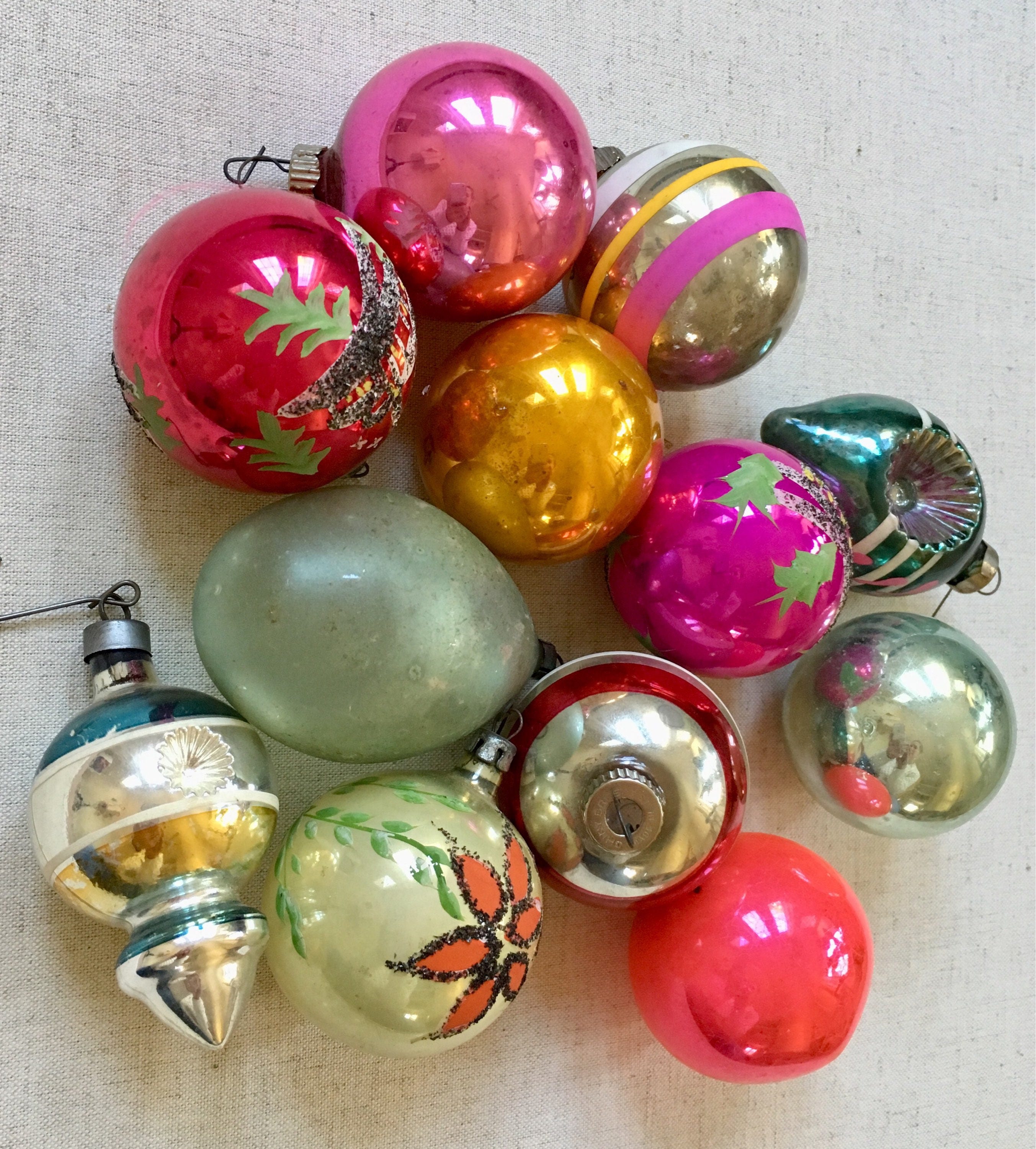 Vintage ornaments are in pre-owned condition with "flaws" such as inconsistent color, worn-off paint and tarnish patina.