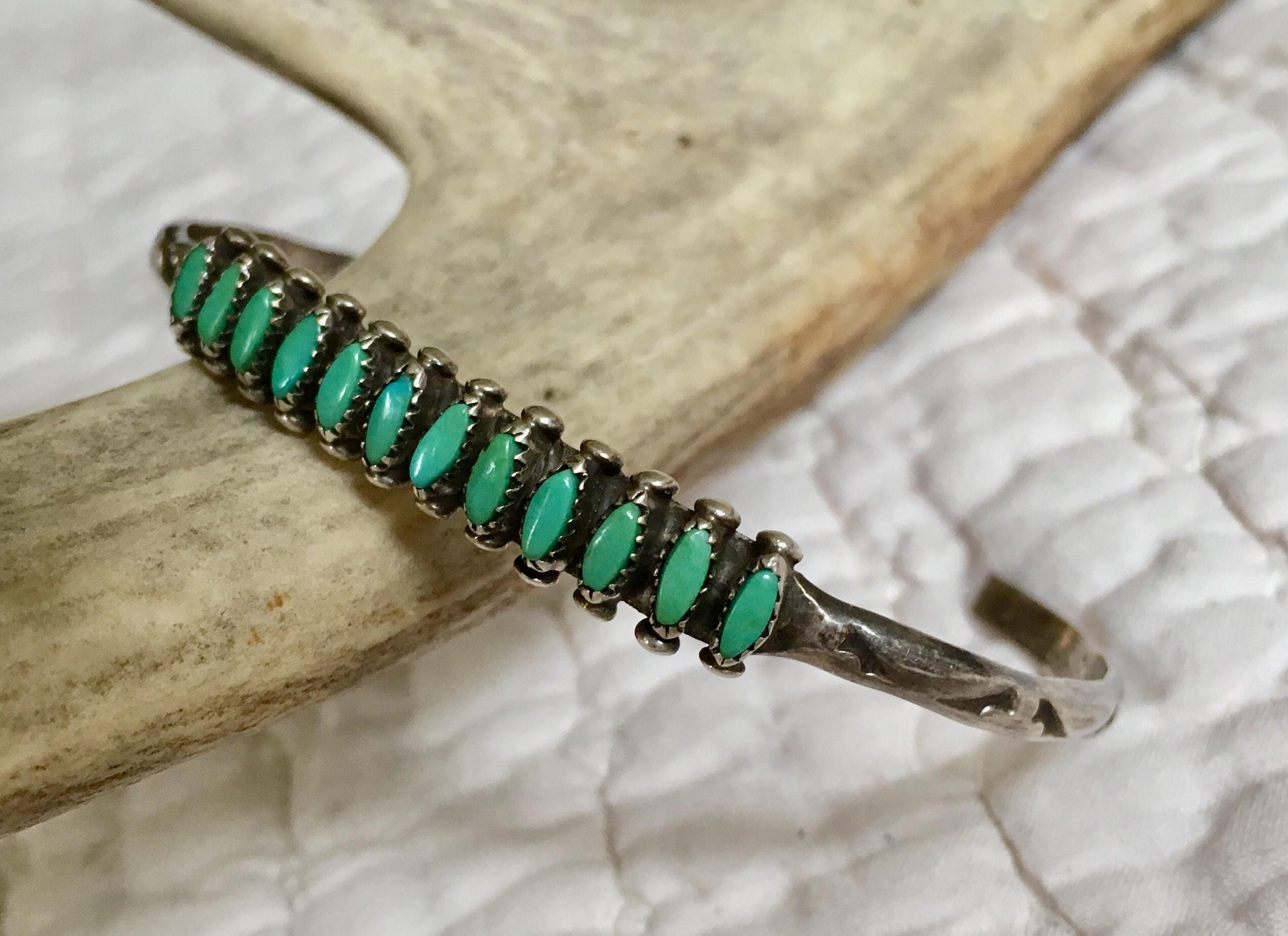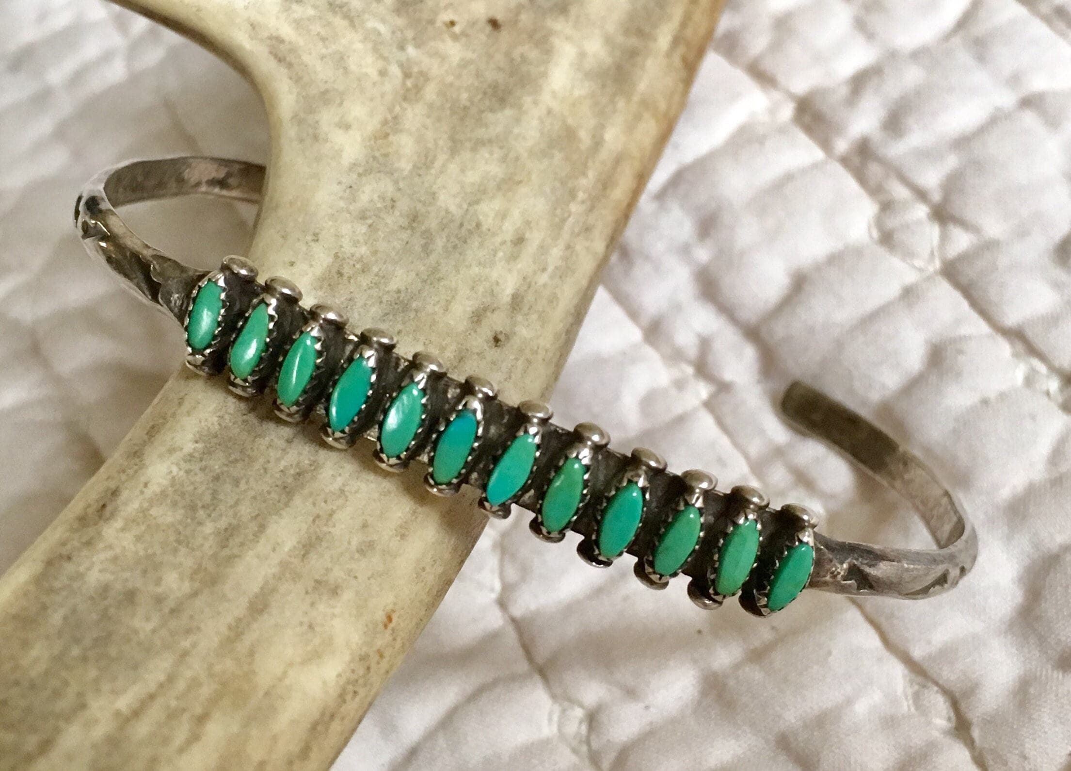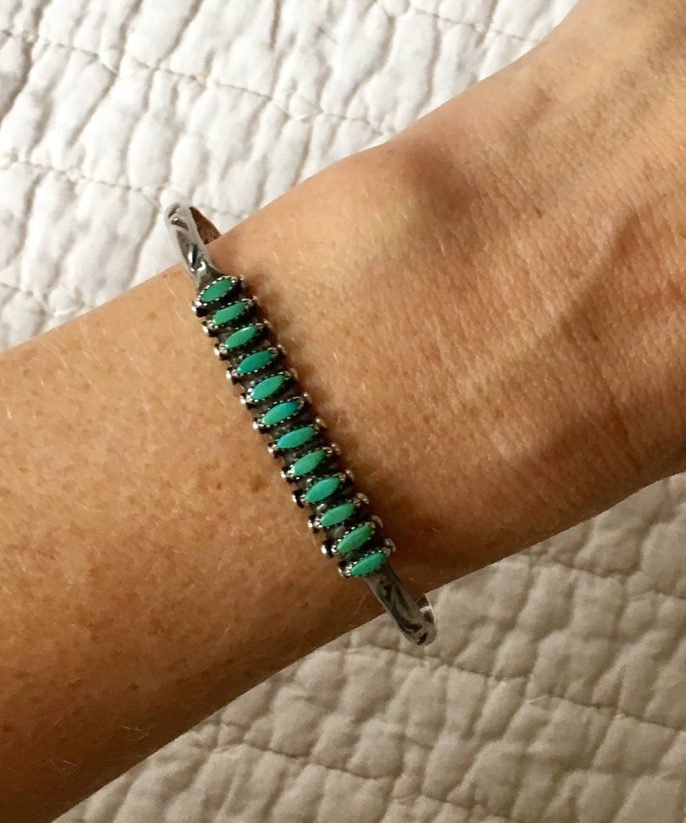 This sterling silver Zuni Needlepoint cuff bracelet is delicate and pretty with engraving on the sides of the band and 12 meticulously inset turquoise stones.